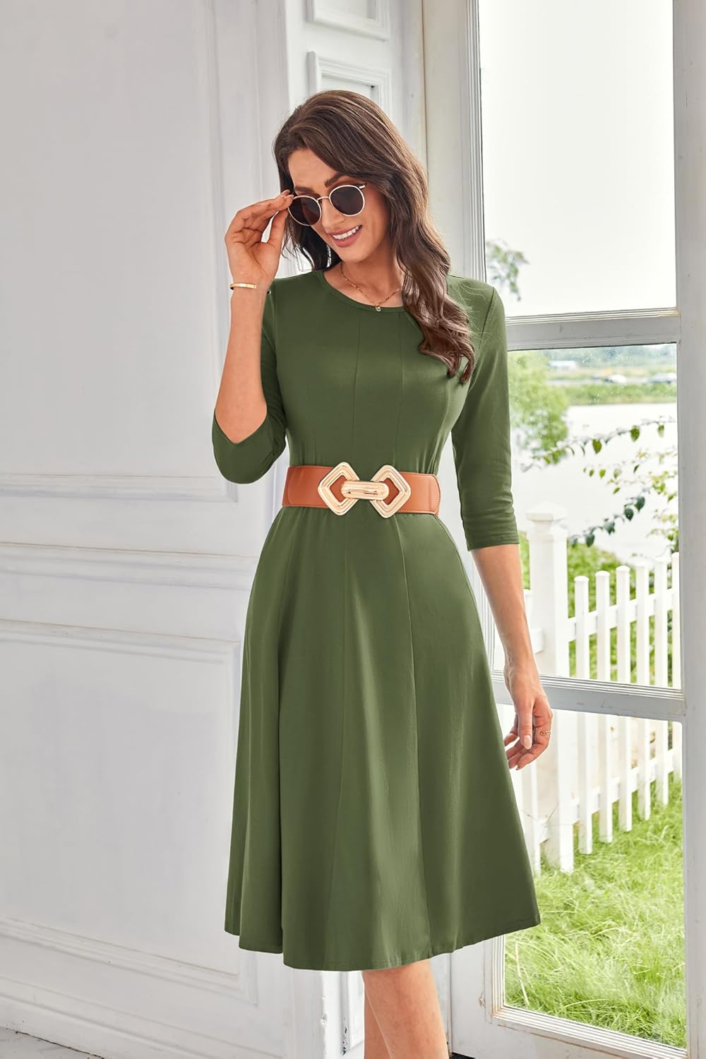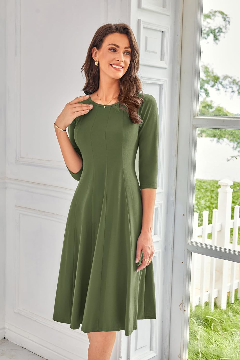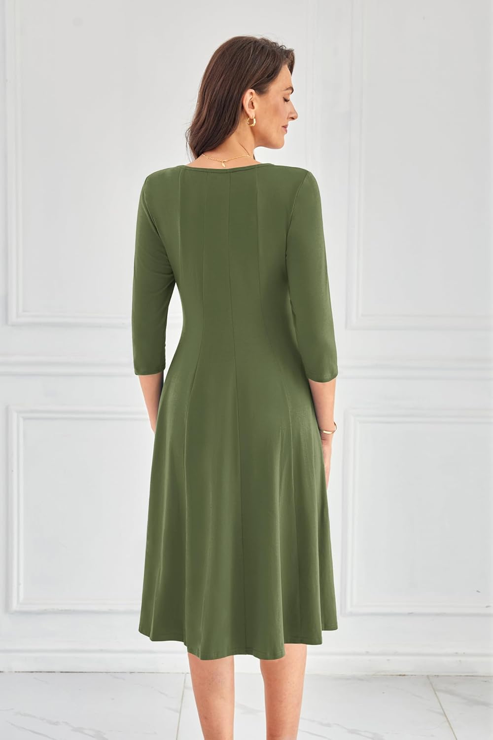 imageGRACE KARIN Womens 2024 Fall Trendy Crew Neck 34 Sleeve A Line Flowy Casual Midi Dress with PocketsArmy Green
