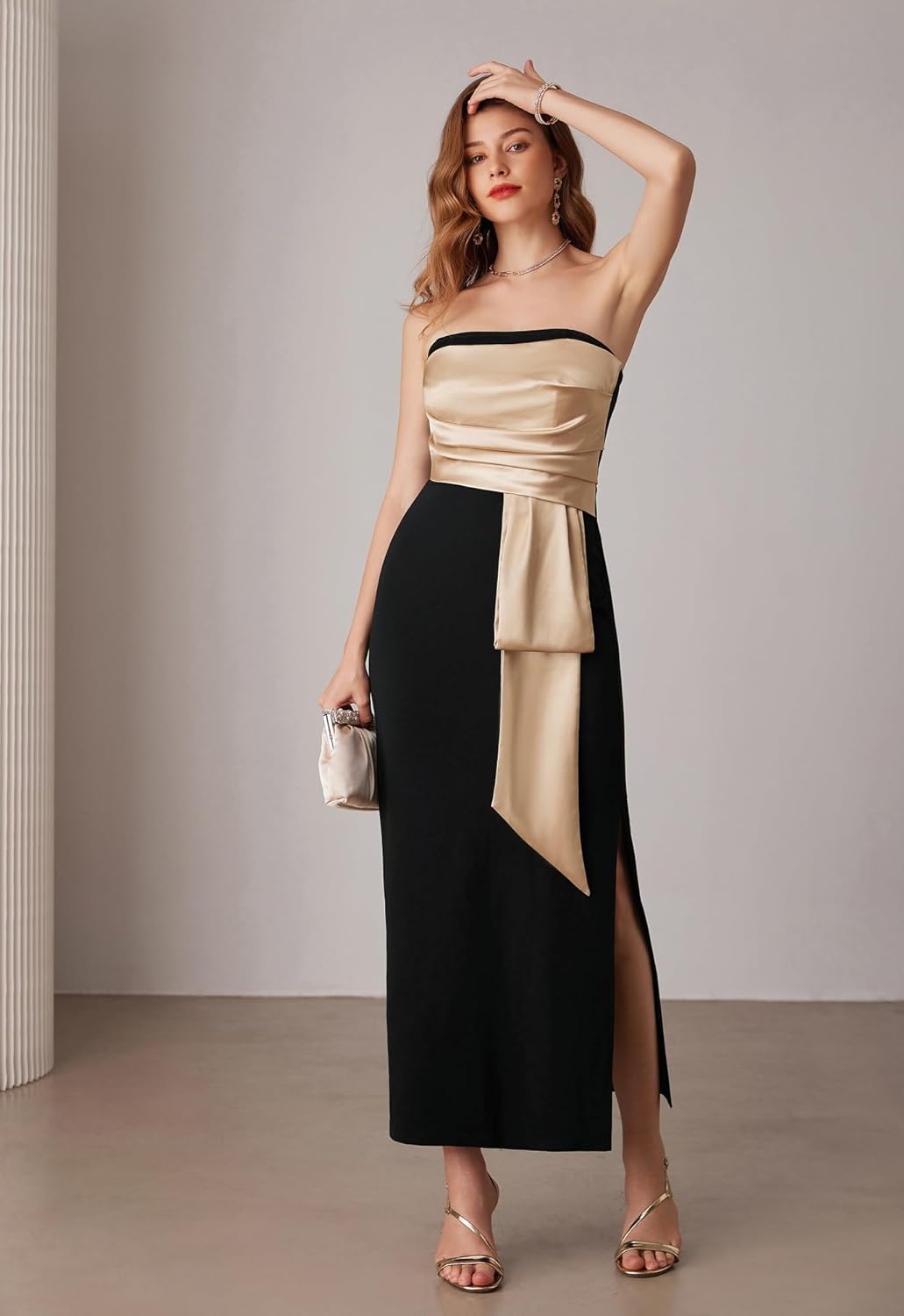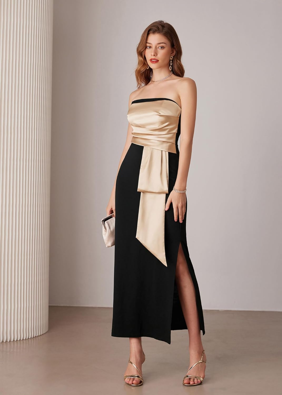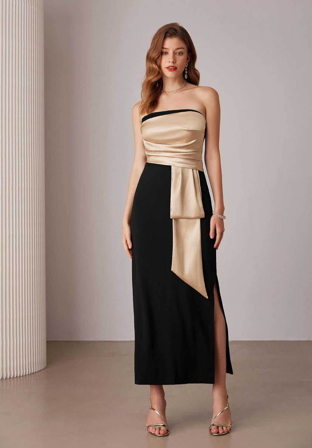 GRACE KARIN Women’s 2024 Satin Strapless Dress Color Block Bodycon Party Dress with Side Slit(Black Apricot)