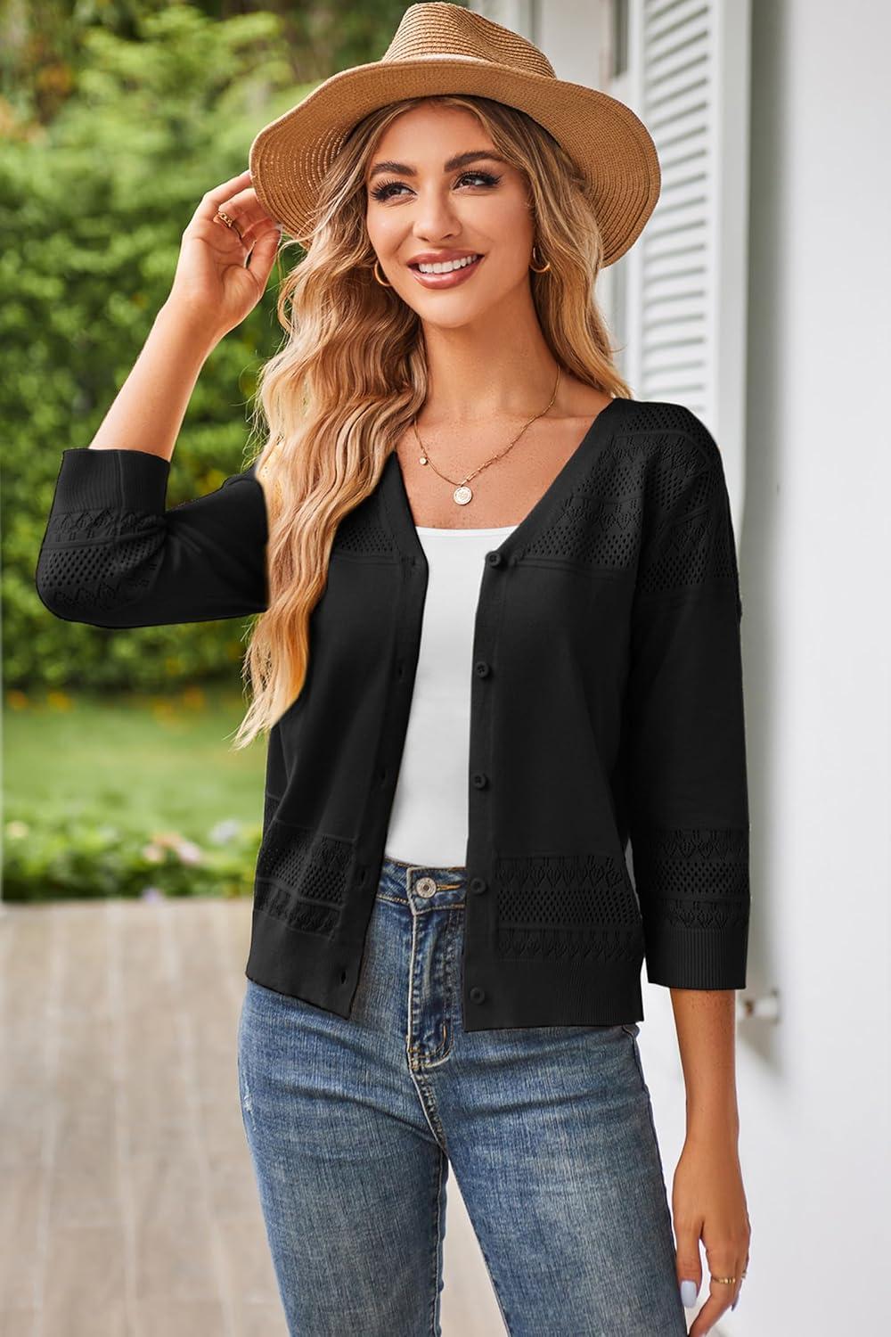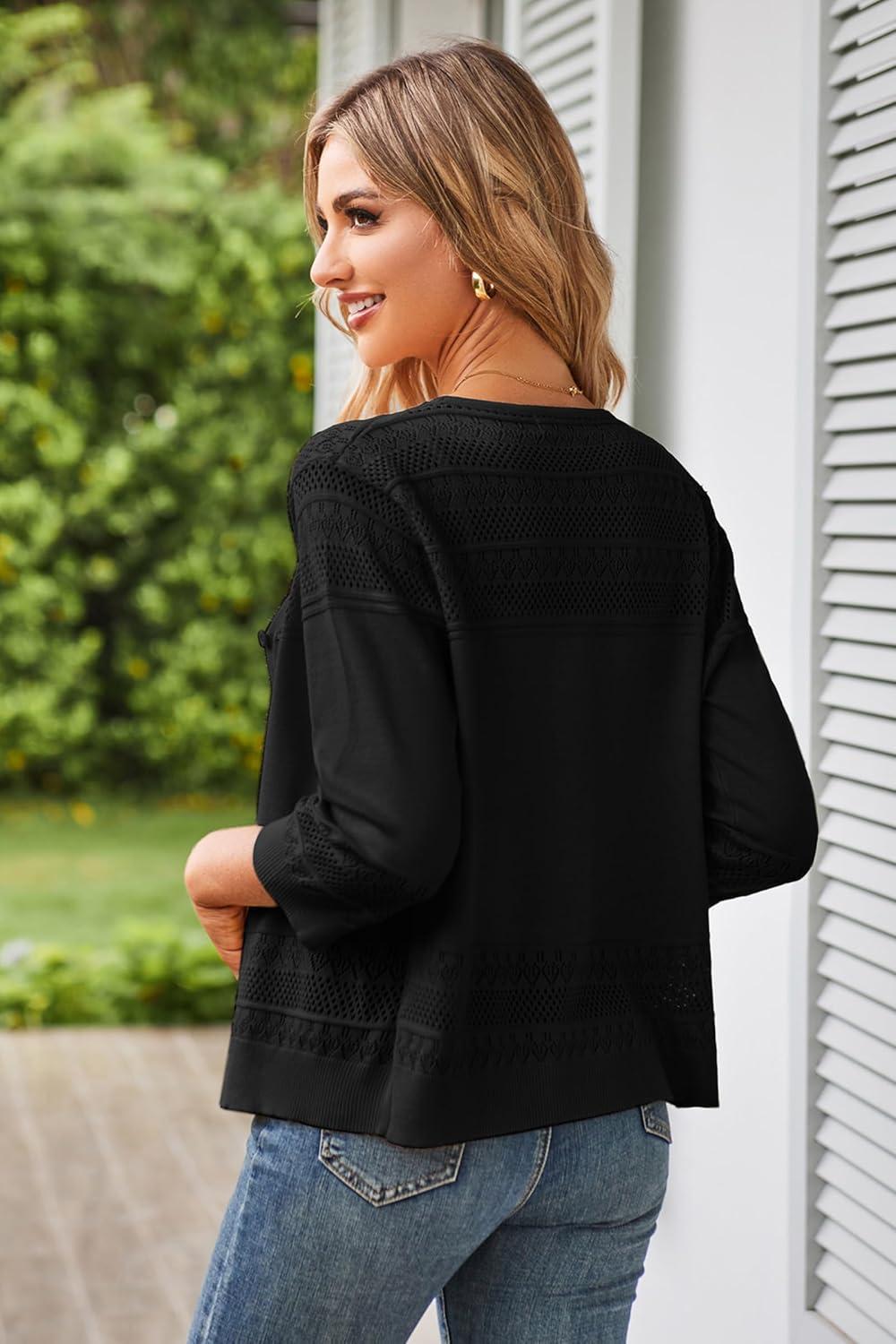 GRACE KARIN Women's 2025 Cropped Cardigan 3/4 Sleeve Lightweight Crochet Shrug Hollowed-Out Knit Sweater Tops(Black)