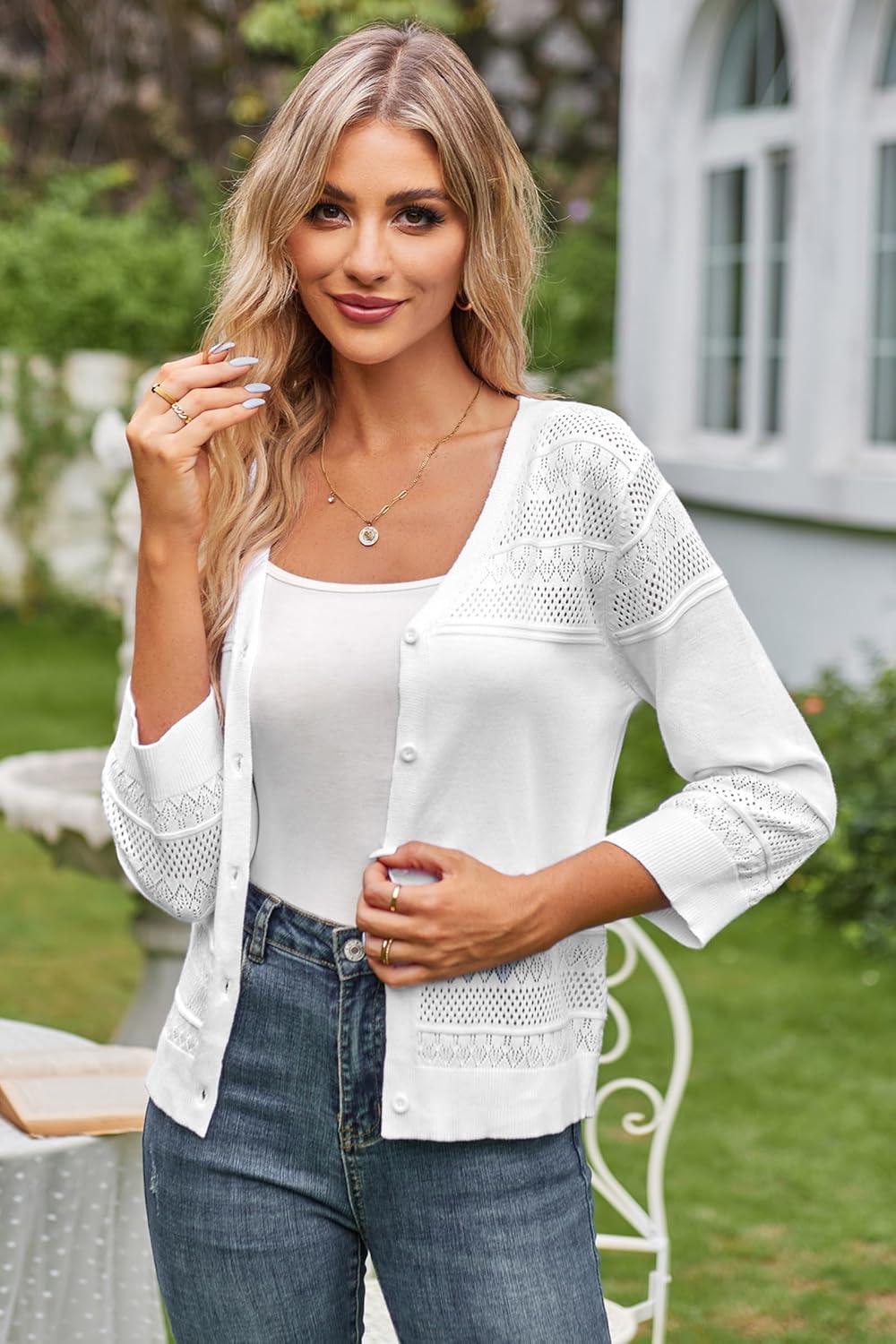 GRACE KARIN Women's 2025 Cropped Cardigan 3/4 Sleeve Lightweight Crochet Shrug Hollowed-Out Knit Sweater Tops(Bright White)