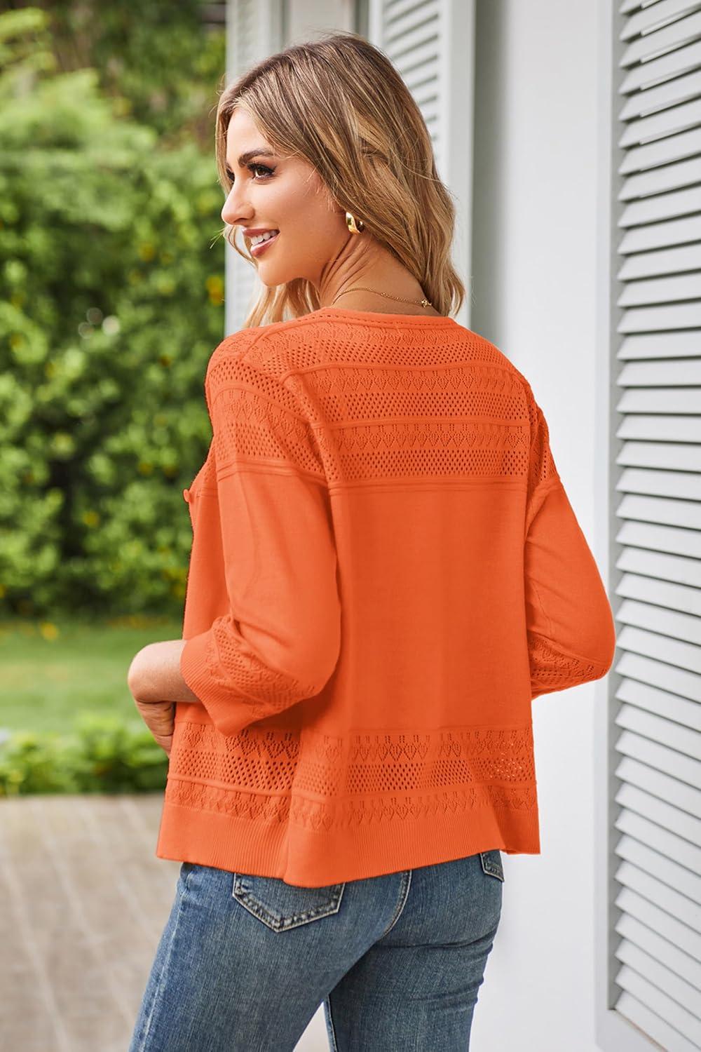 GRACE KARIN Women's 2025 Cropped Cardigan 3/4 Sleeve Lightweight Crochet Shrug Hollowed-Out Knit Sweater Tops(Orange)