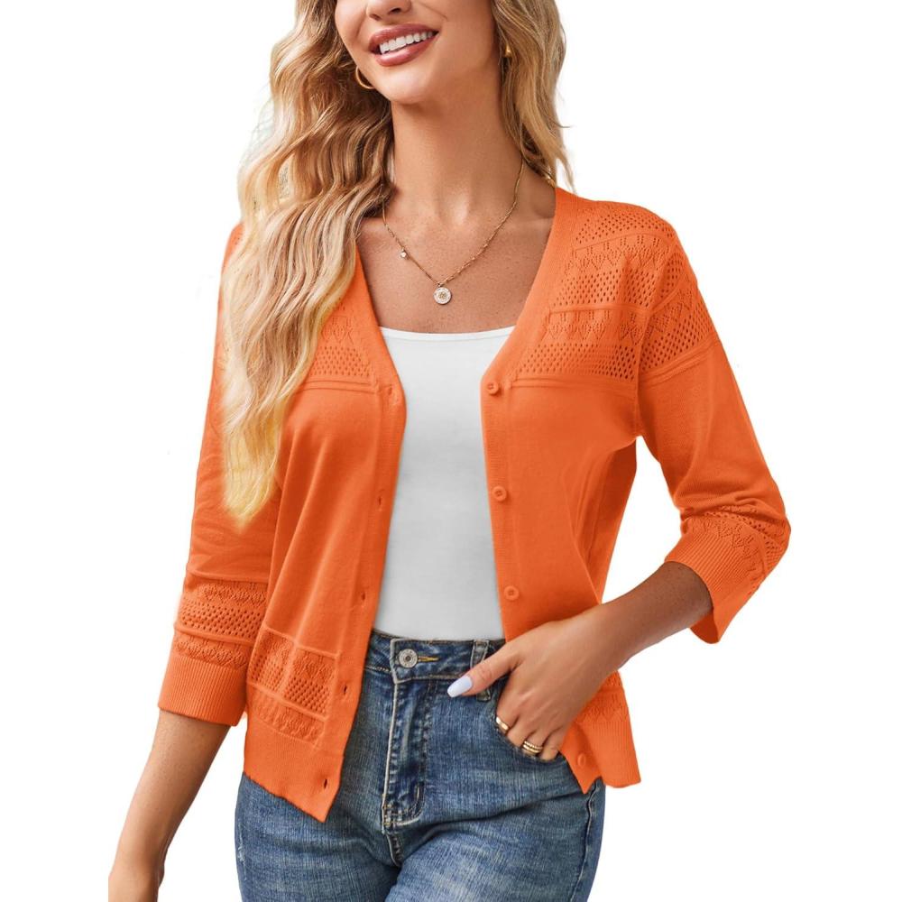 GRACE KARIN Women’s 2025 Cropped Cardigan 3/4 Sleeve Lightweight Crochet Shrug Hollowed-Out Knit Sweater Tops(Orange)