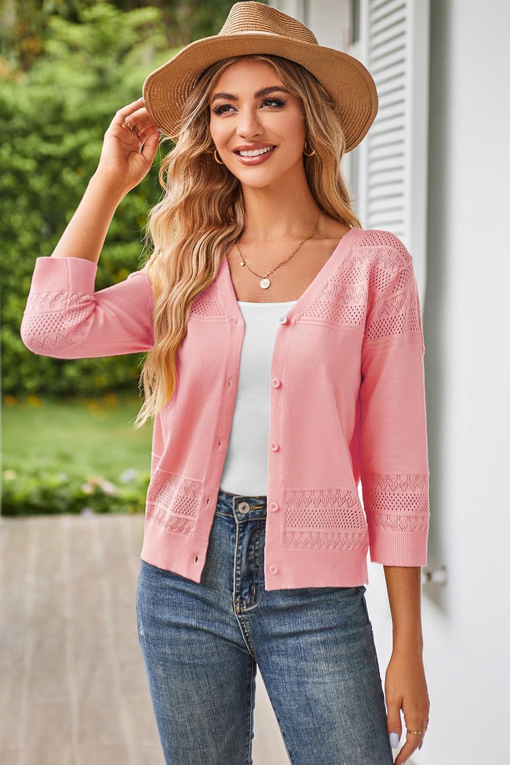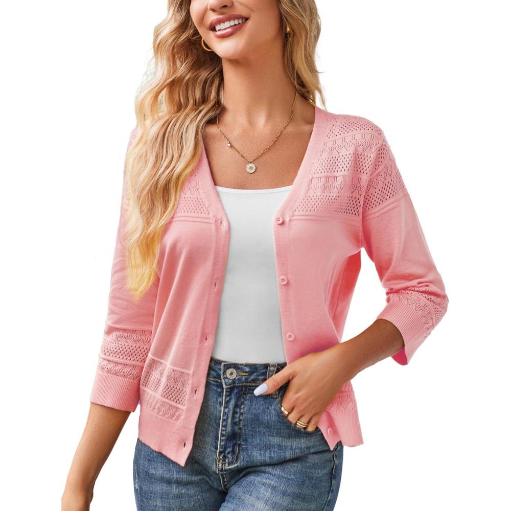 GRACE KARIN Women's 2025 Cropped Cardigan 3/4 Sleeve Lightweight Crochet Shrug Hollowed-Out Knit Sweater Tops(Pink)
