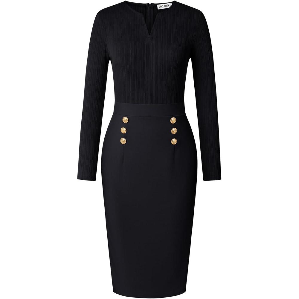 GRACE KARIN Women’s 2025 Fall Henly V Neck Business Work Dress Long Sleeve Bodycon Midi Elegant Office Sheath Dress(Black)