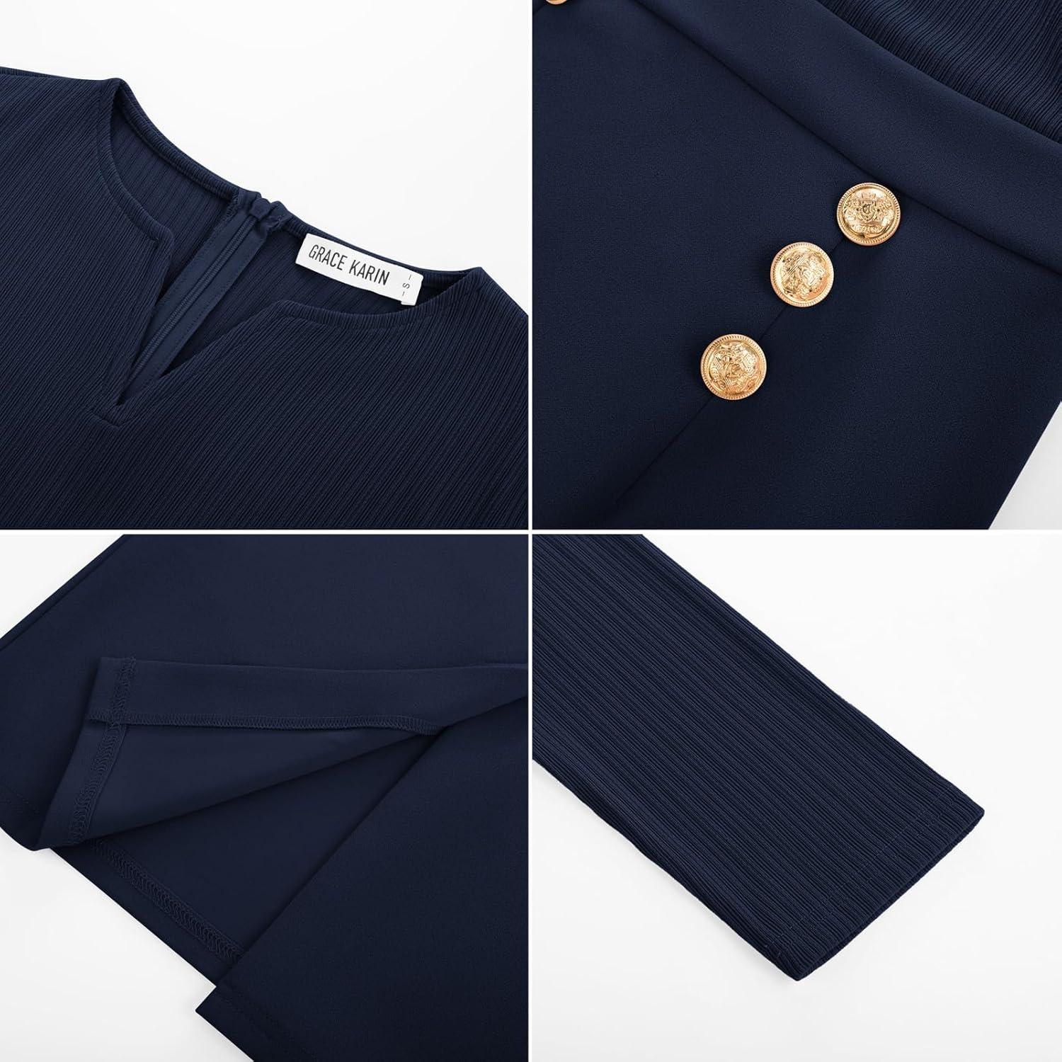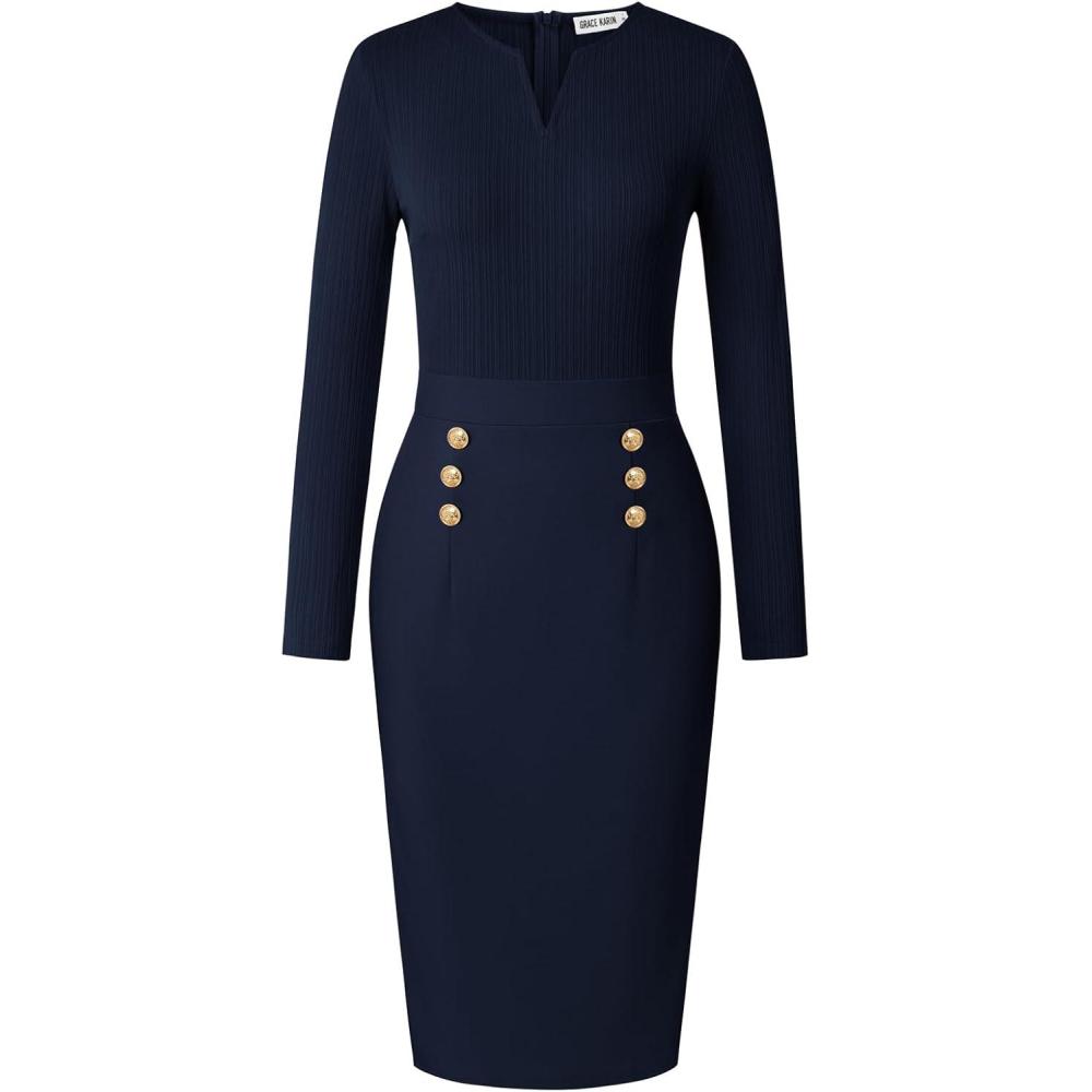 GRACE KARIN Women’s 2025 Fall Henly V Neck Business Work Dress Long Sleeve Bodycon Midi Elegant Office Sheath Dress(Navy)