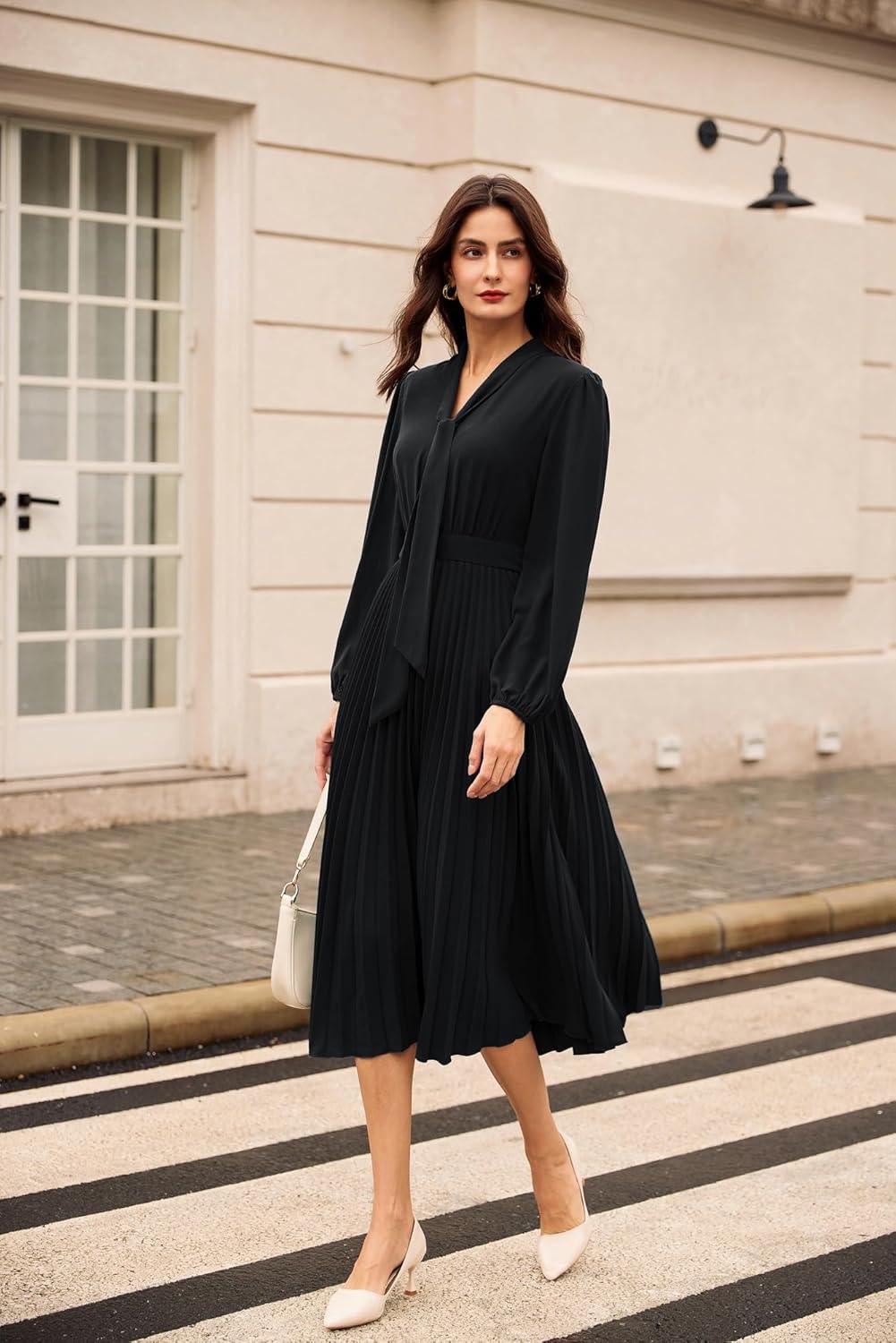 GRACE KARIN Womens 2025 Fall Long Sleeve Dress Casual V Neck Pleated A Line Flowy Midi Dresses(Black)