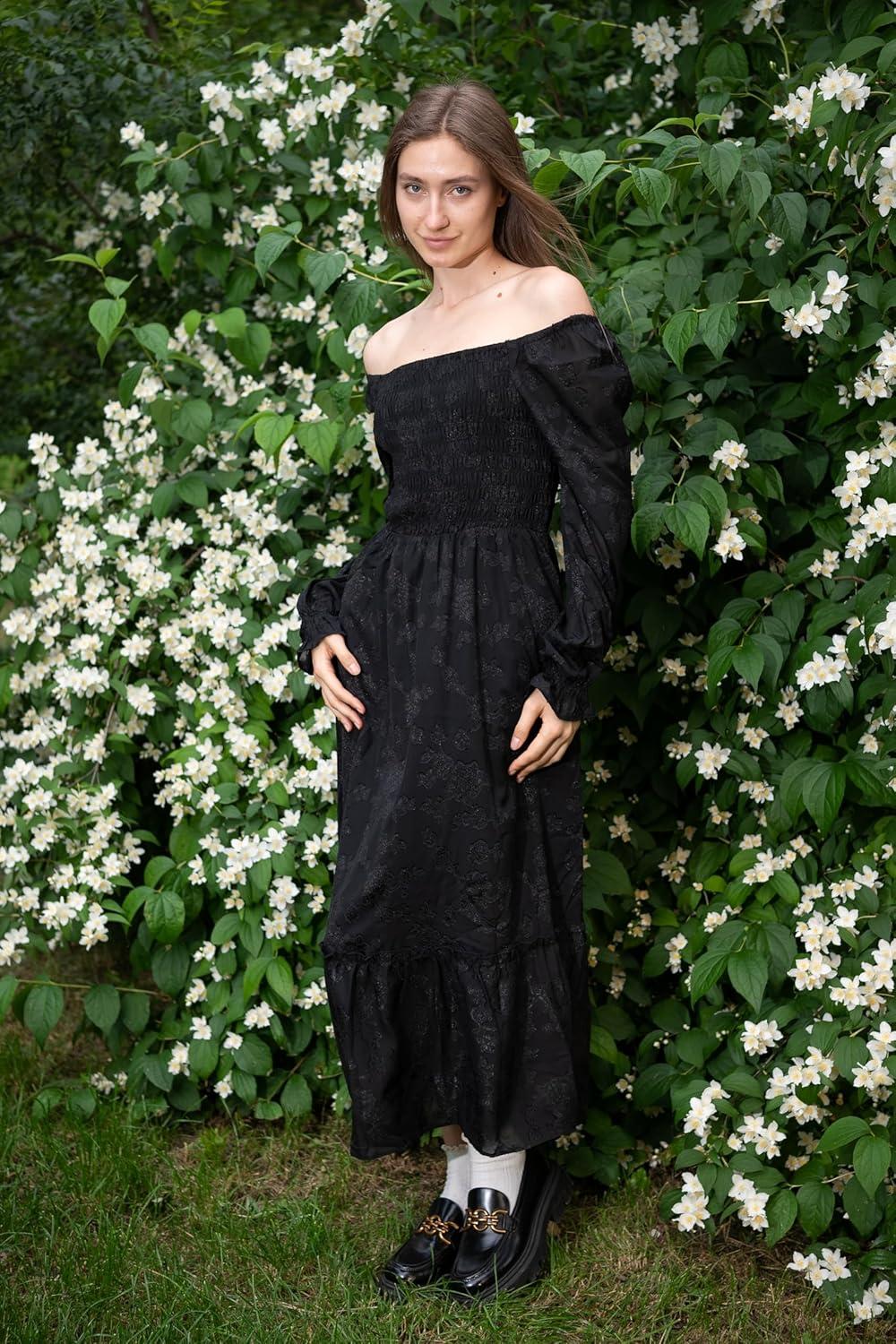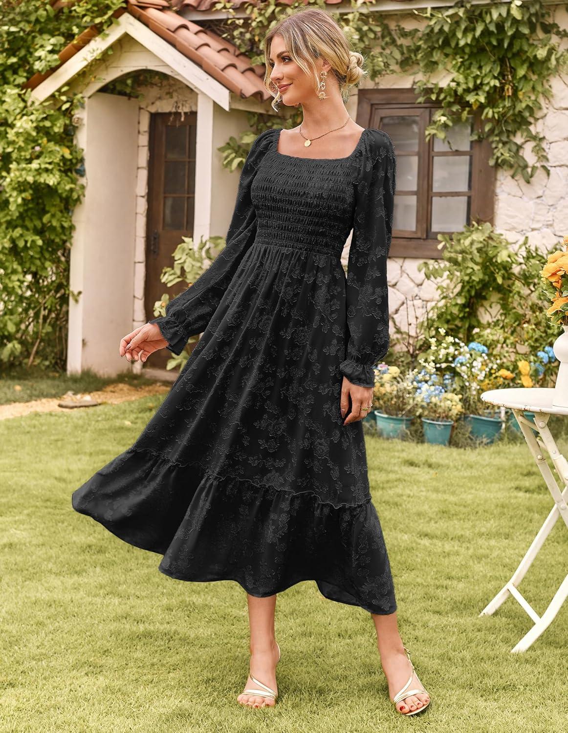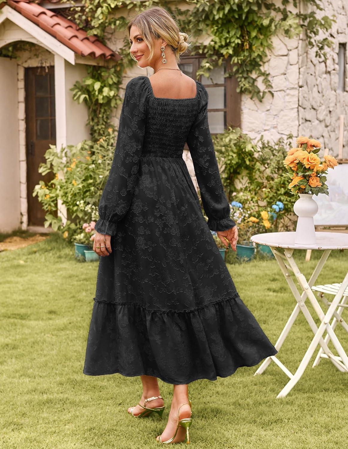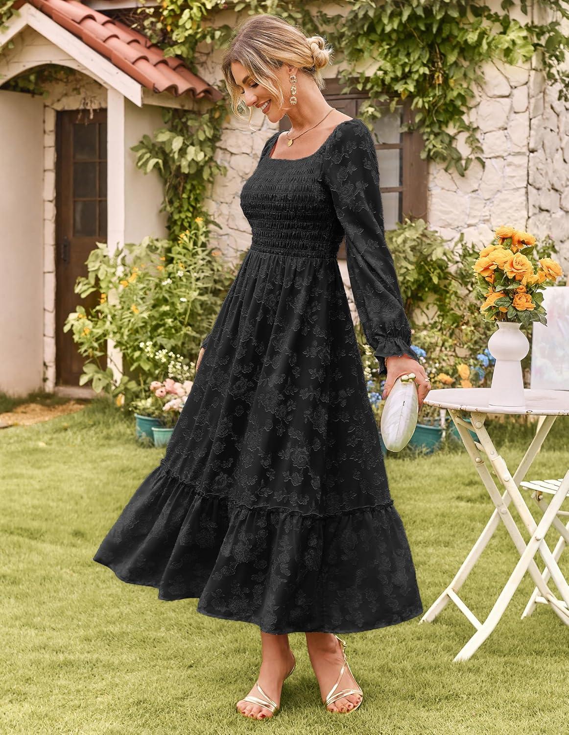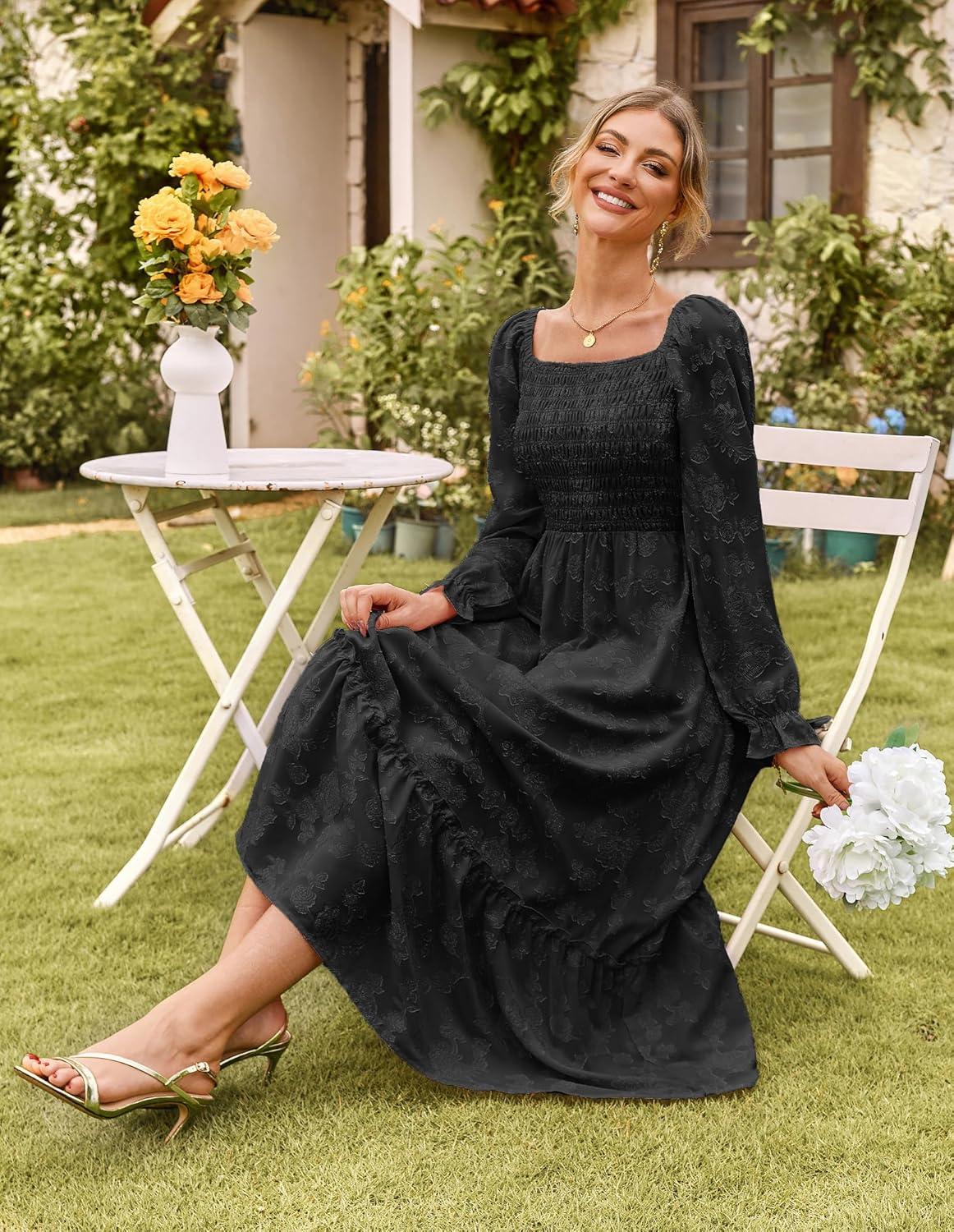GRACE KARIN Women's 2025 Fall Long Sleeve Maxi Dress Floral Wedding Guest Dress Smocked Flowy Tiered Dresses with Pockets(Black)