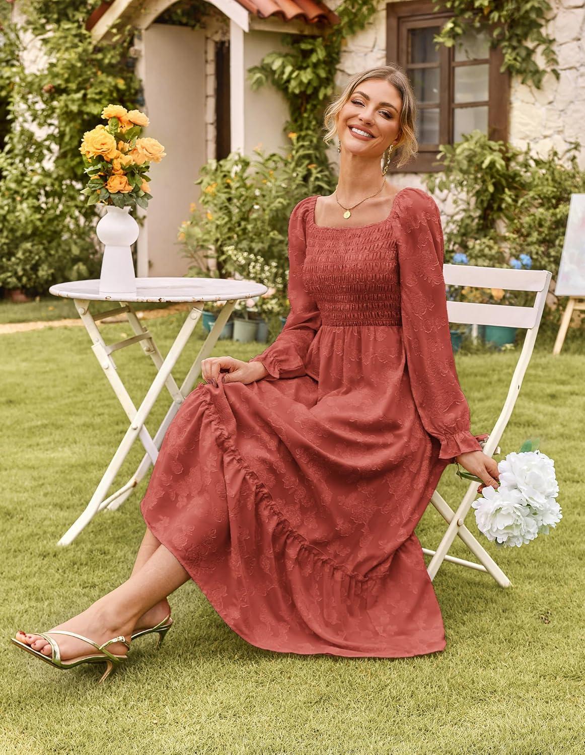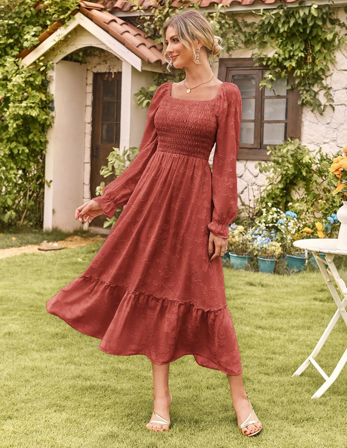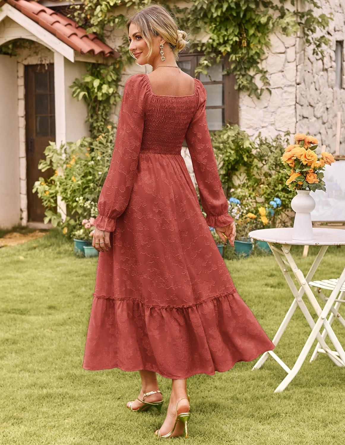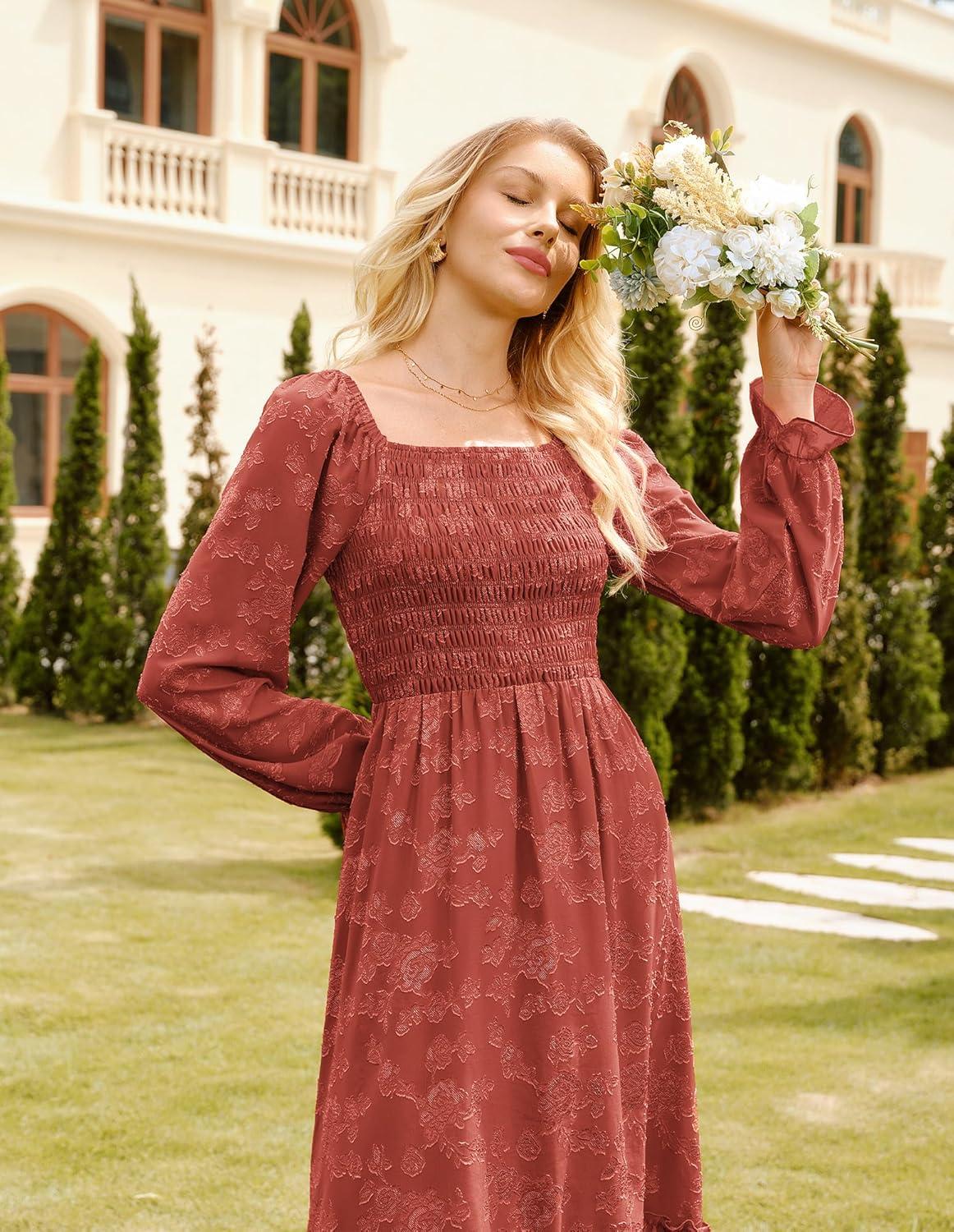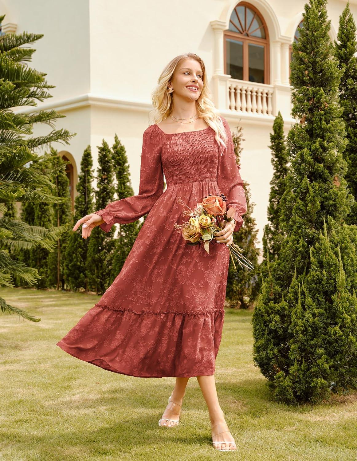GRACE KARIN Women’s 2025 Fall Long Sleeve Maxi Dress Floral Wedding Guest Dress Smocked Flowy Tiered Dresses with Pockets(Brick Red)