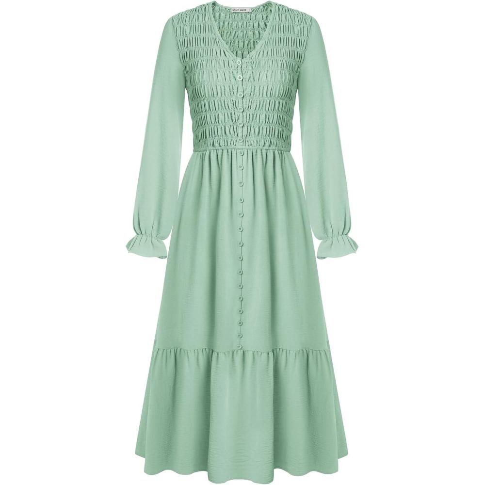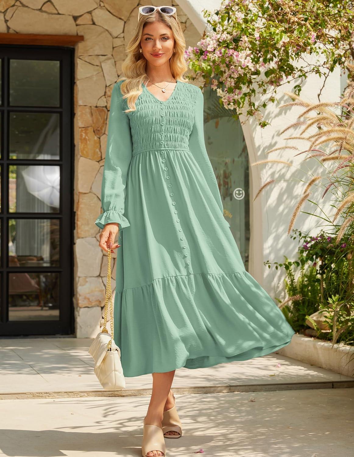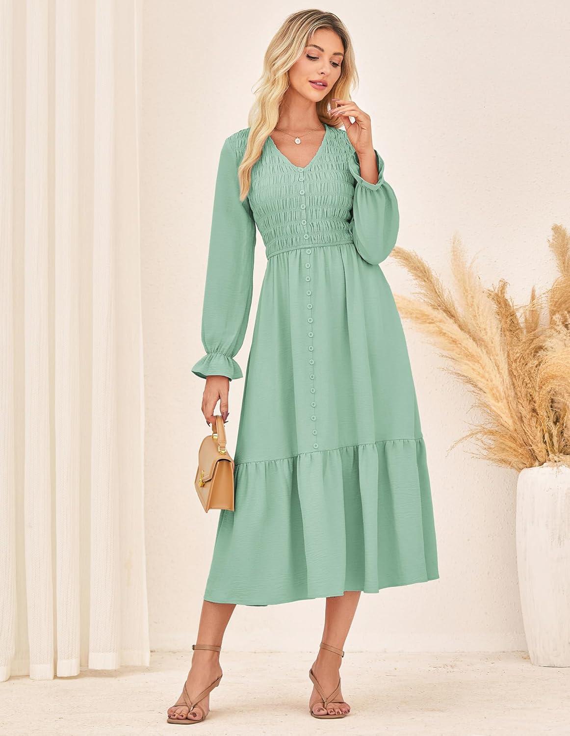 GRACE KARIN Women's 2025 Fall Long Sleeve Maxi Dresses Smocked V Neck Flowy Casual Dress with Pockets Wedding Guest(Light Green)