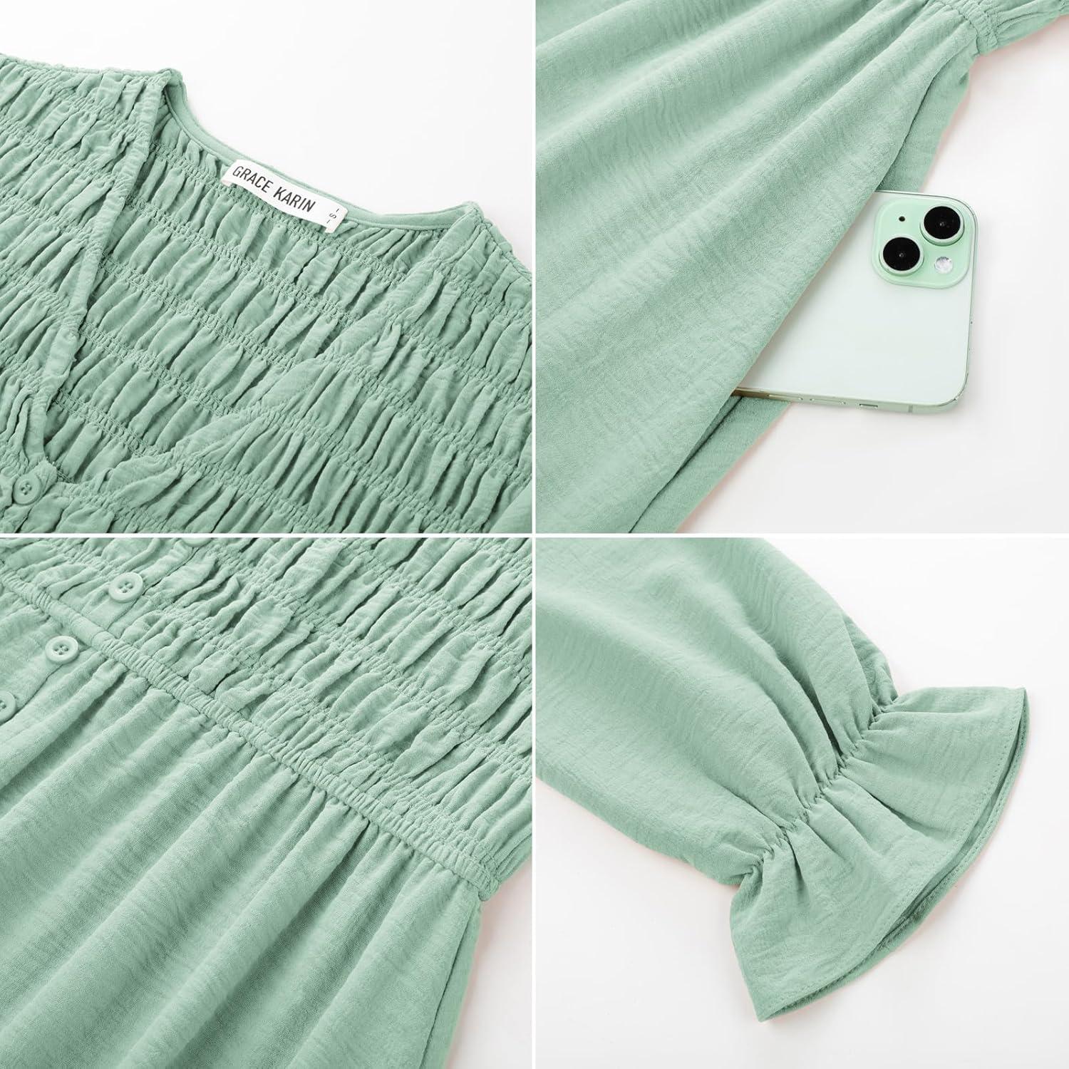Get a free gift with your purchase of GRACE KARIN Women’s 2025 Fall Long Sleeve Maxi Dresses Smocked V Neck Flowy Casual Dress with Pockets Wedding Guest(Light Green). Limited quantities available!