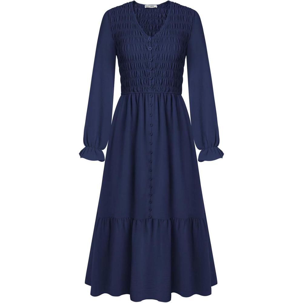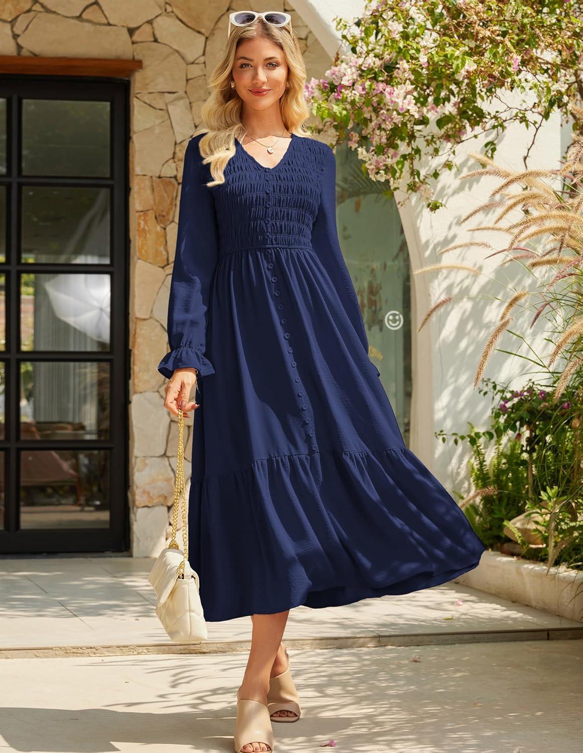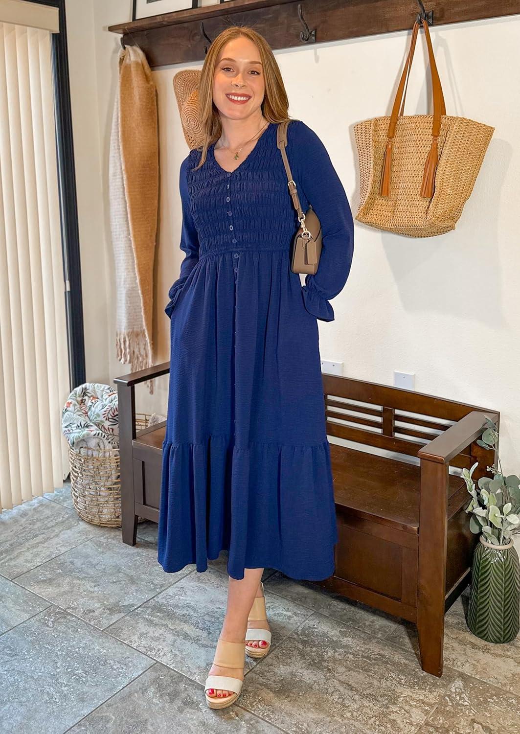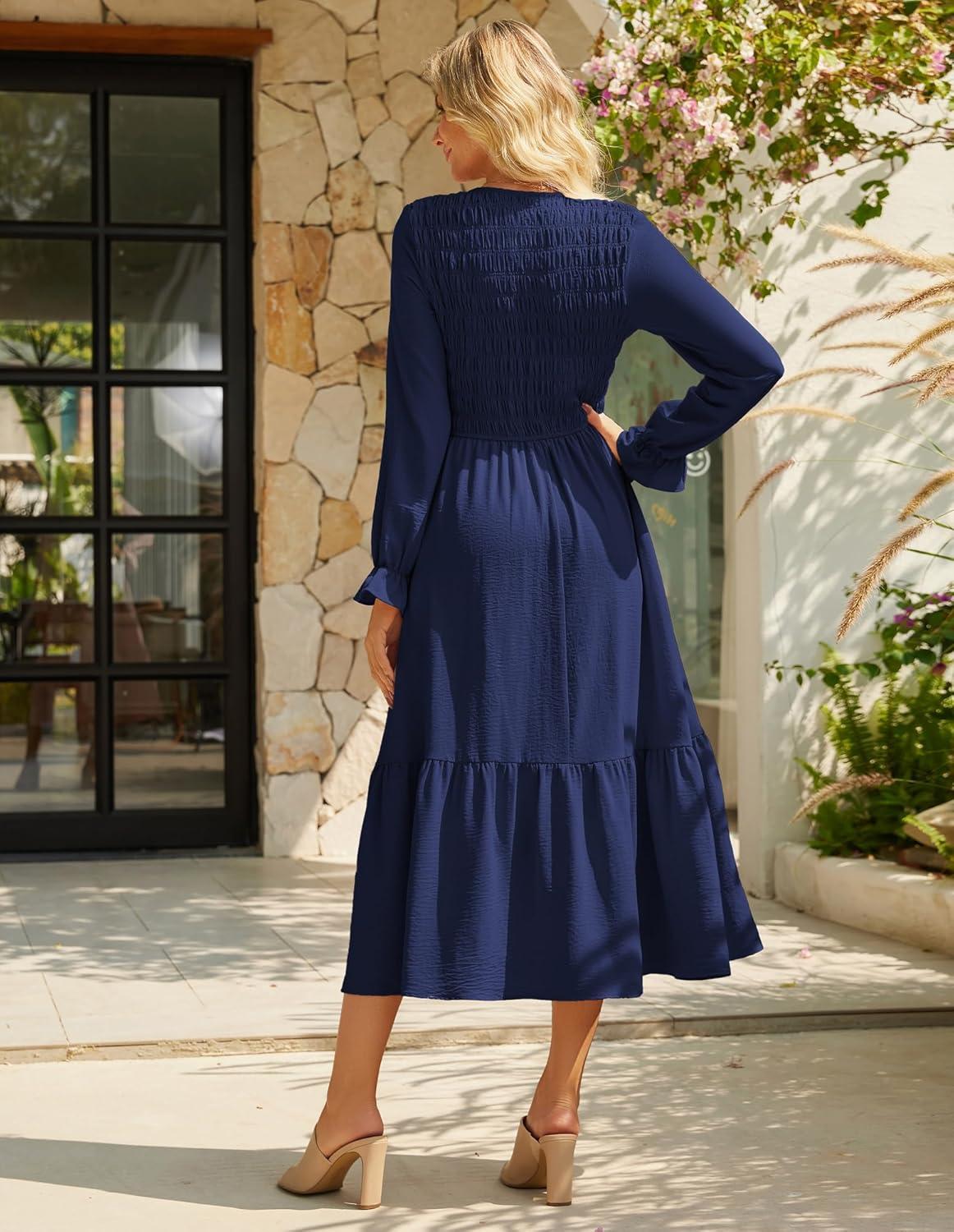 GRACE KARIN Women's 2025 Fall Long Sleeve Maxi Dresses Smocked V Neck Flowy Casual Dress with Pockets Wedding Guest(Navy)