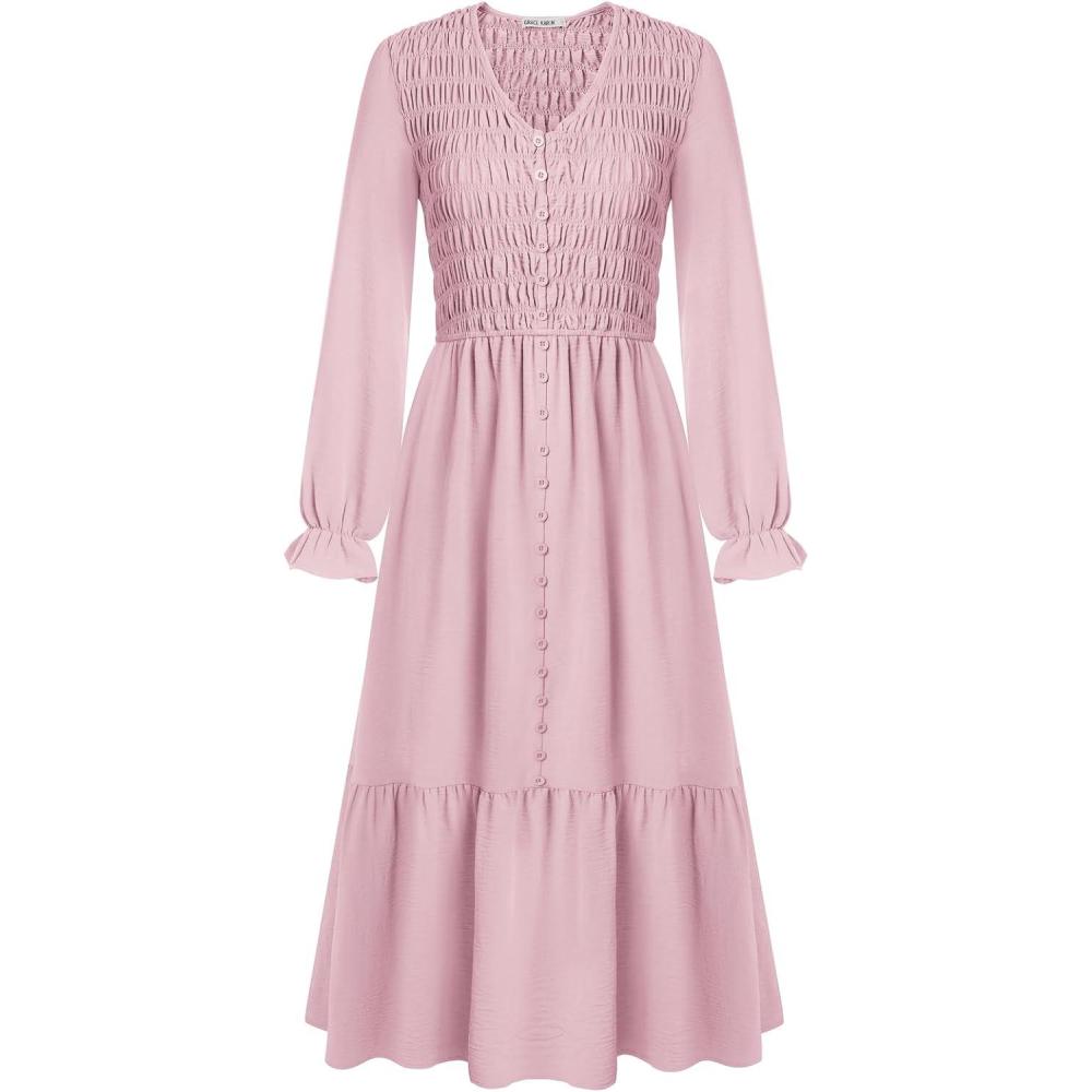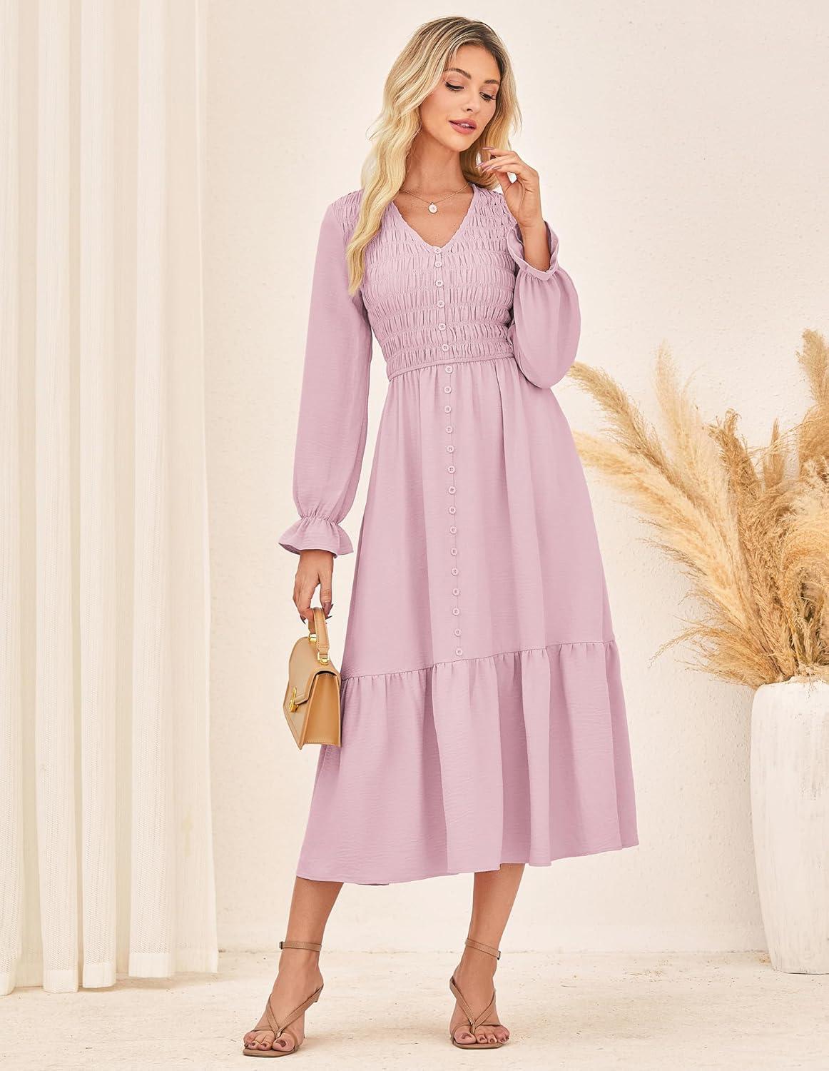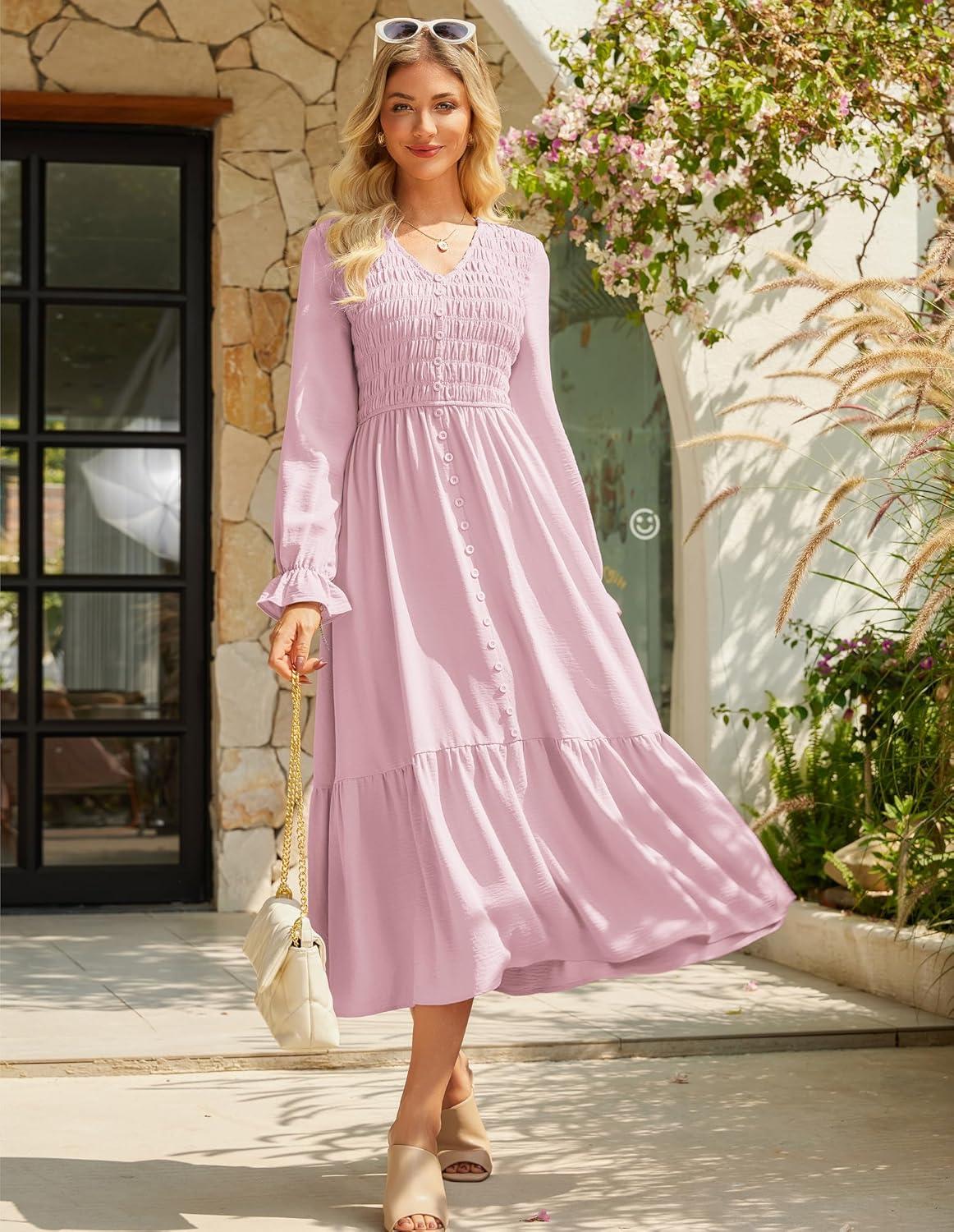 GRACE KARIN Women's 2025 Fall Long Sleeve Maxi Dresses Smocked V Neck Flowy Casual Dress with Pockets Wedding Guest(Pink)