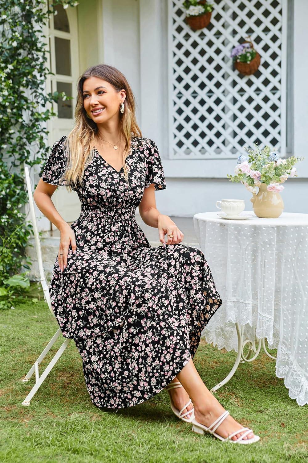 GRACE KARIN Women’s 2025 Floral Summer Long Midi Dress V Neck Short Sleeve Ruffle Tiered Layered Boho Swing Dresses(Black Rose Floral)