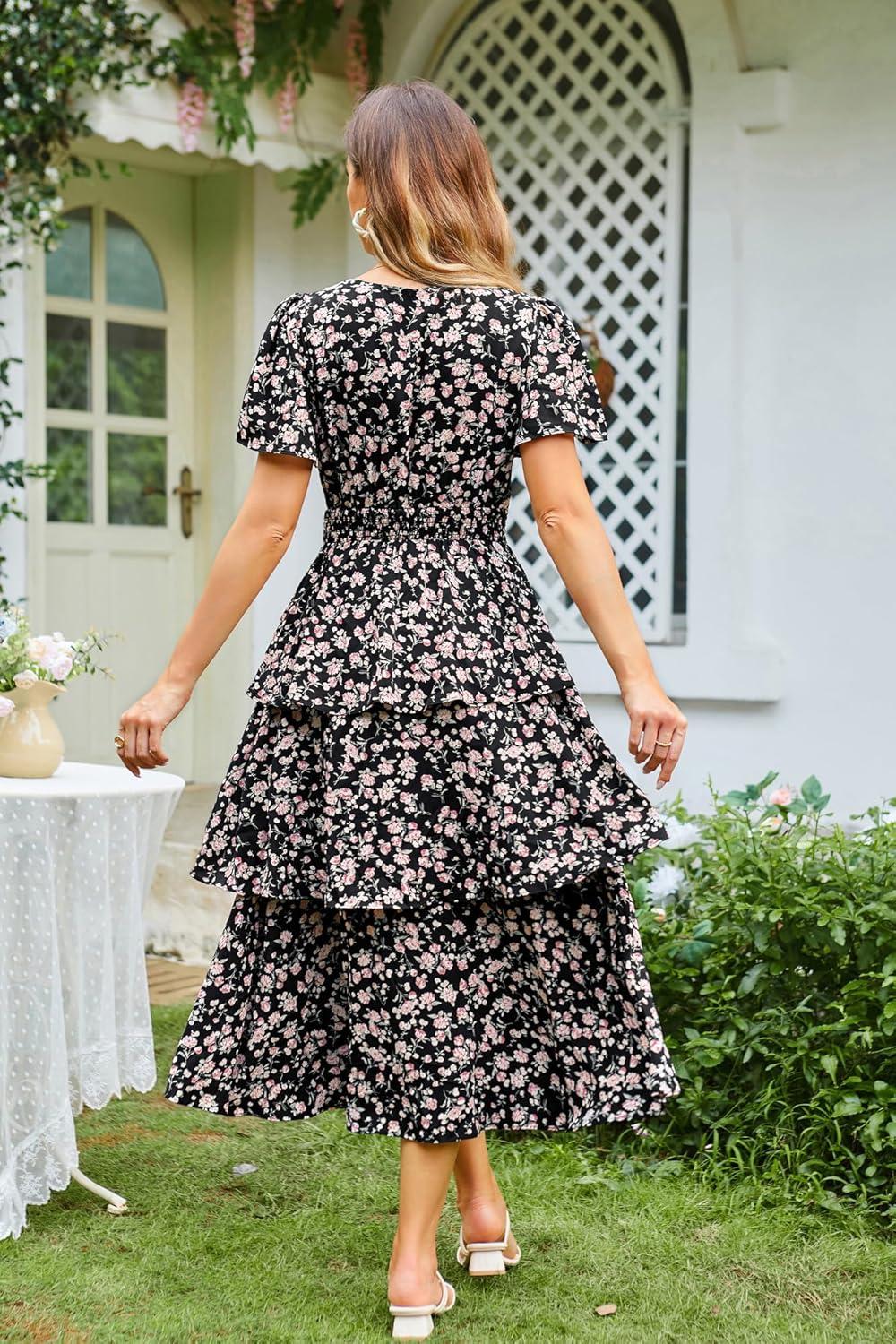 GRACE KARIN Women's 2025 Floral Summer Long Midi Dress V Neck Short Sleeve Ruffle Tiered Layered Boho Swing Dresses(Black Rose Floral)