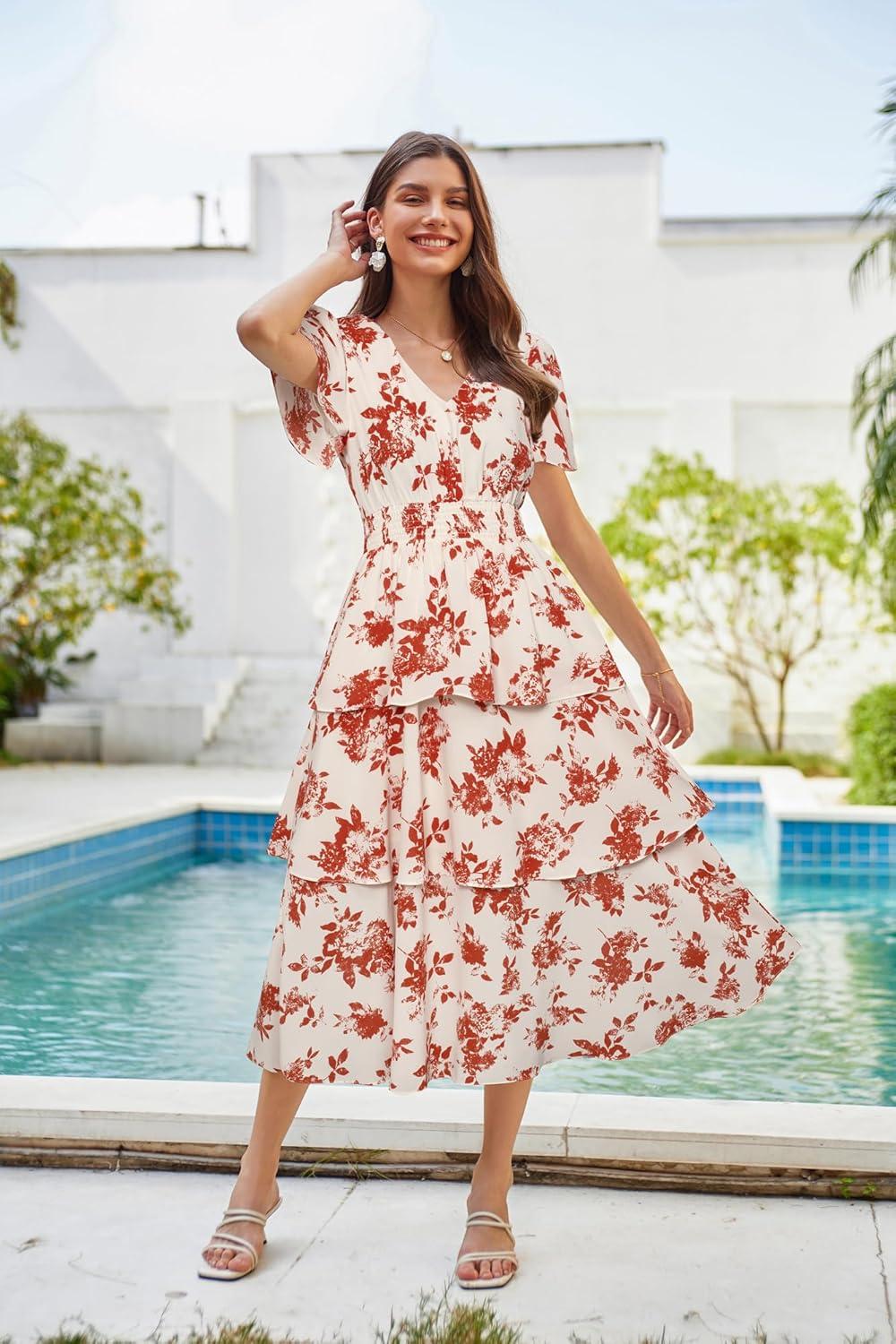 imageGRACE KARIN Womens 2025 Floral Summer Long Midi Dress V Neck Short Sleeve Ruffle Tiered Layered Boho Swing DressesRedwhite Floral