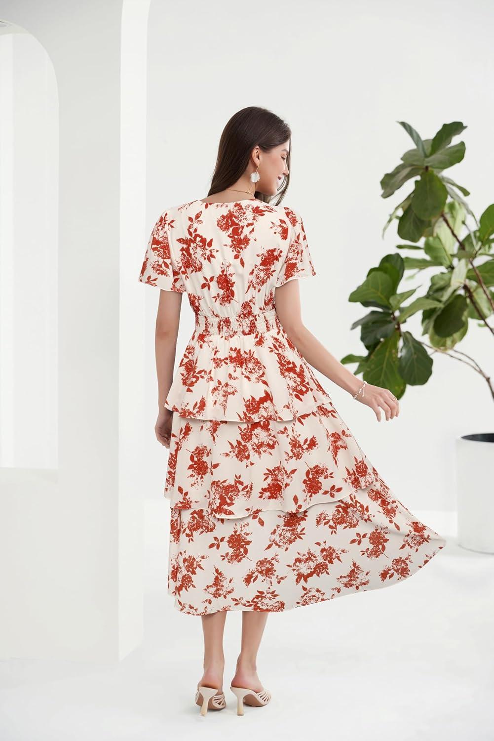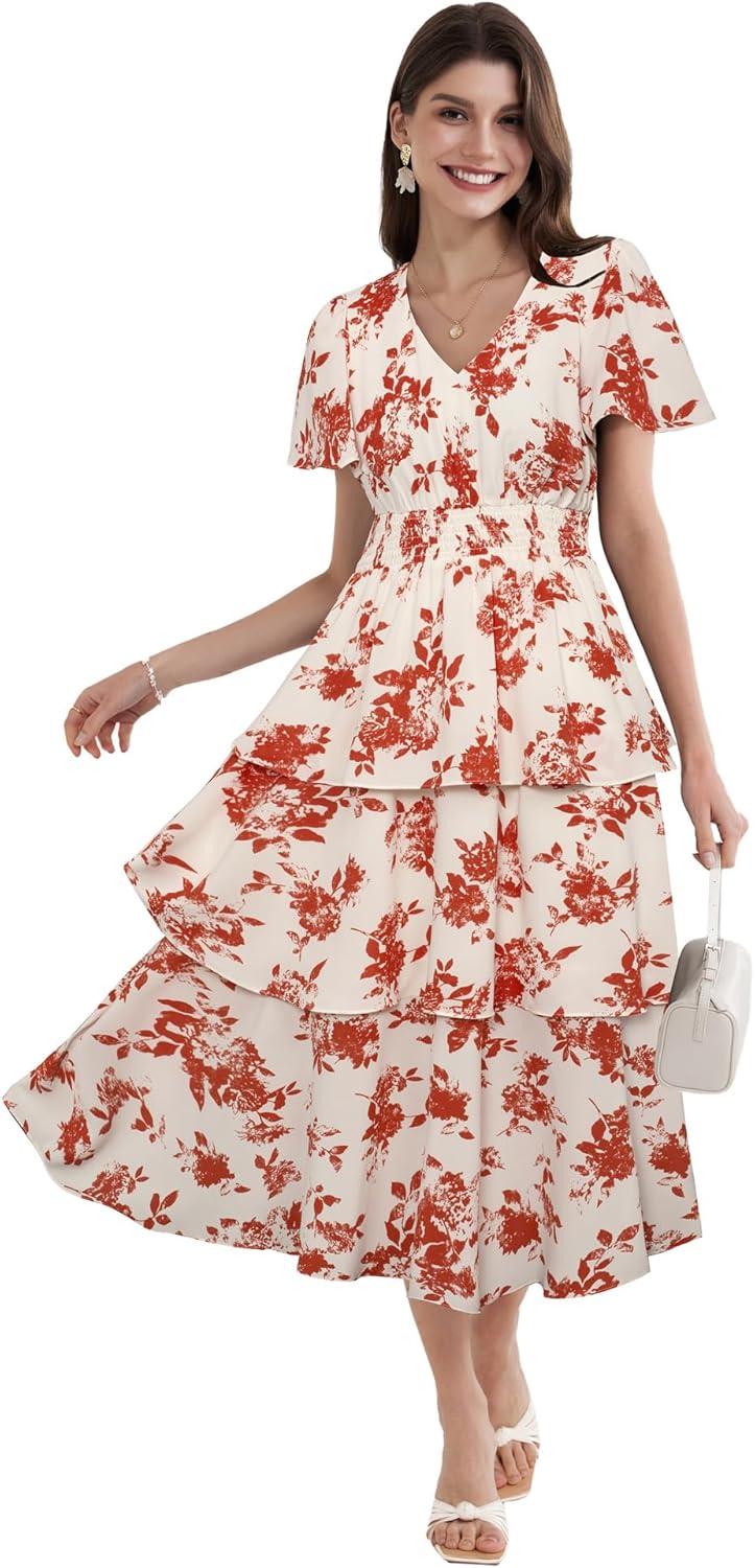 GRACE KARIN Women's 2025 Floral Summer Long Midi Dress V Neck Short Sleeve Ruffle Tiered Layered Boho Swing Dresses(Red&white Floral)