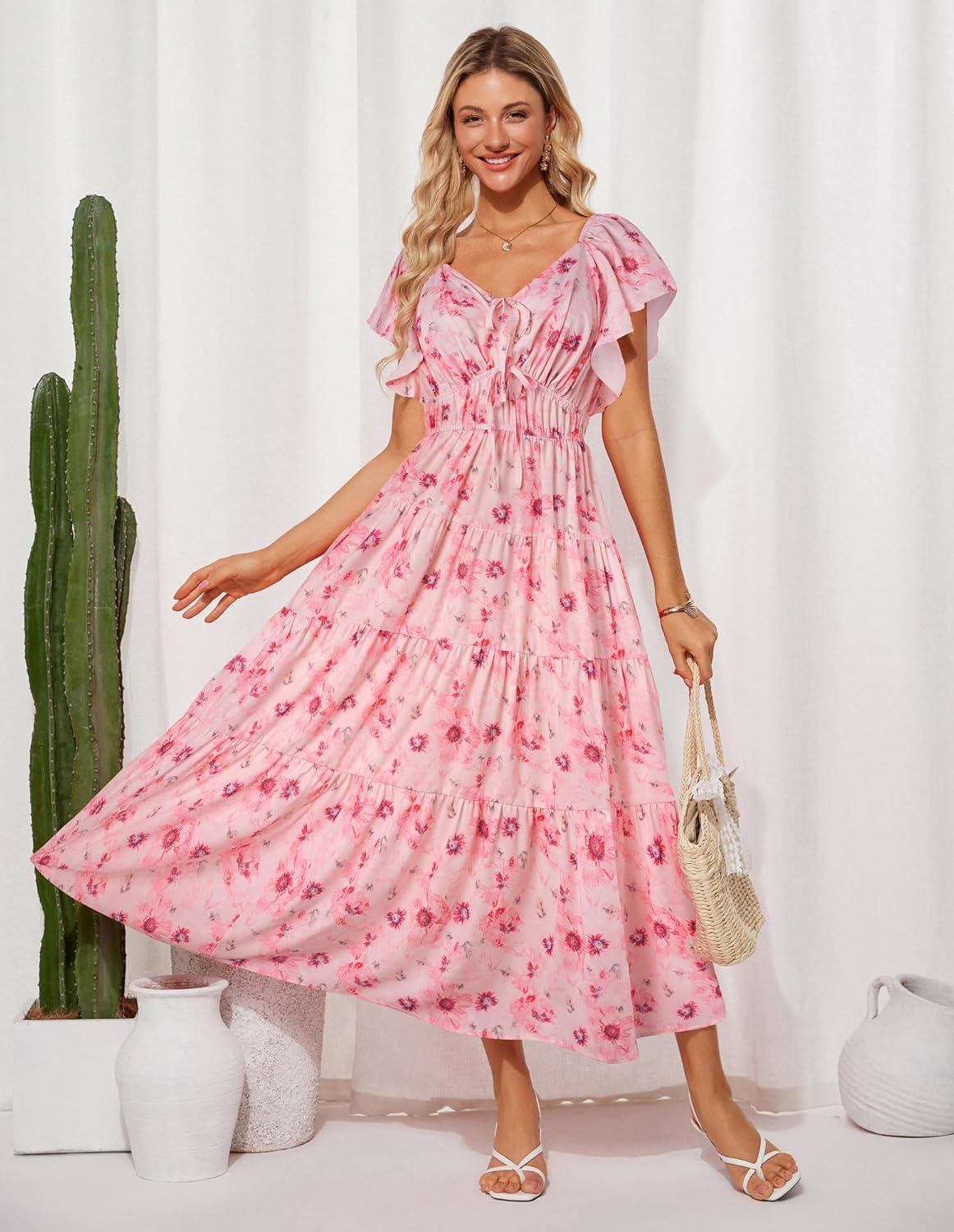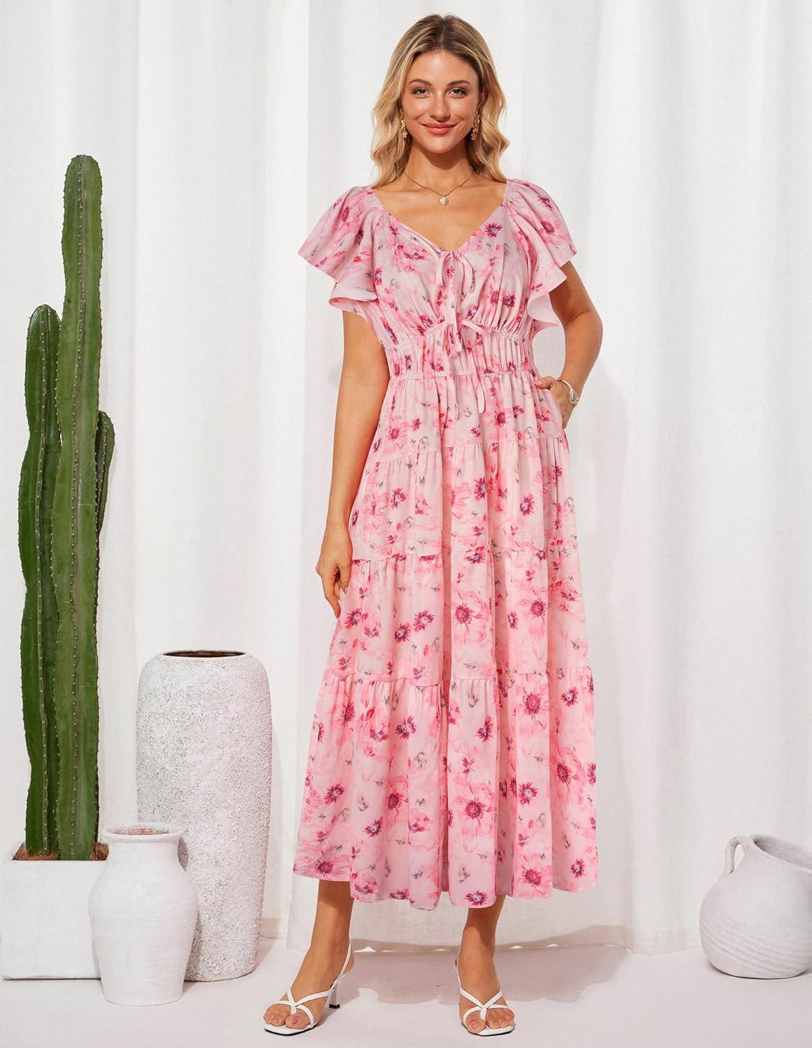 GRACE KARIN Womens 2025 Floral Summer V-Neck Ruffle Sleeve Empire Waist A-Line Casual Maxi Tiered Dress with Pockets(Pink Flower)