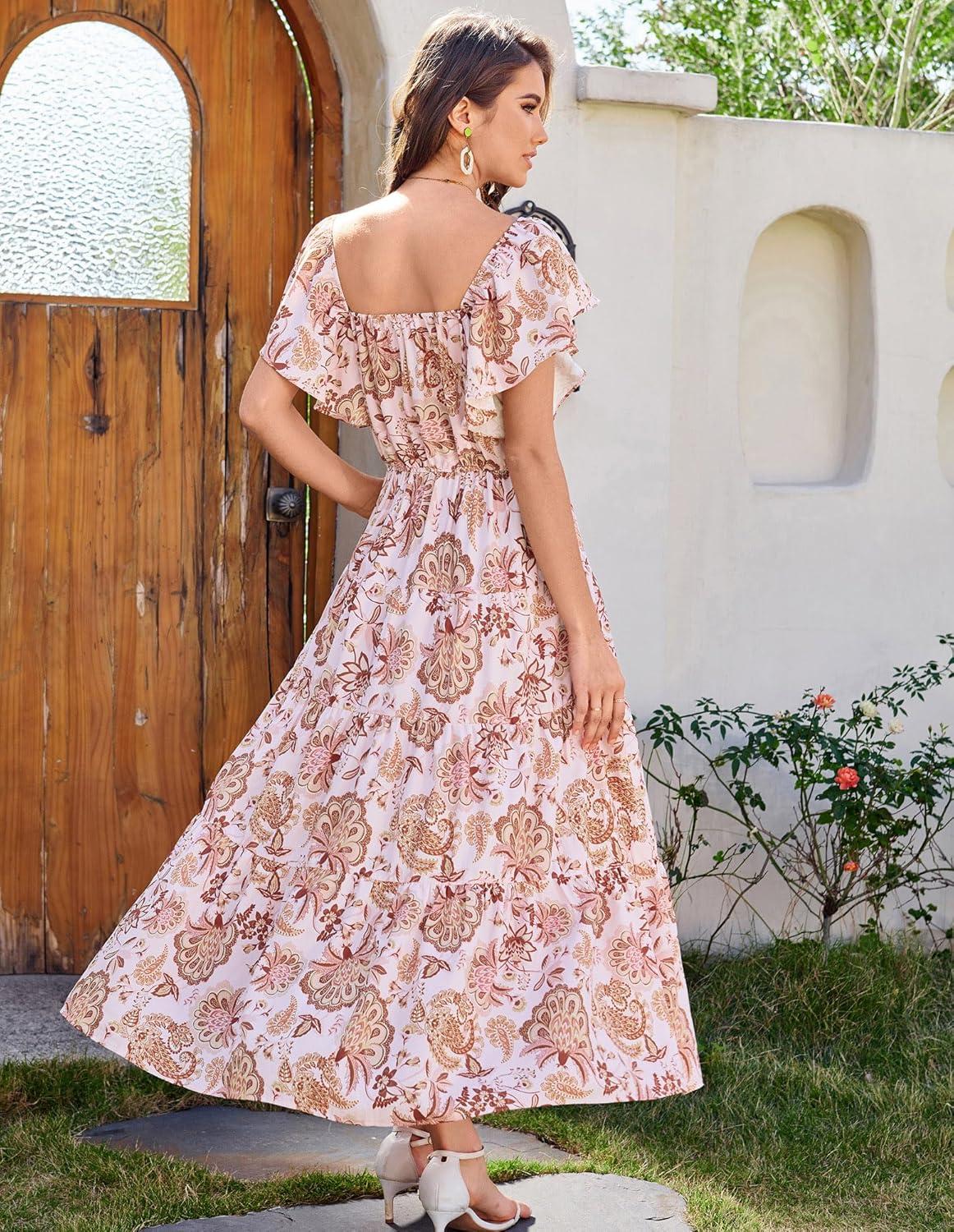 GRACE KARIN Womens 2025 Floral Summer V-Neck Ruffle Sleeve Empire Waist A-Line Casual Maxi Tiered Dress with Pockets(Red Blue)