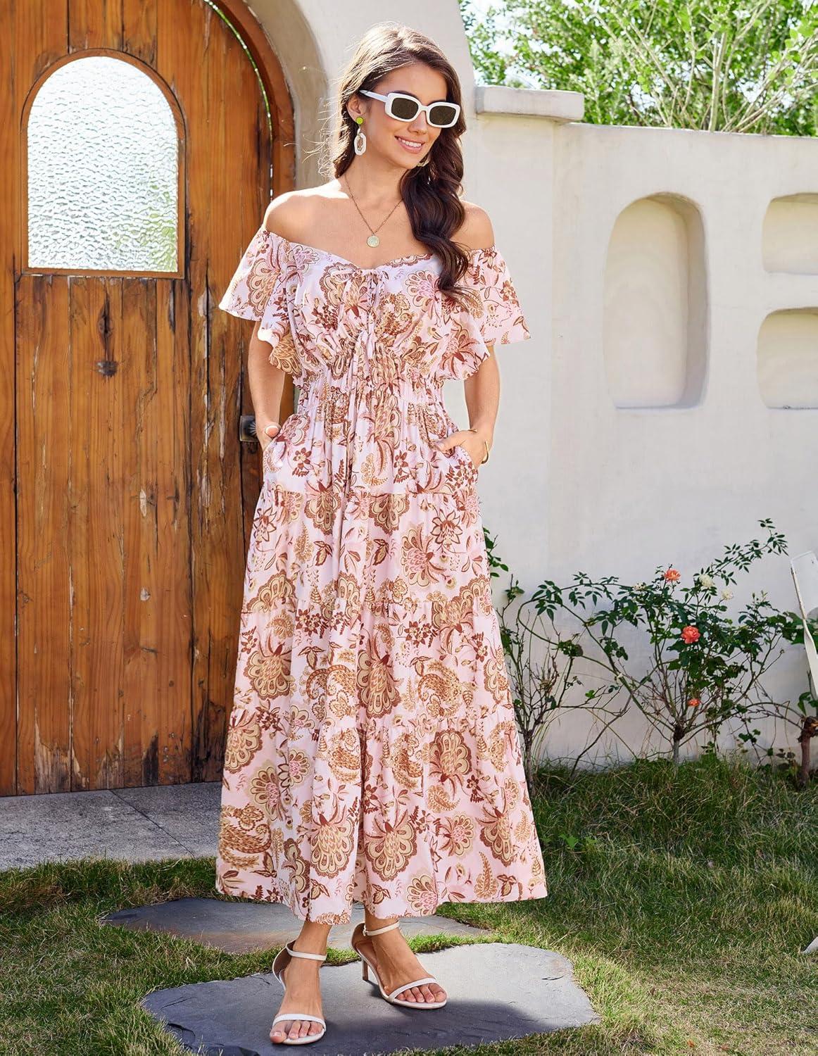 imageGRACE KARIN Womens 2025 Floral Summer VNeck Ruffle Sleeve Empire Waist ALine Casual Maxi Tiered Dress with PocketsRed Blue