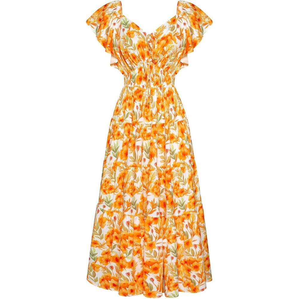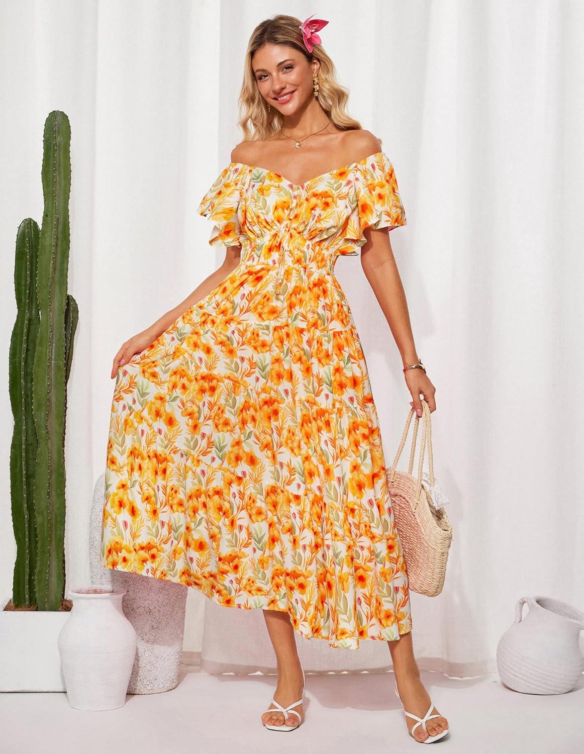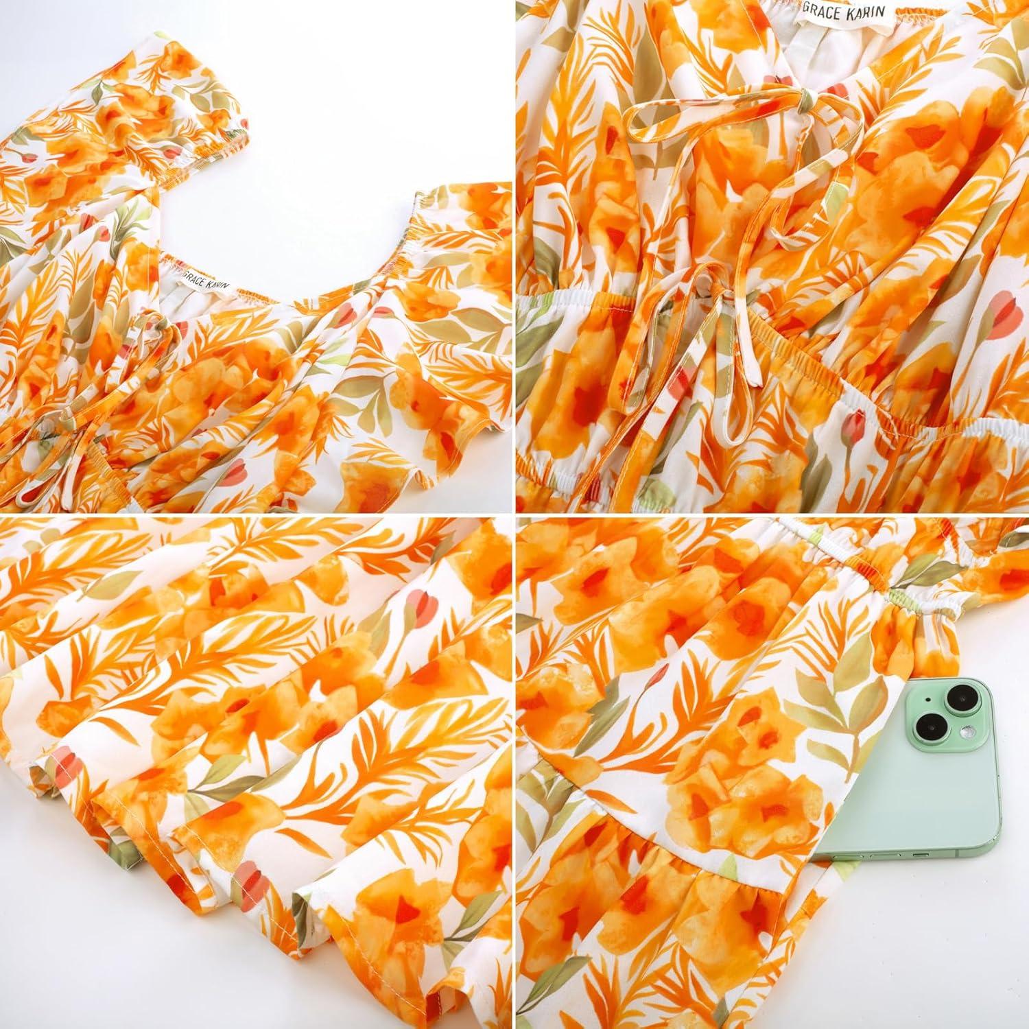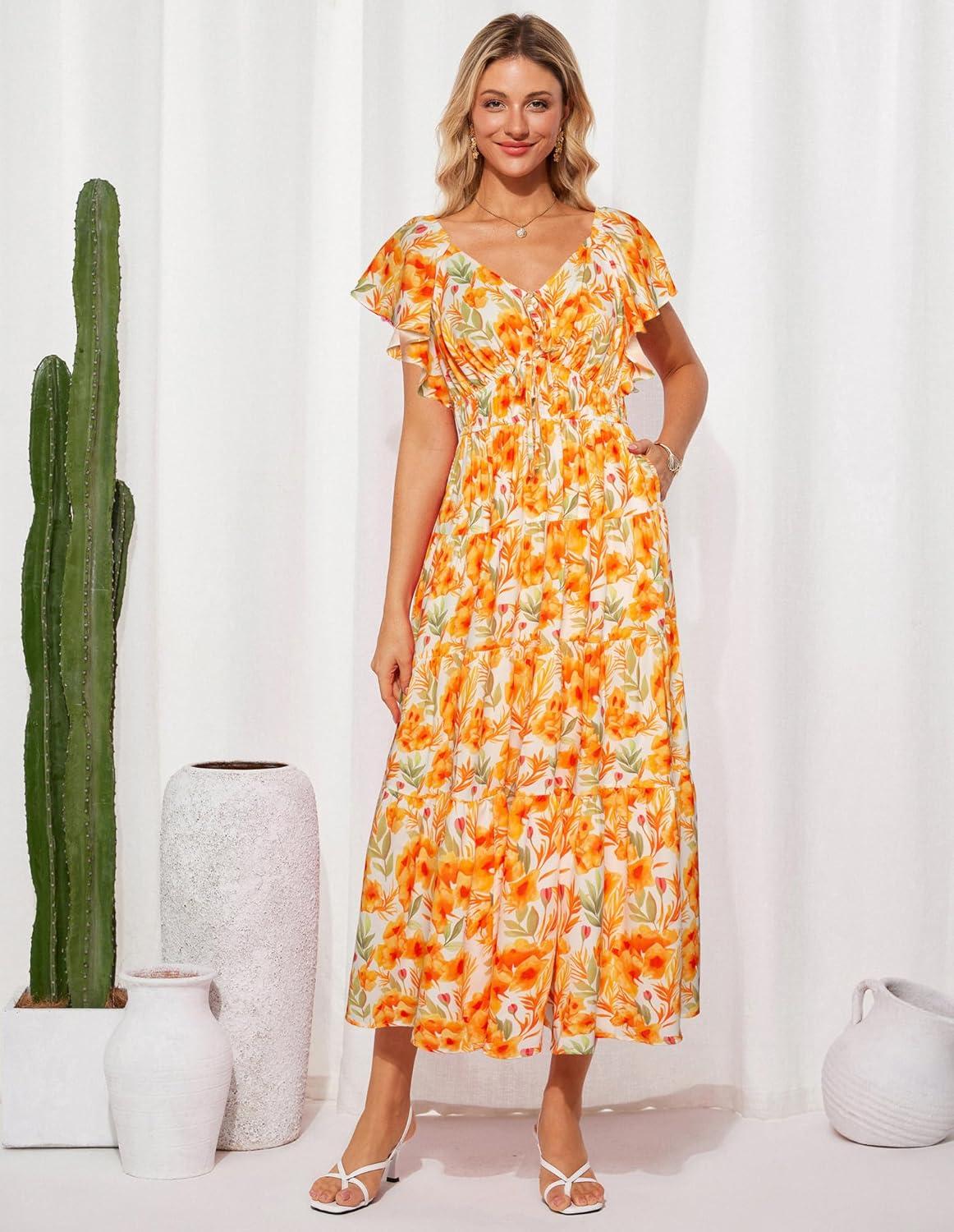 GRACE KARIN Womens 2025 Floral Summer V-Neck Ruffle Sleeve Empire Waist A-Line Casual Maxi Tiered Dress with Pockets(Yellow Green)