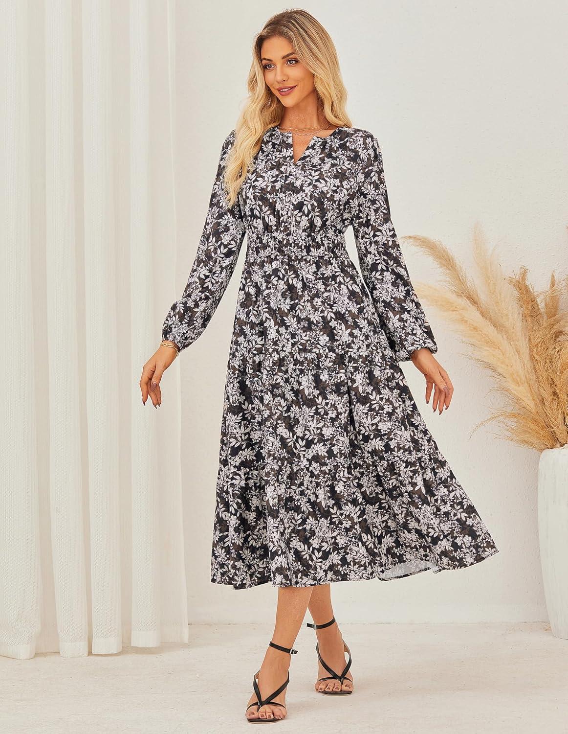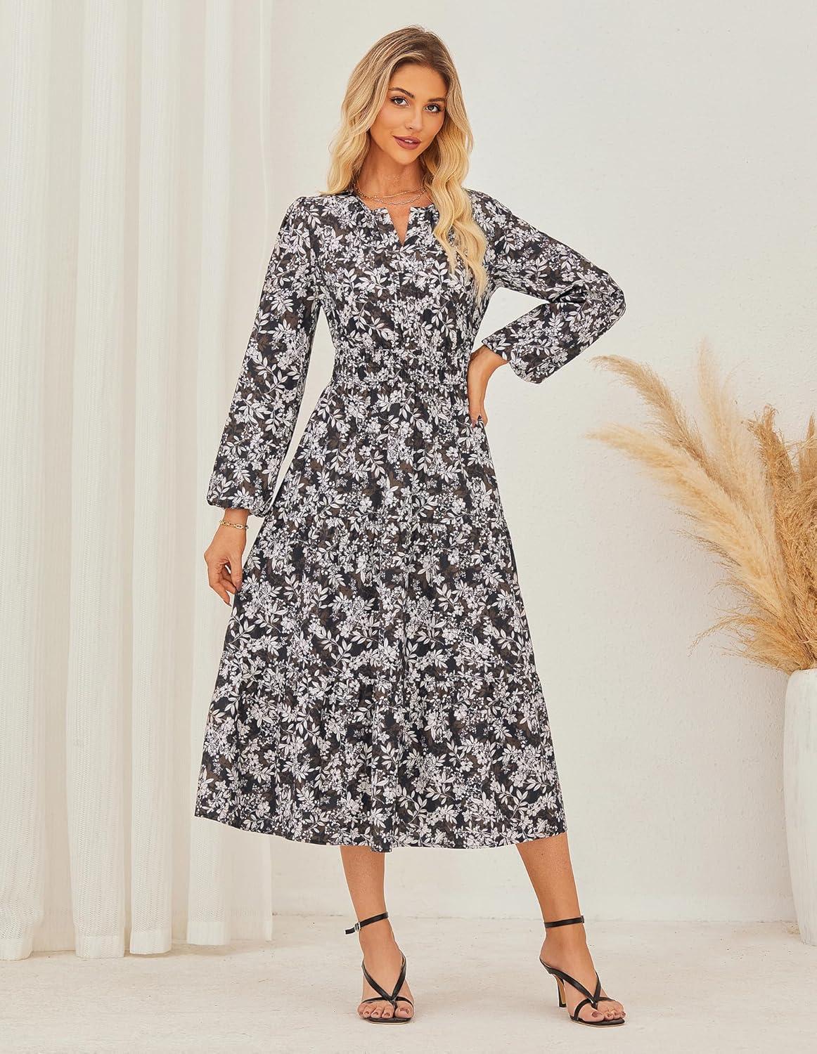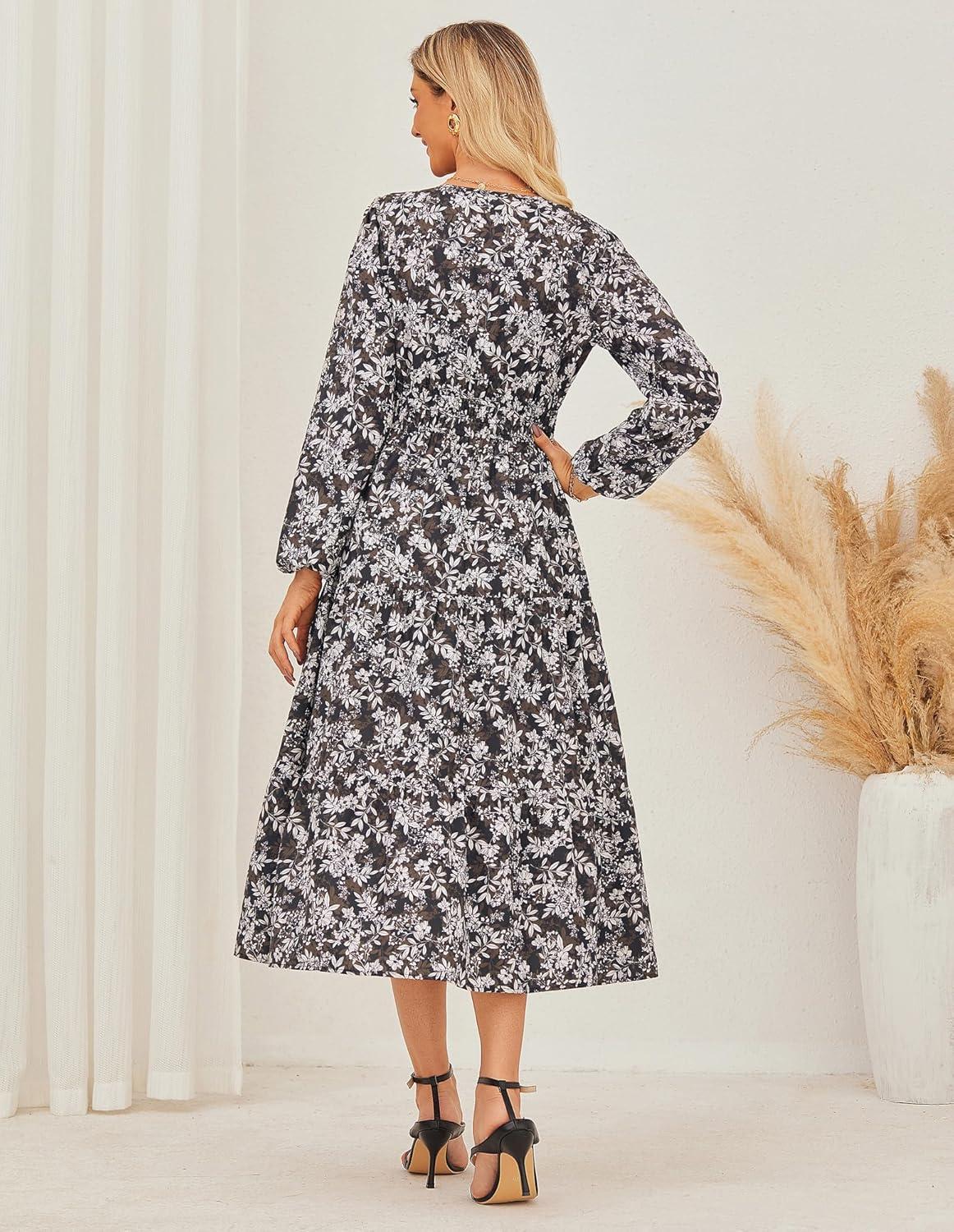 GRACE KARIN Womens 2025 Long Sleeve Floral Maxi Dress V Neck High Waist A Line Flowy Wedding Guest Dresses(Black Floral)
