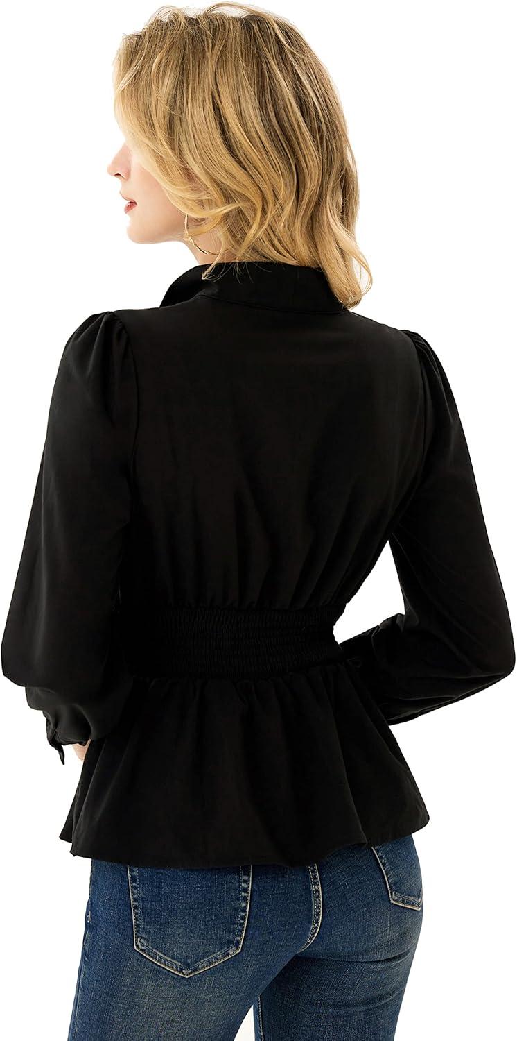 GRACE KARIN Women's 2025 Long Sleeve Peplum Dressy Shirt Office Bow Tie Work Blouses Tops Smocked Waist(Black)