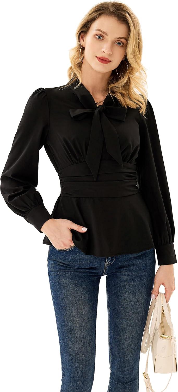GRACE KARIN Women’s 2025 Long Sleeve Peplum Dressy Shirt Office Bow Tie Work Blouses Tops Smocked Waist(Black)