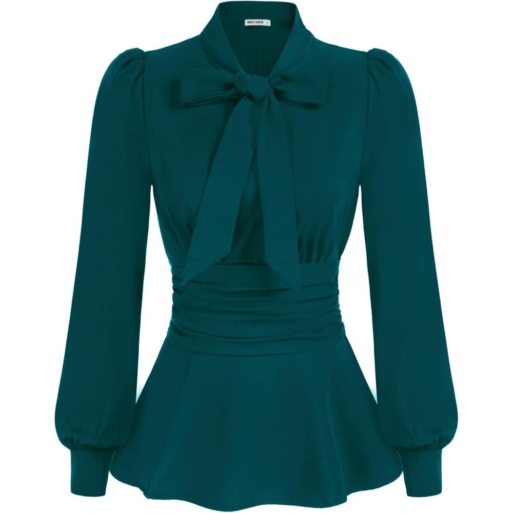 GRACE KARIN Women's 2025 Long Sleeve Peplum Dressy Shirt Office Bow Tie Work Blouses Tops Smocked Waist(Blue-green)