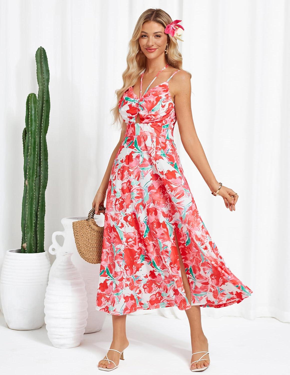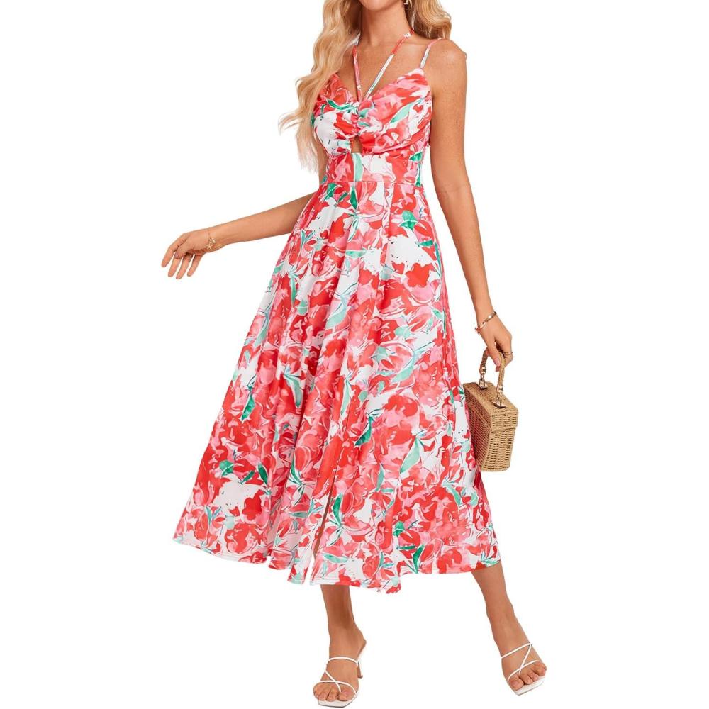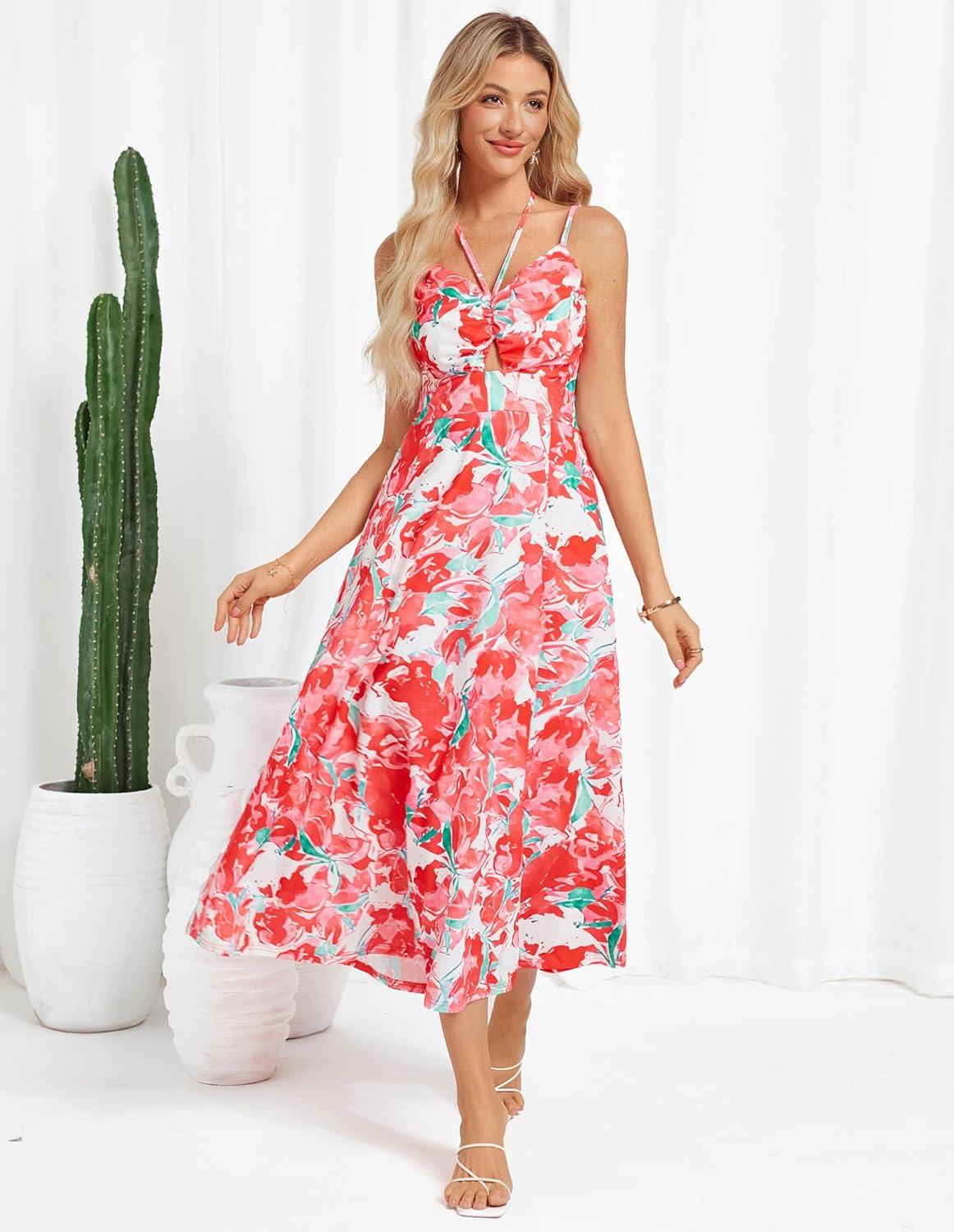 GRACE KARIN Womens 2025 Summer Beach Dress Boho Floral Dresses Spaghetti Strap Halter V Neck Flowy Maxi Long Sundress(Red Green Floral)