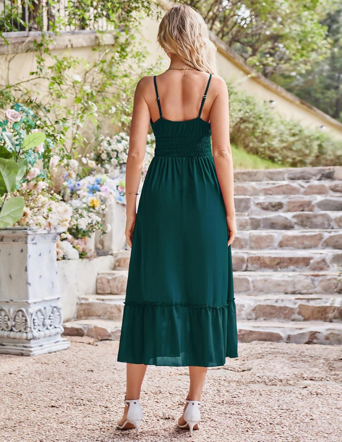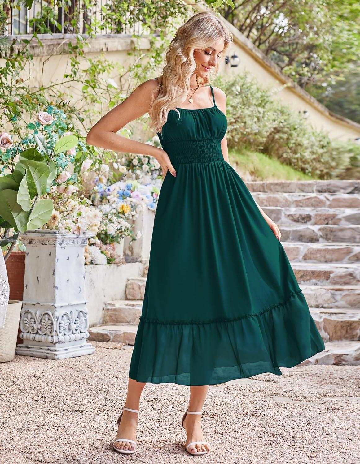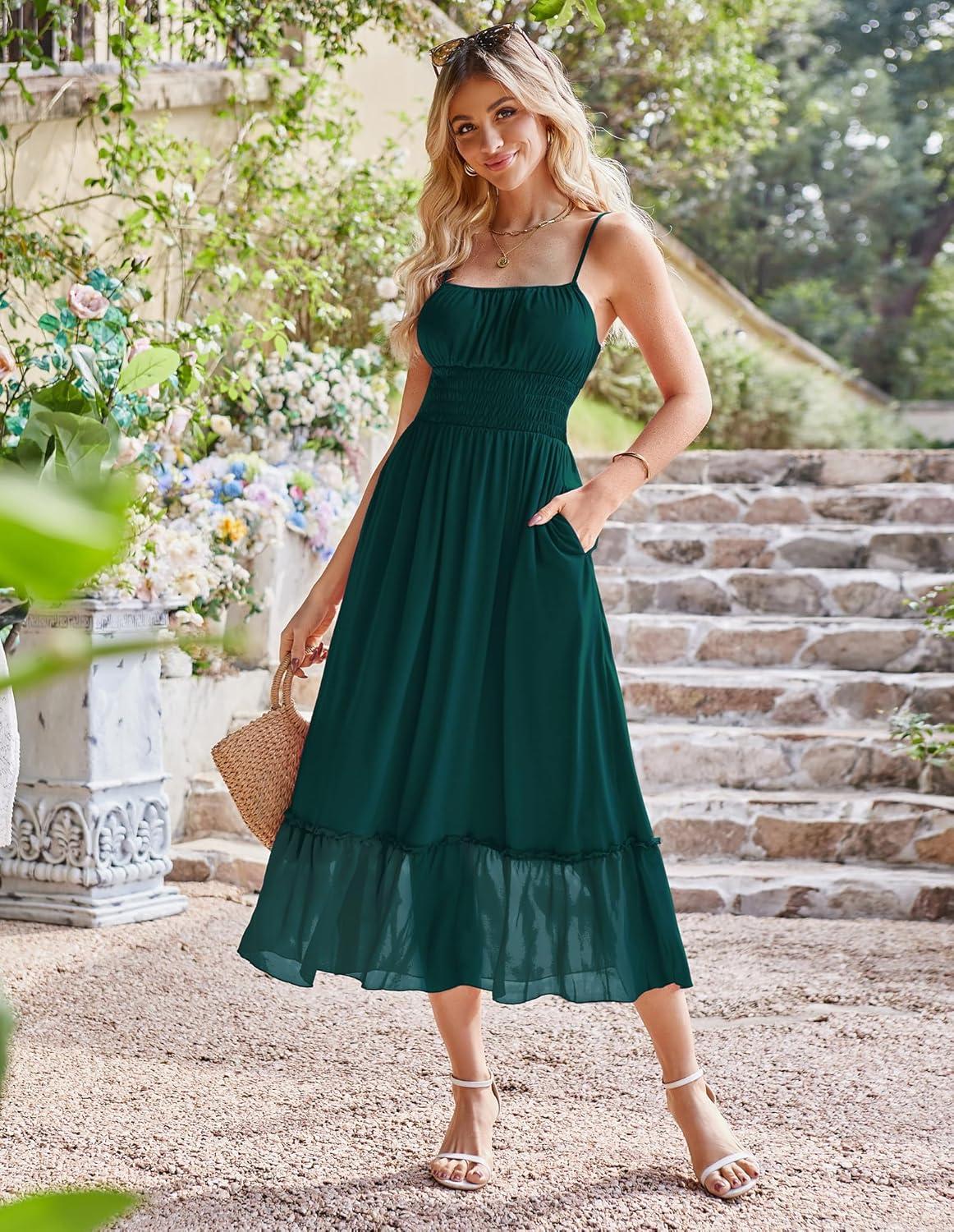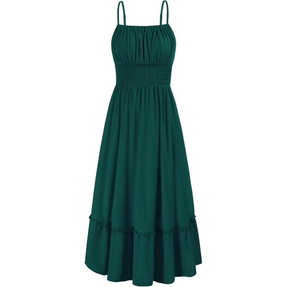 GRACE KARIN Womens 2025 Summer Dress Casual Sleeveless Spaghetti Strap Smocked Ruffle Beach Long Maxi Dress with Pockets(Green)