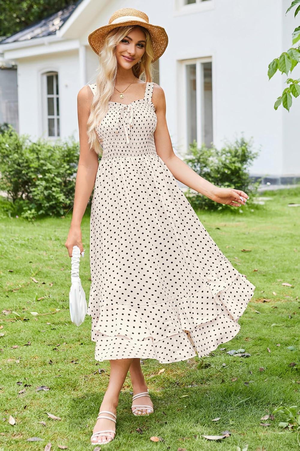 GRACE KARIN Women’s 2025 Summer Floral Boho Dress Square Neck Strapped Swing A Line Beach Long Maxi Outfits Clothes(Black Dot)