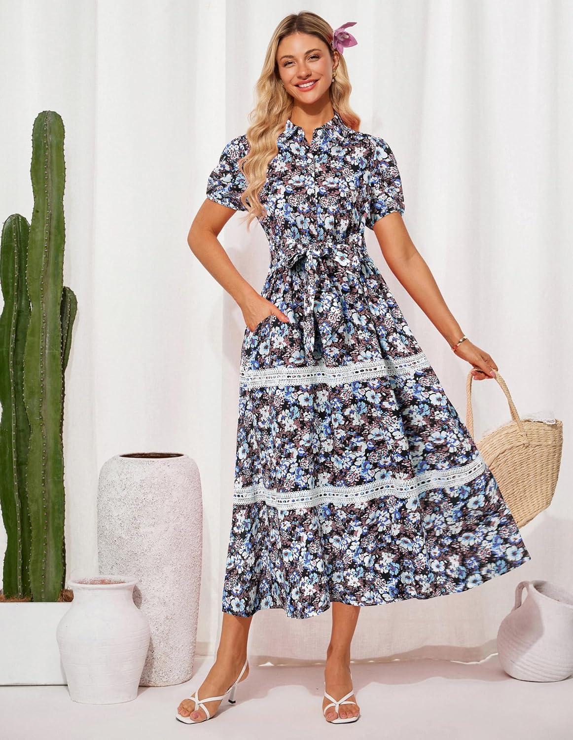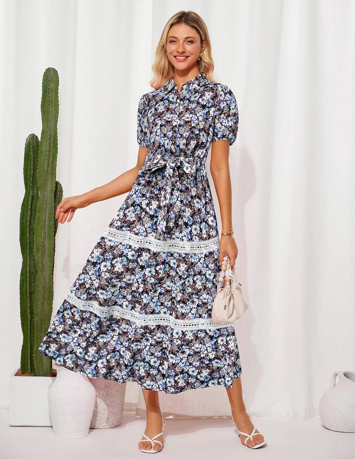 imageGRACE KARIN Womens 2025 Summer Floral Flowy Dresses Boho Tie Belt Short Puff Sleeve A Line Maxi Shirt Dress with PocketBlack Blue