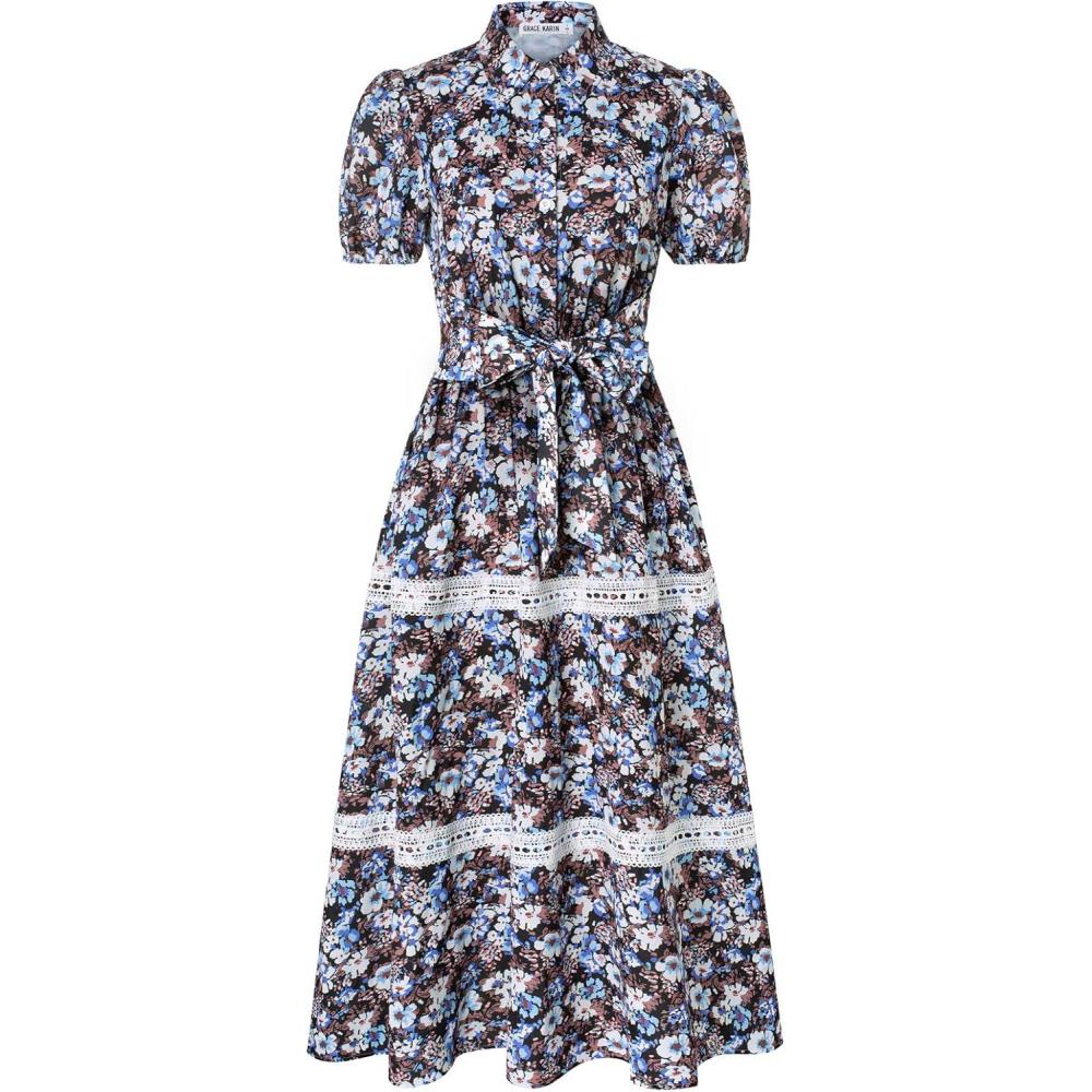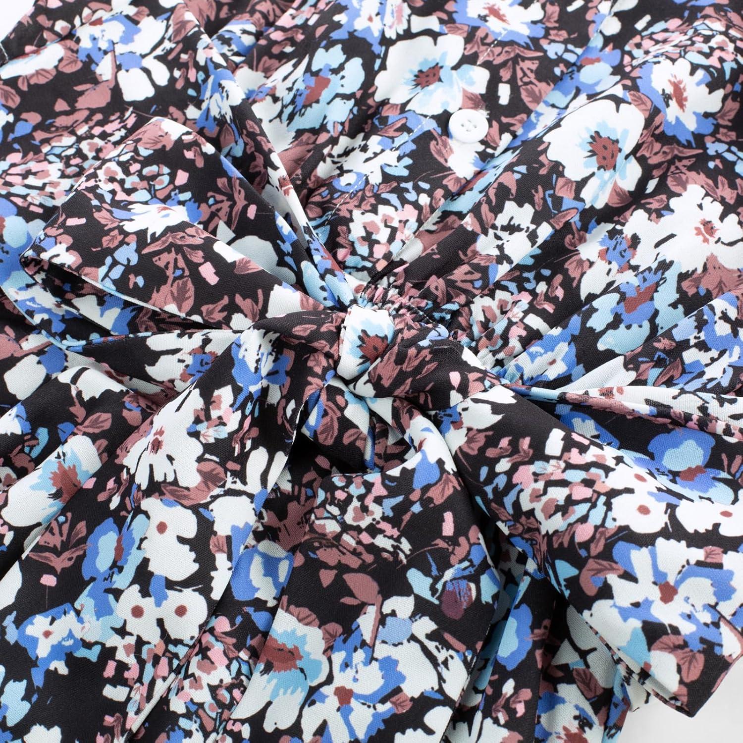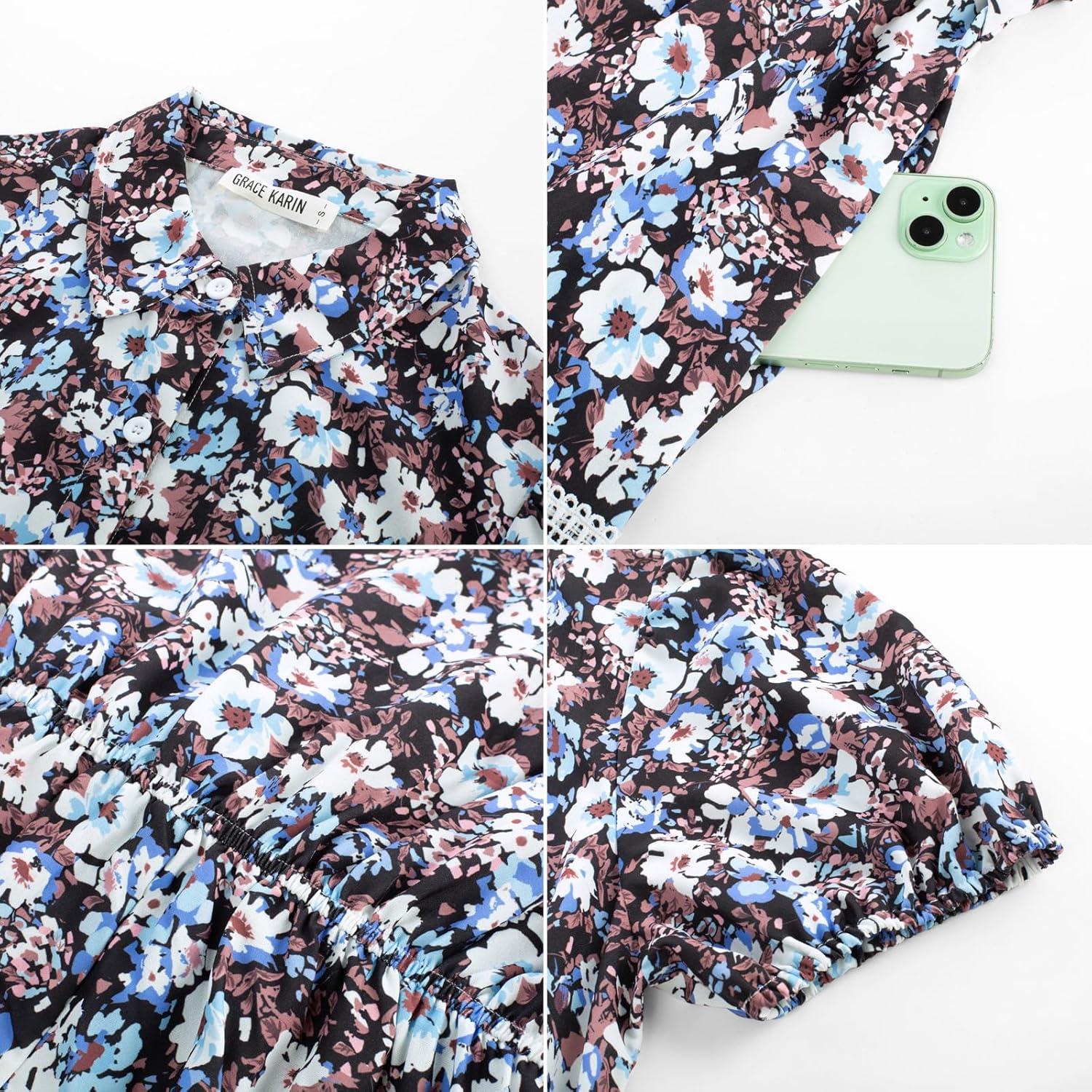 GRACE KARIN Women's 2025 Summer Floral Flowy Dresses Boho Tie Belt Short Puff Sleeve A Line Maxi Shirt Dress with Pocket(Black Blue)