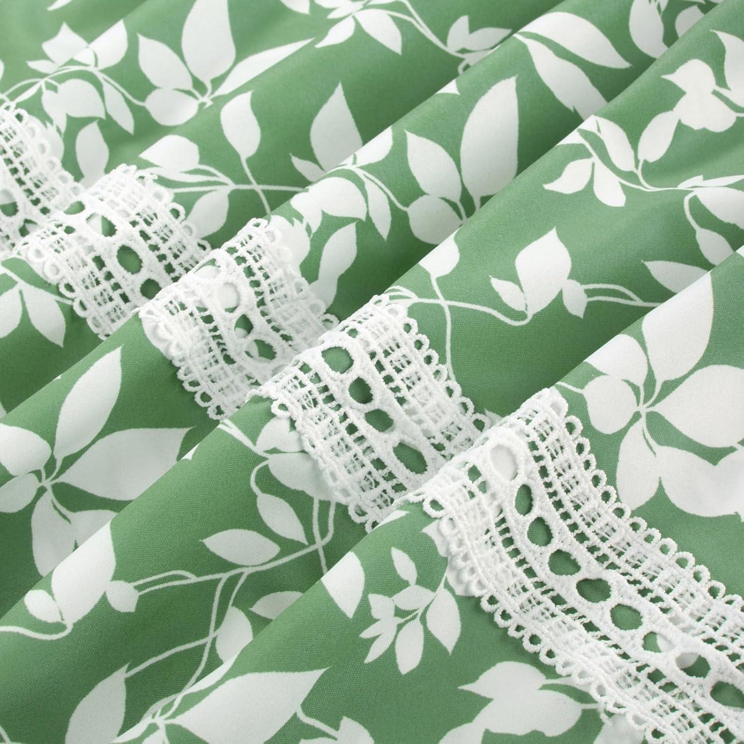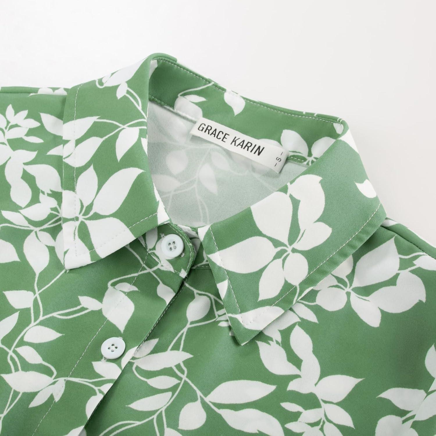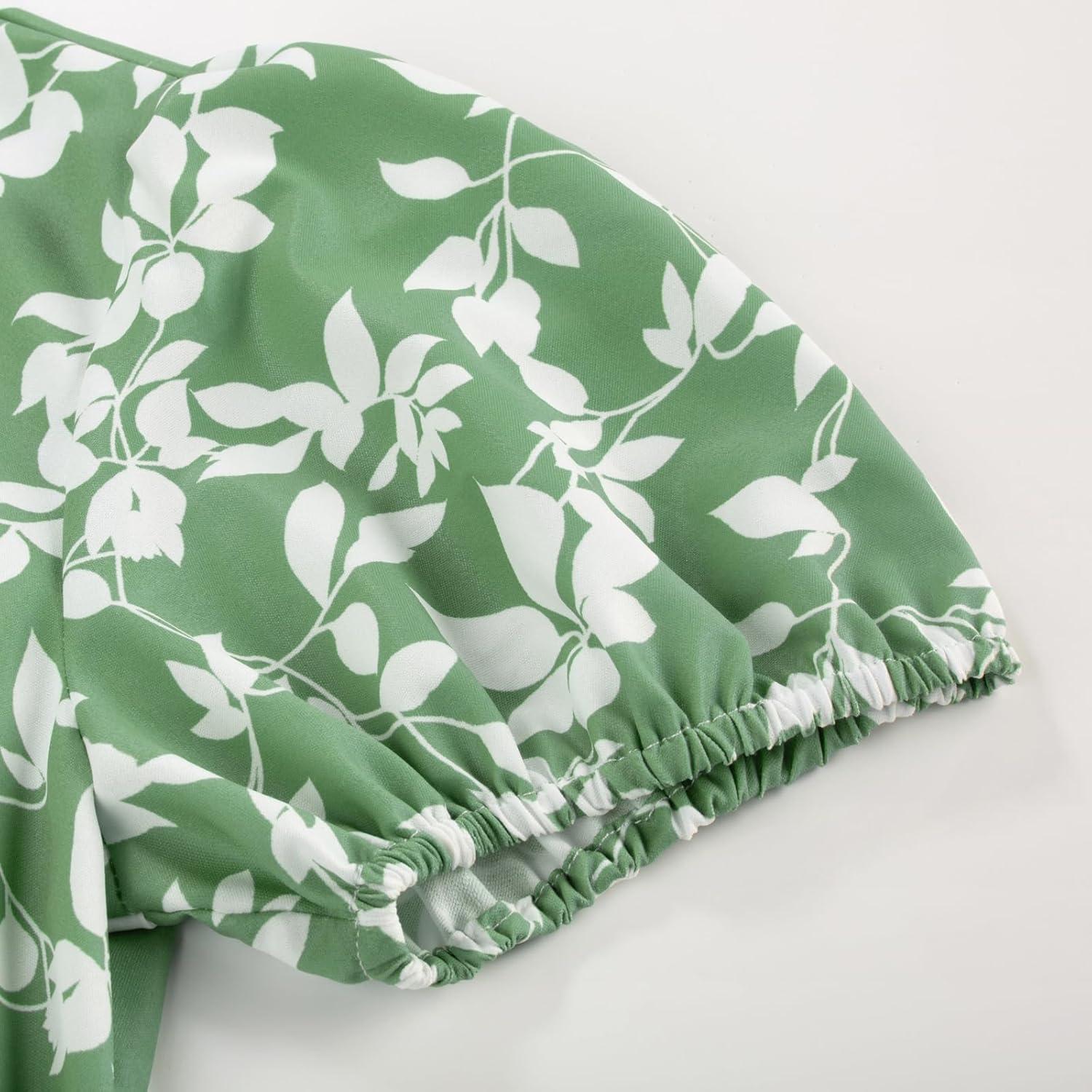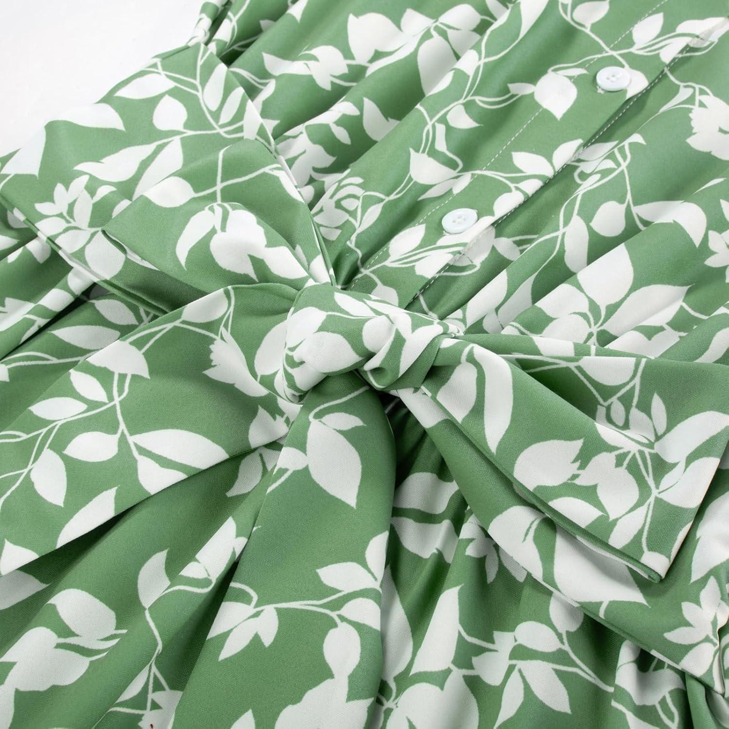 GRACE KARIN Women's 2025 Summer Floral Flowy Dresses Boho Tie Belt Short Puff Sleeve A Line Maxi Shirt Dress with Pocket(Green White Leaf)