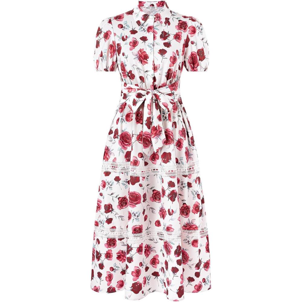imageGRACE KARIN Womens 2025 Summer Floral Flowy Dresses Boho Tie Belt Short Puff Sleeve A Line Maxi Shirt Dress with PocketRose