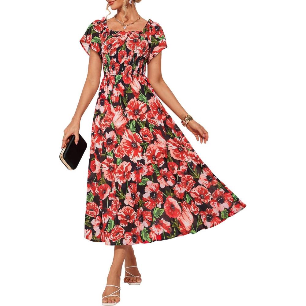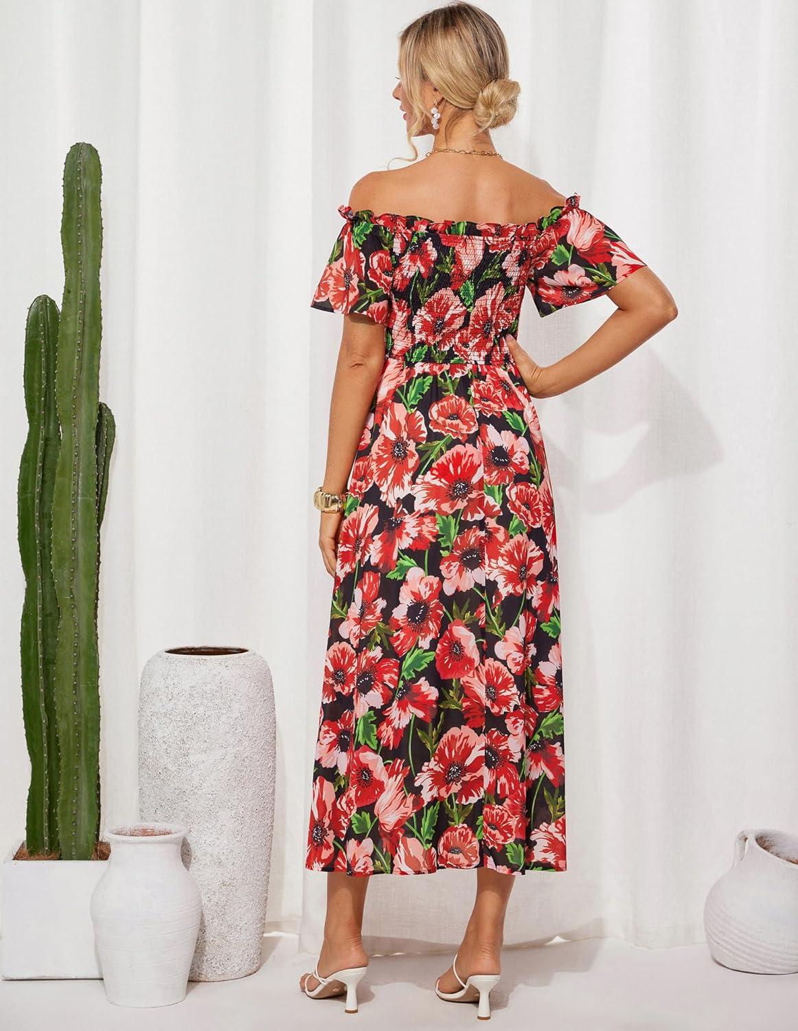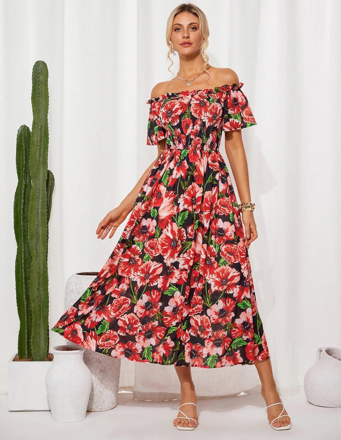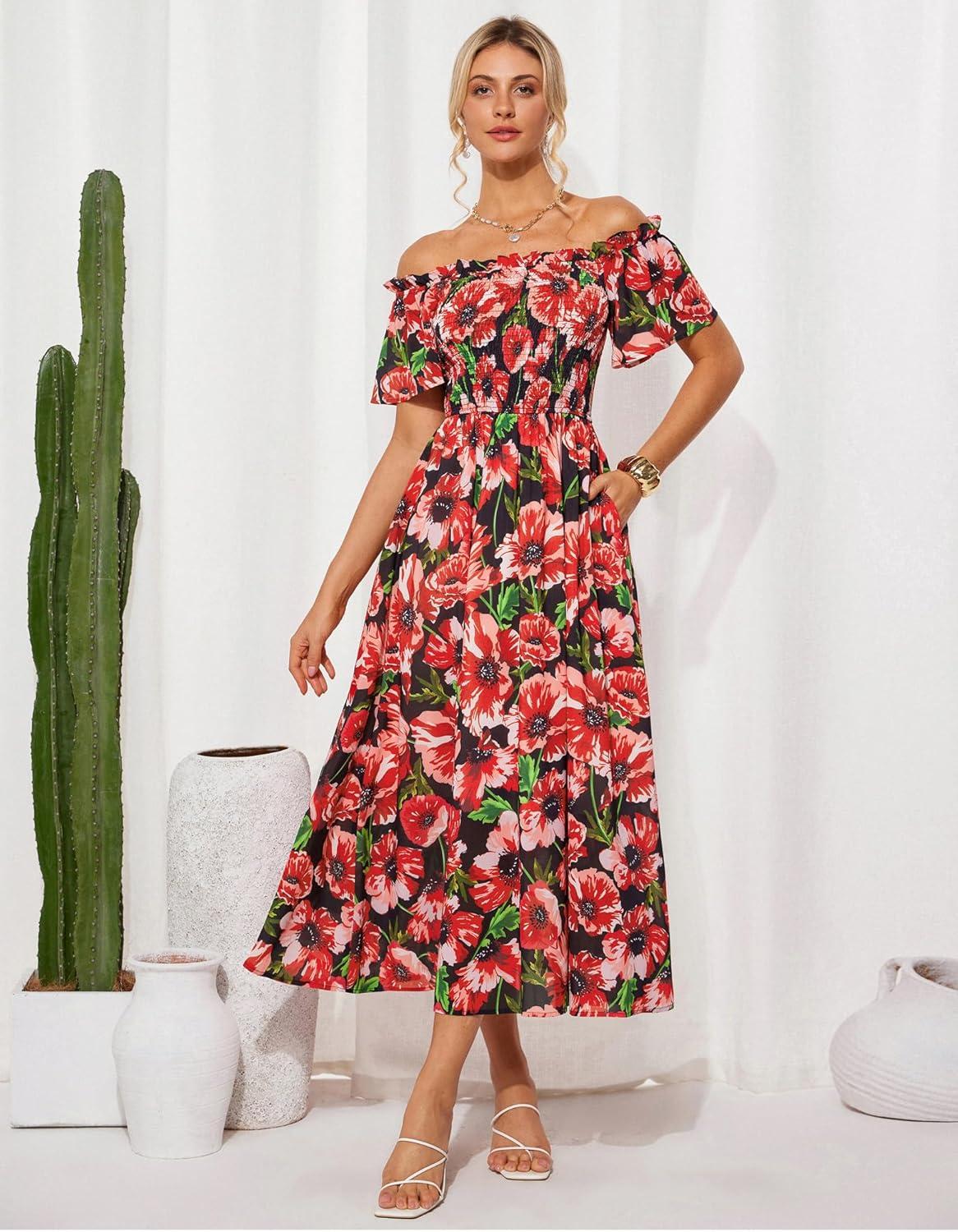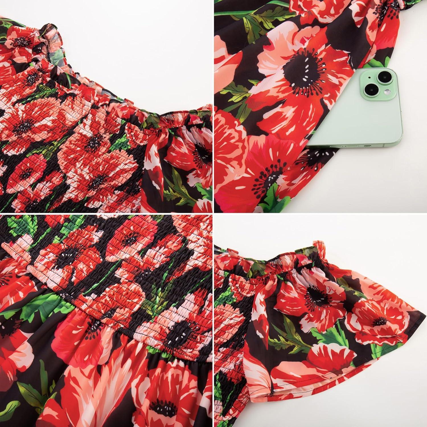 Be the first to review “GRACE KARIN Women’s 2025 Summer Floral Smocked Off Shoulder Flowy A Line Maxi Dresses Formal Wedding Guest Dress with Pockets(Black Red)” Cancel reply