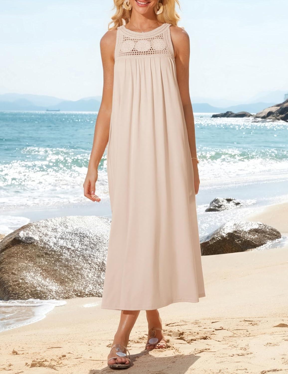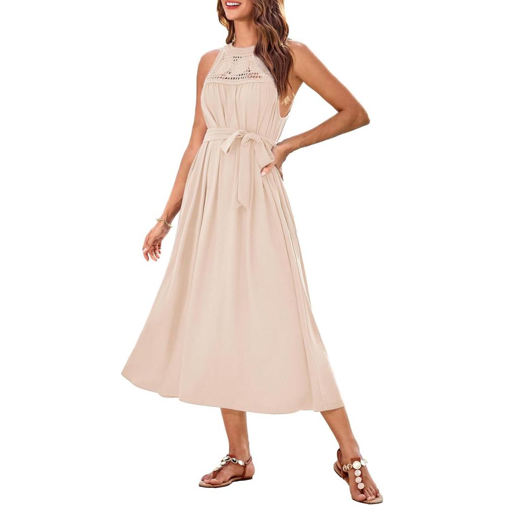 Get more for your money with our exclusive bundle deals on GRACE KARIN Women’s 2025 Summer Hollow Out Halter Dresses Casual Swing A-Line Sundress Beach Vacation Maxi Dress with Belt(Apricot) and accessories.