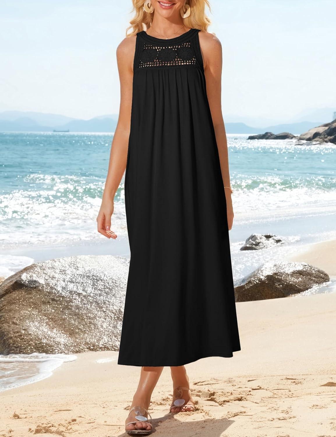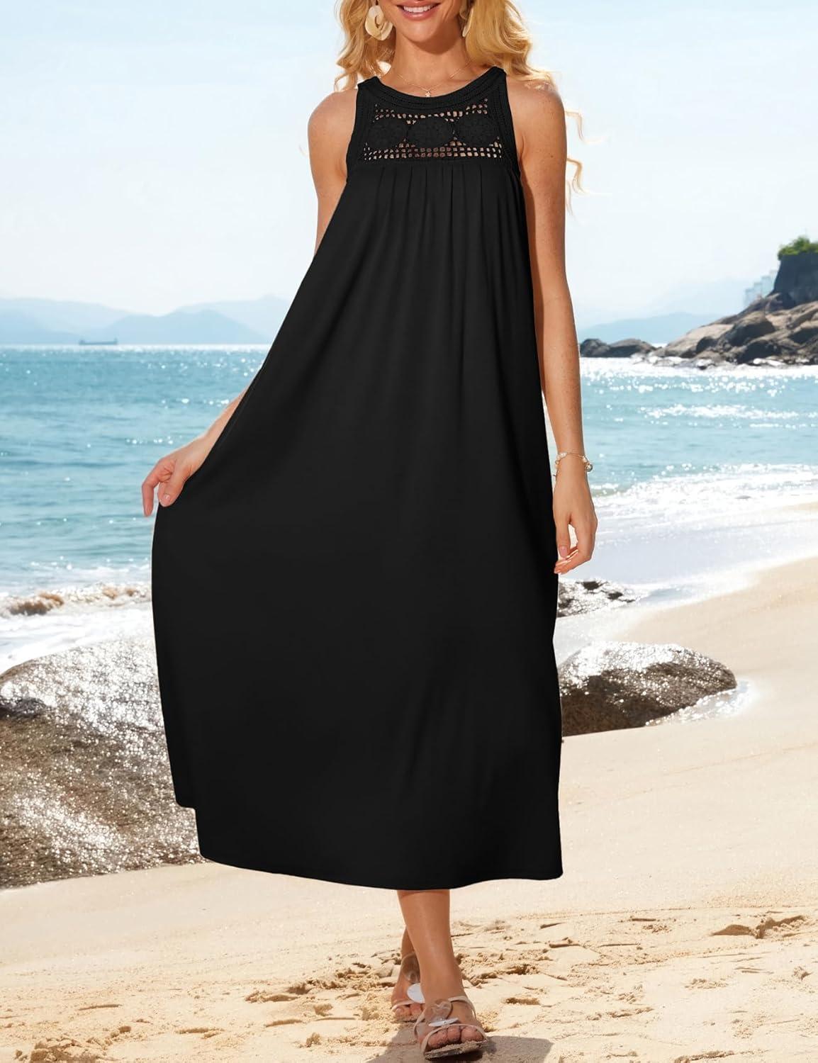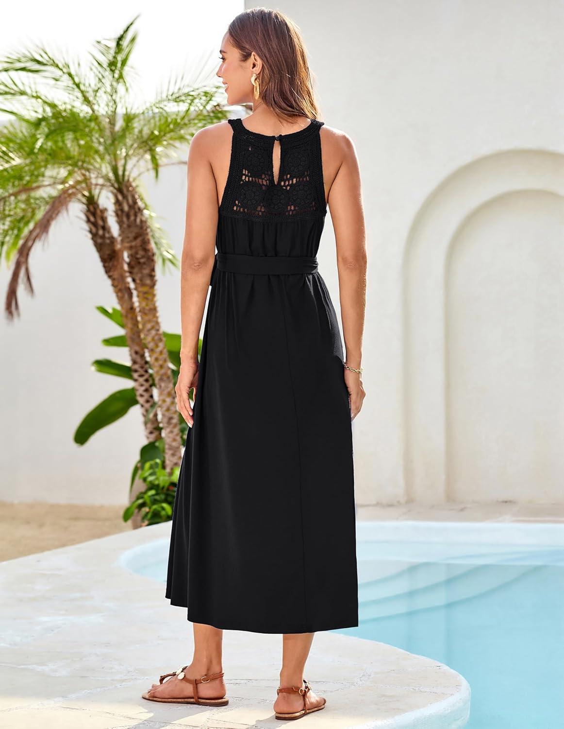 GRACE KARIN Women's 2025 Summer Hollow Out Halter Dresses Casual Swing A-Line Sundress Beach Vacation Maxi Dress with Belt(Black)