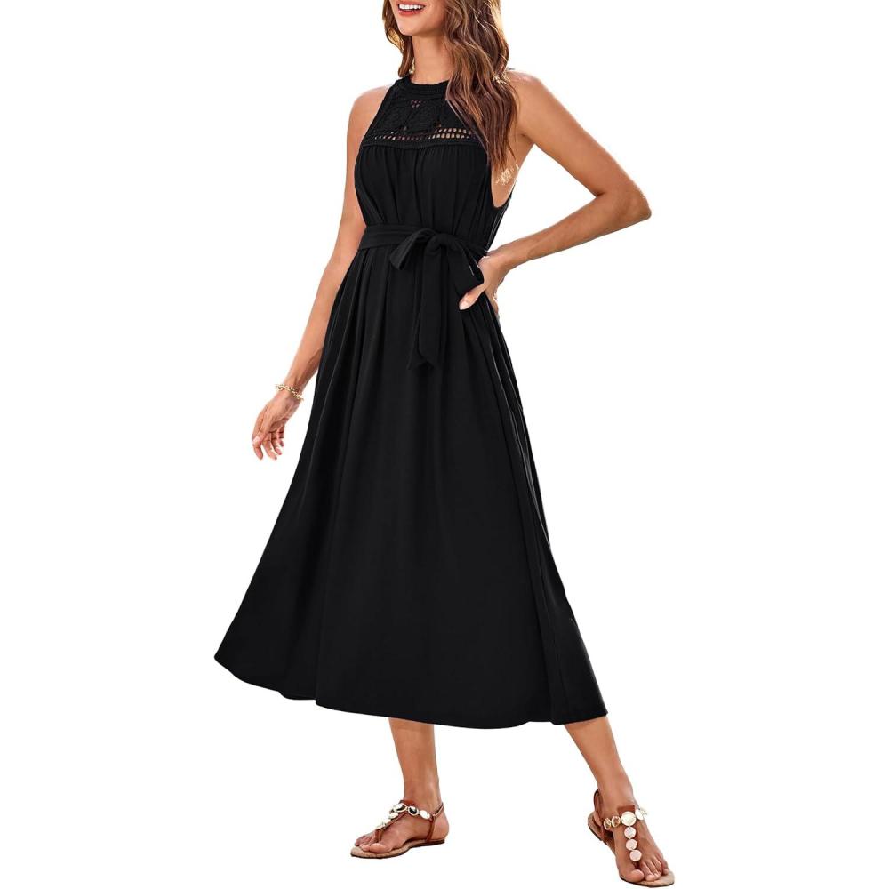 imageGRACE KARIN Womens 2025 Summer Hollow Out Halter Dresses Casual Swing ALine Sundress Beach Vacation Maxi Dress with BeltBlack