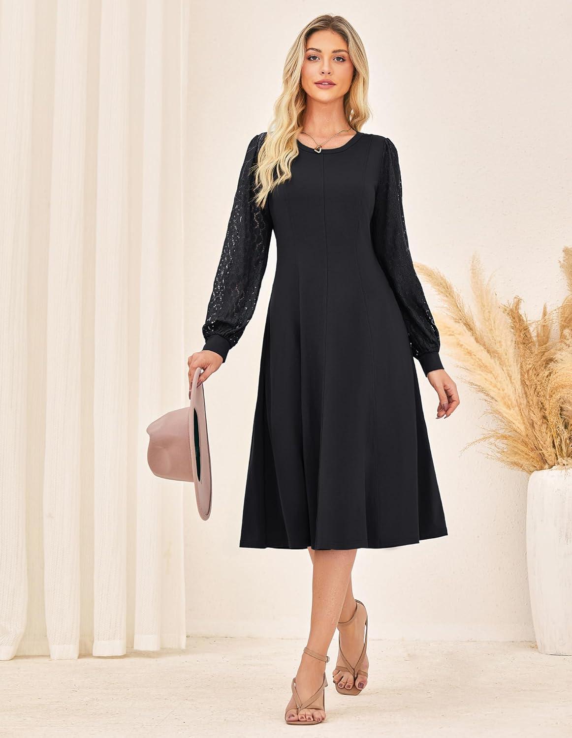 GRACE KARIN Women's 2025 Summer Long Lace Sleeve Dresses Crewneck Pleated A Line Flowy Casual Midi Dresses with Pockets(Black)