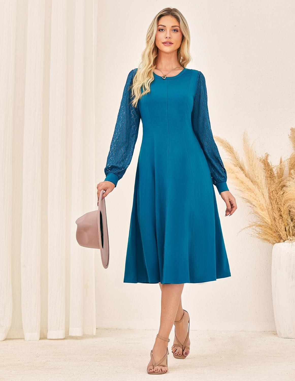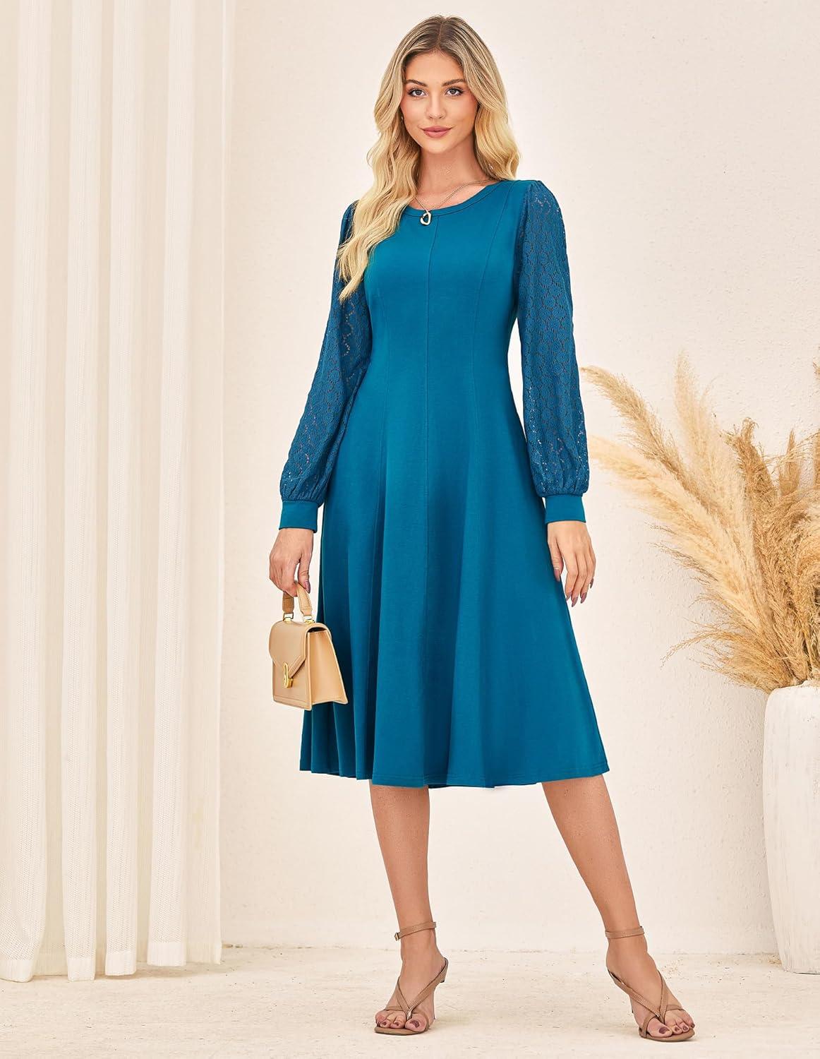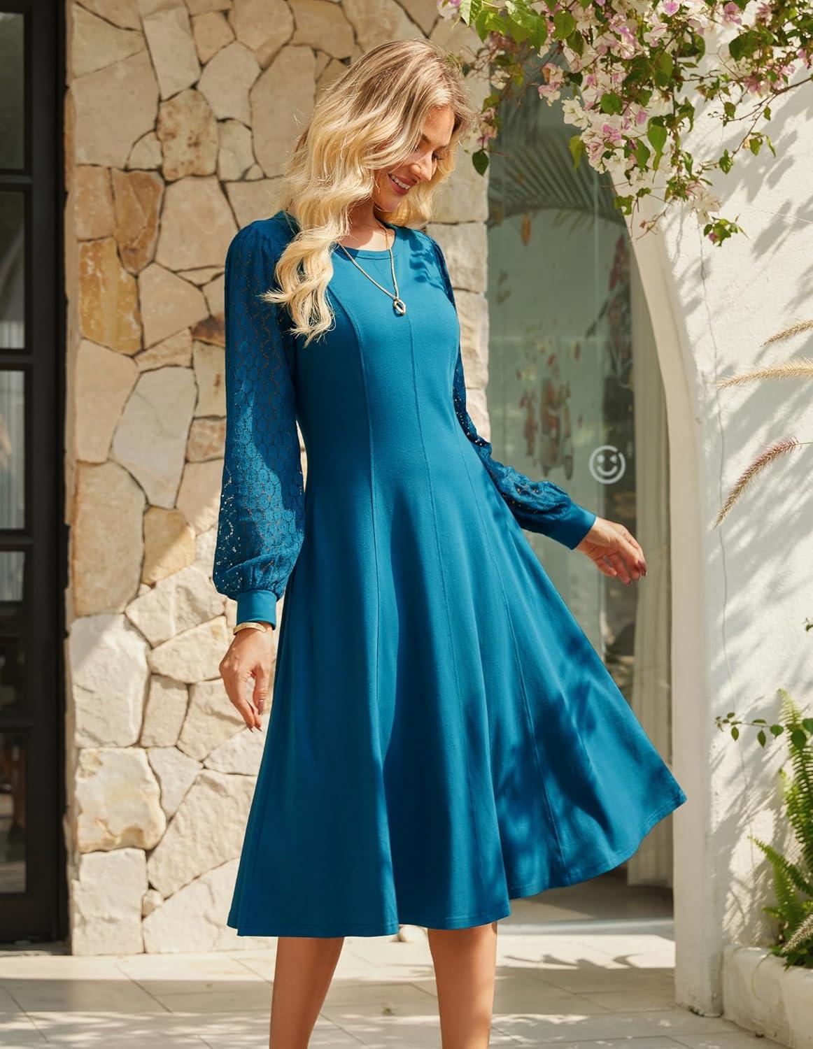 GRACE KARIN Women's 2025 Summer Long Lace Sleeve Dresses Crewneck Pleated A Line Flowy Casual Midi Dresses with Pockets(Peacock Blue)