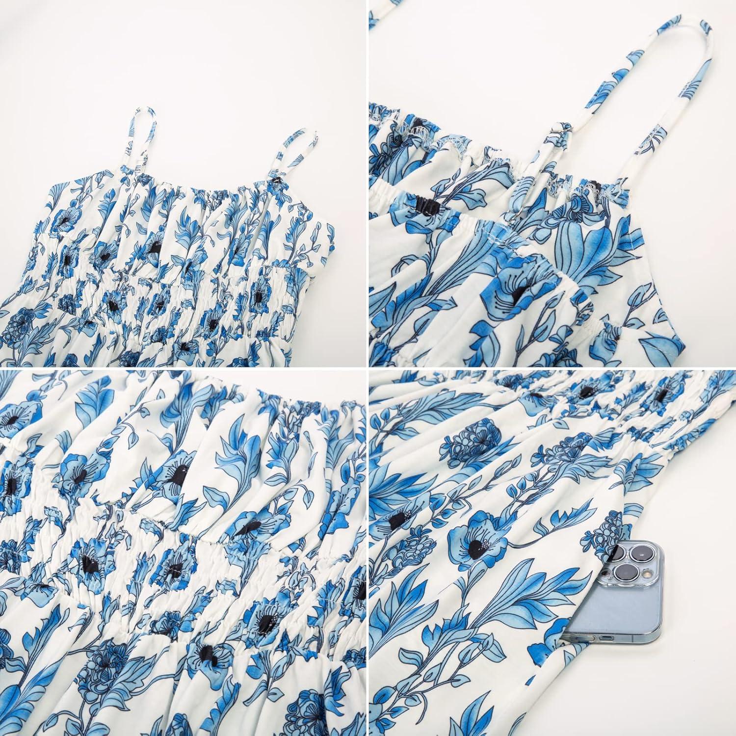 GRACE KARIN Womens 2025 Summer Maxi Dress Sleeveless Floral Spaghetti Strap Smocked Boho Beach Long Dress with Pockets(Blue Floral)