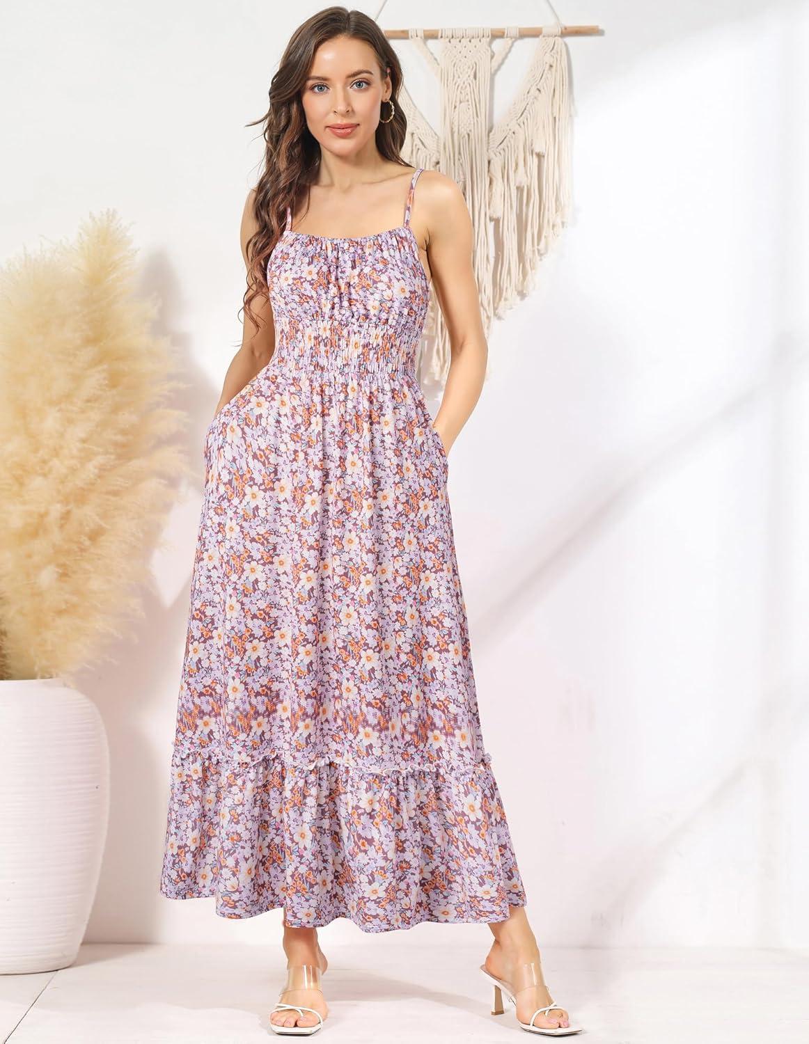 imageGRACE KARIN Womens 2025 Summer Maxi Dress Sleeveless Floral Spaghetti Strap Smocked Boho Beach Long Dress with PocketsPurple Floral