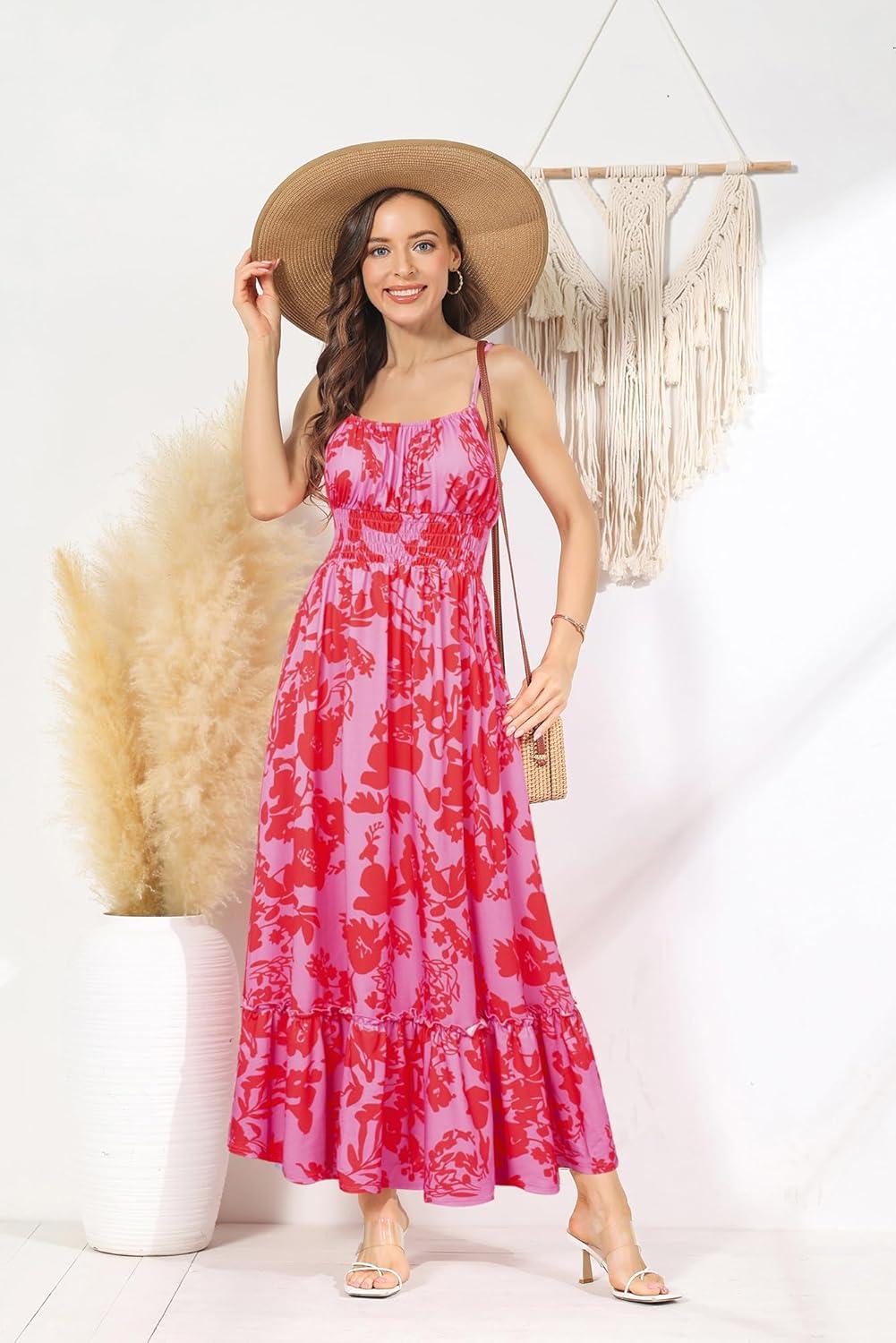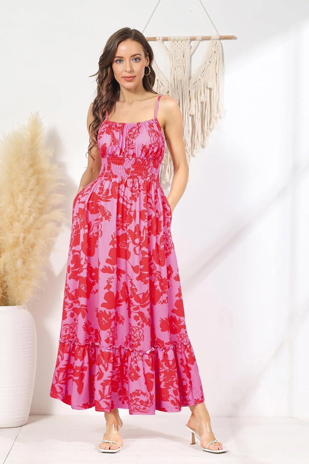 GRACE KARIN Womens 2025 Summer Maxi Dress Sleeveless Floral Spaghetti Strap Smocked Boho Beach Long Dress with Pockets(Purple Red Floral)