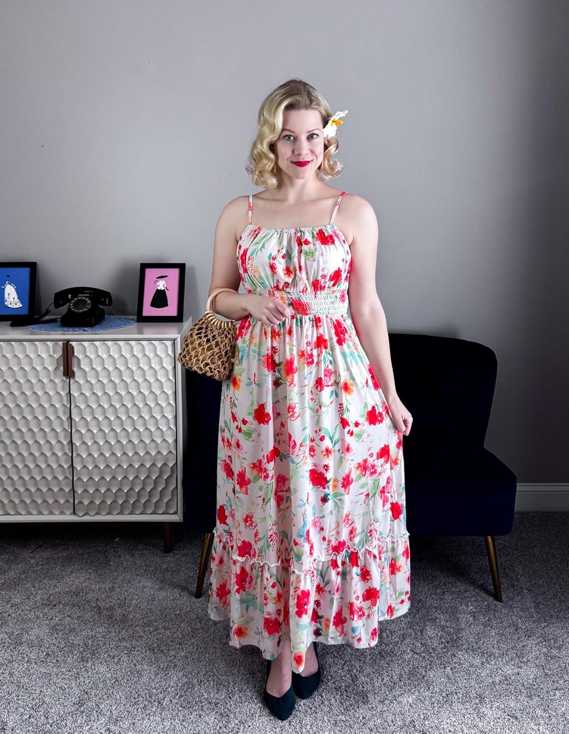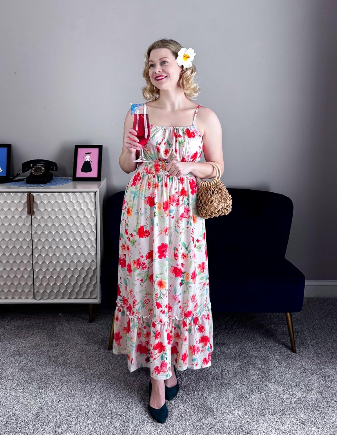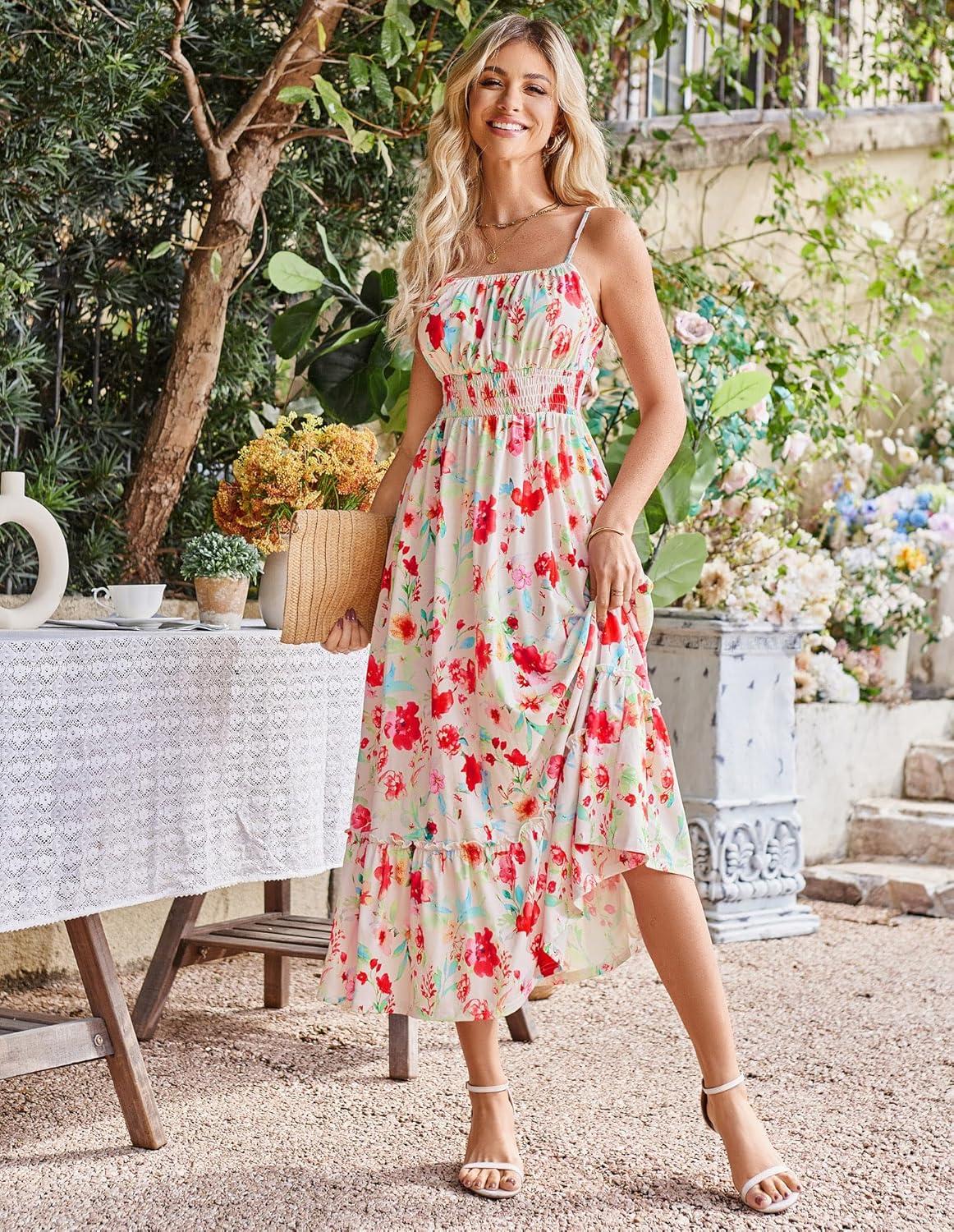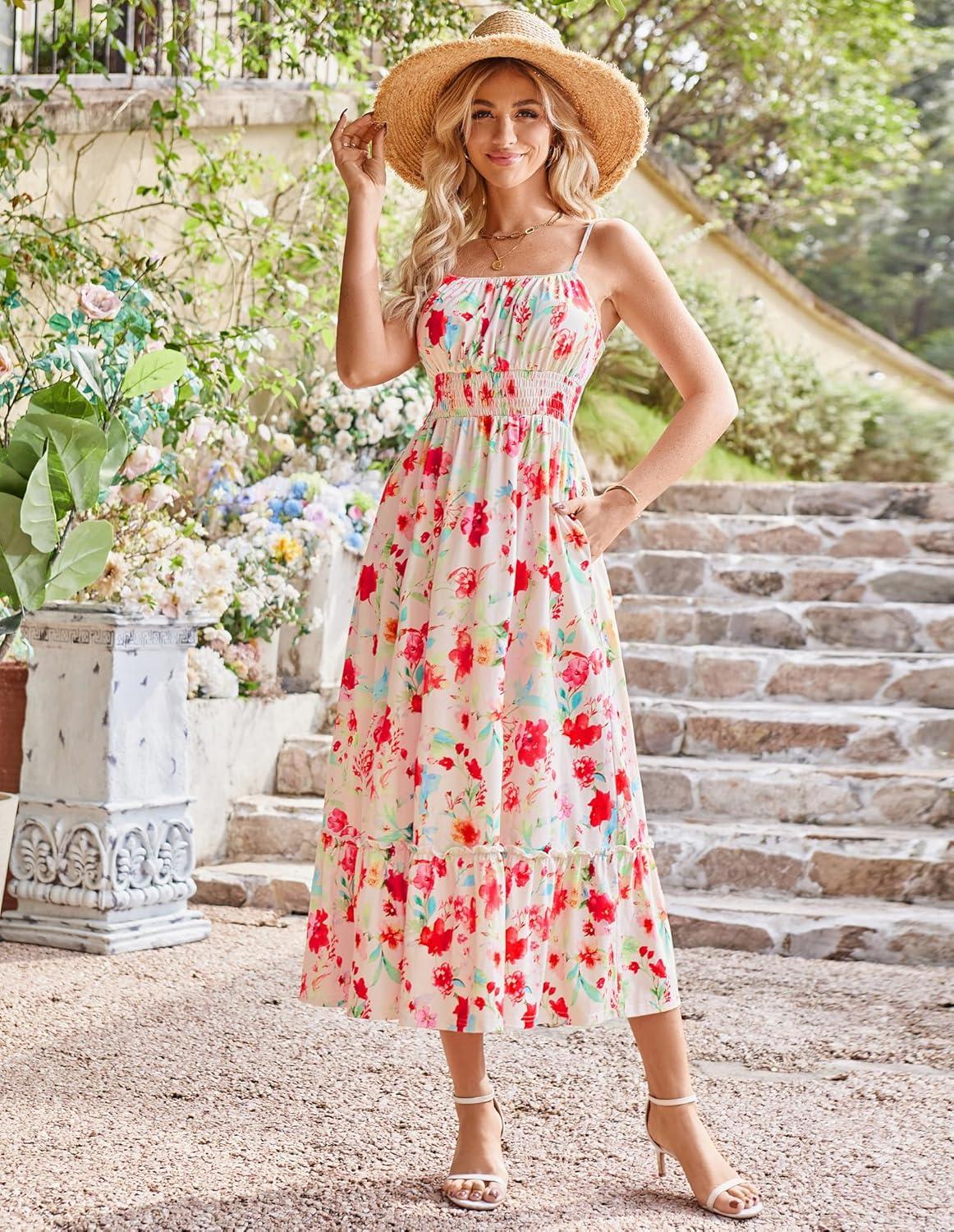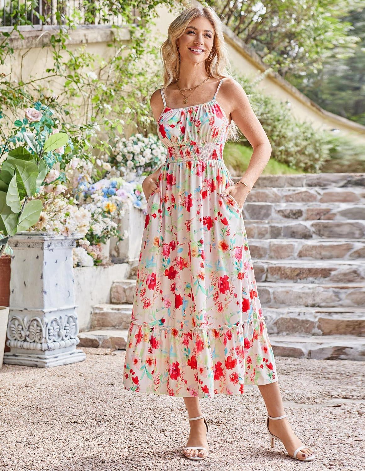 GRACE KARIN Womens 2025 Summer Maxi Dress Sleeveless Floral Spaghetti Strap Smocked Boho Beach Long Dress with Pockets(Red White Floral)
