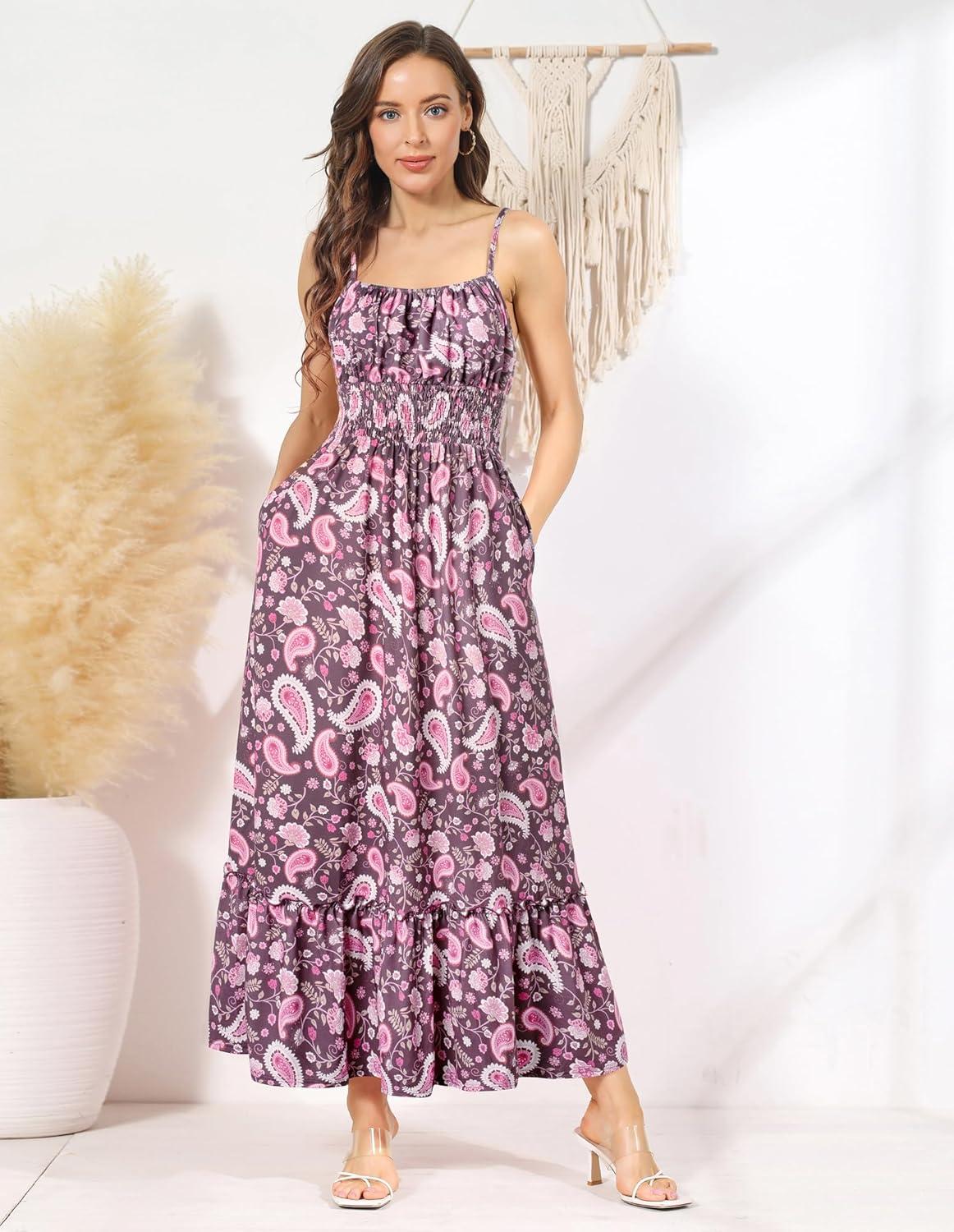 GRACE KARIN Womens 2025 Summer Maxi Dress Sleeveless Floral Spaghetti Strap Smocked Boho Beach Long Dress with Pockets(Wine Red Paisley)