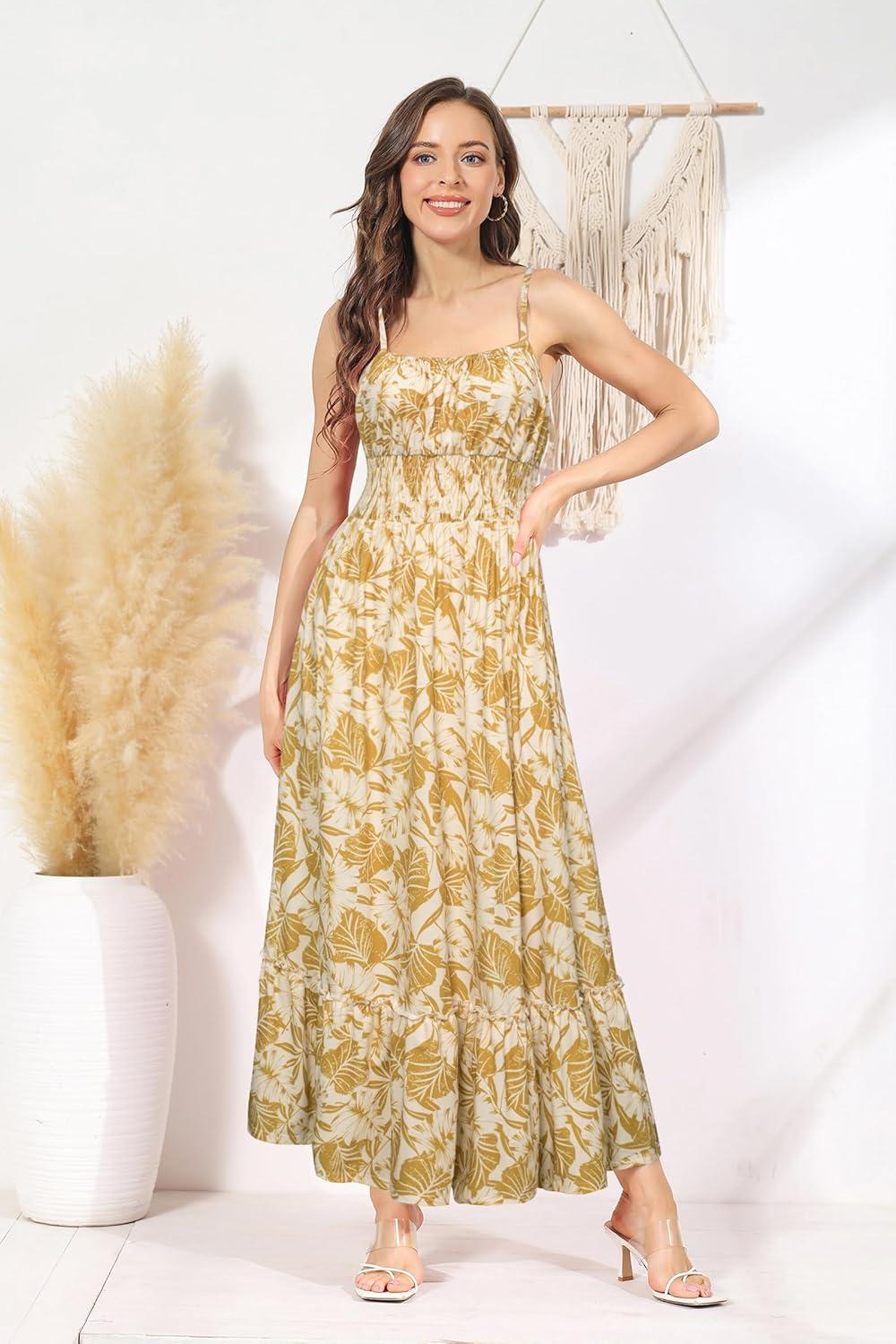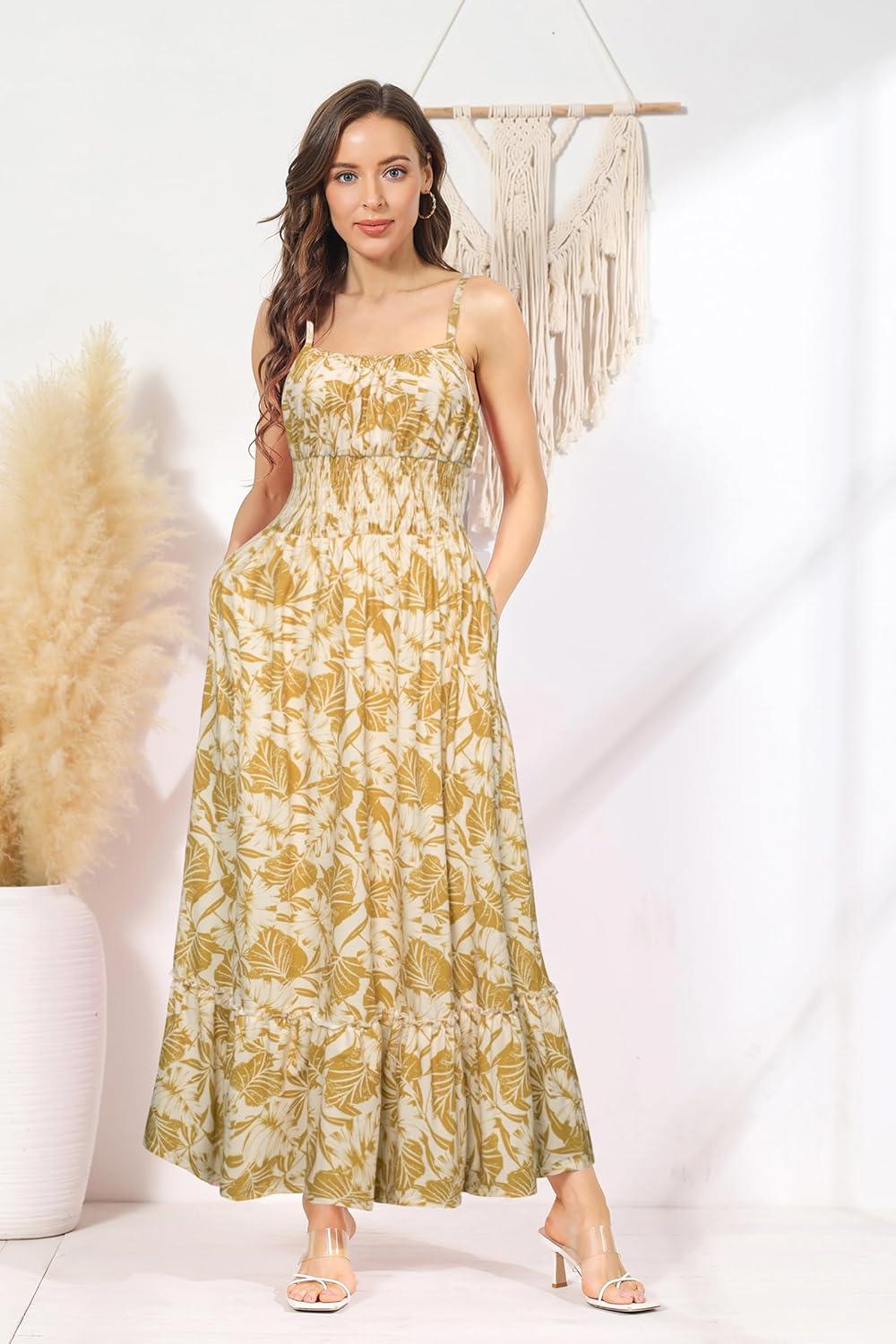 GRACE KARIN Womens 2025 Summer Maxi Dress Sleeveless Floral Spaghetti Strap Smocked Boho Beach Long Dress with Pockets(Yellow Leaves)