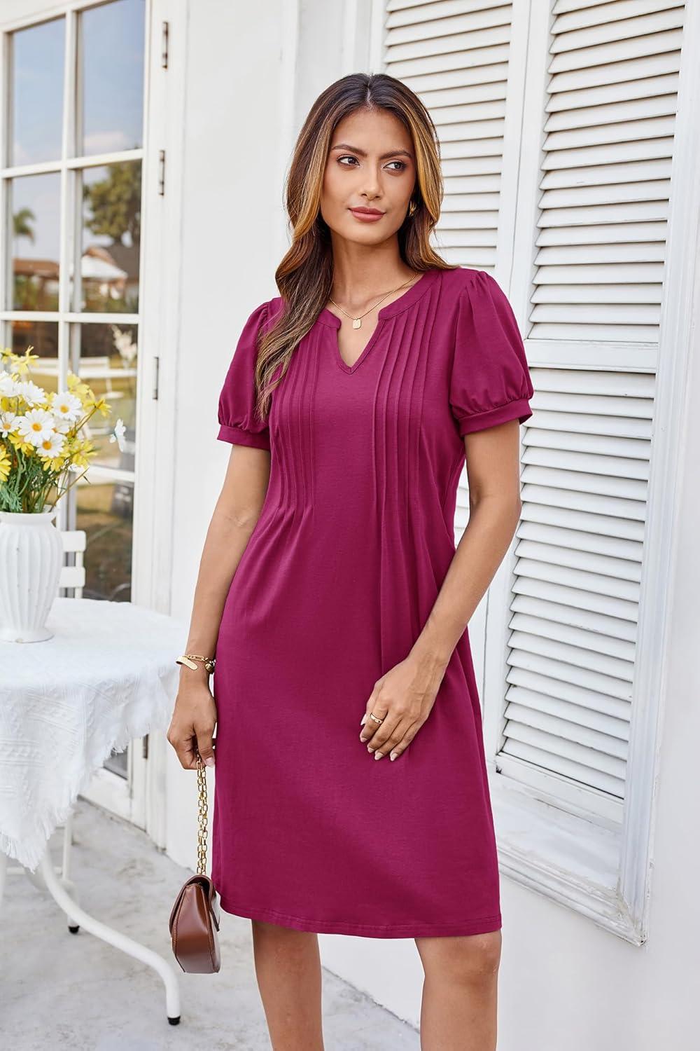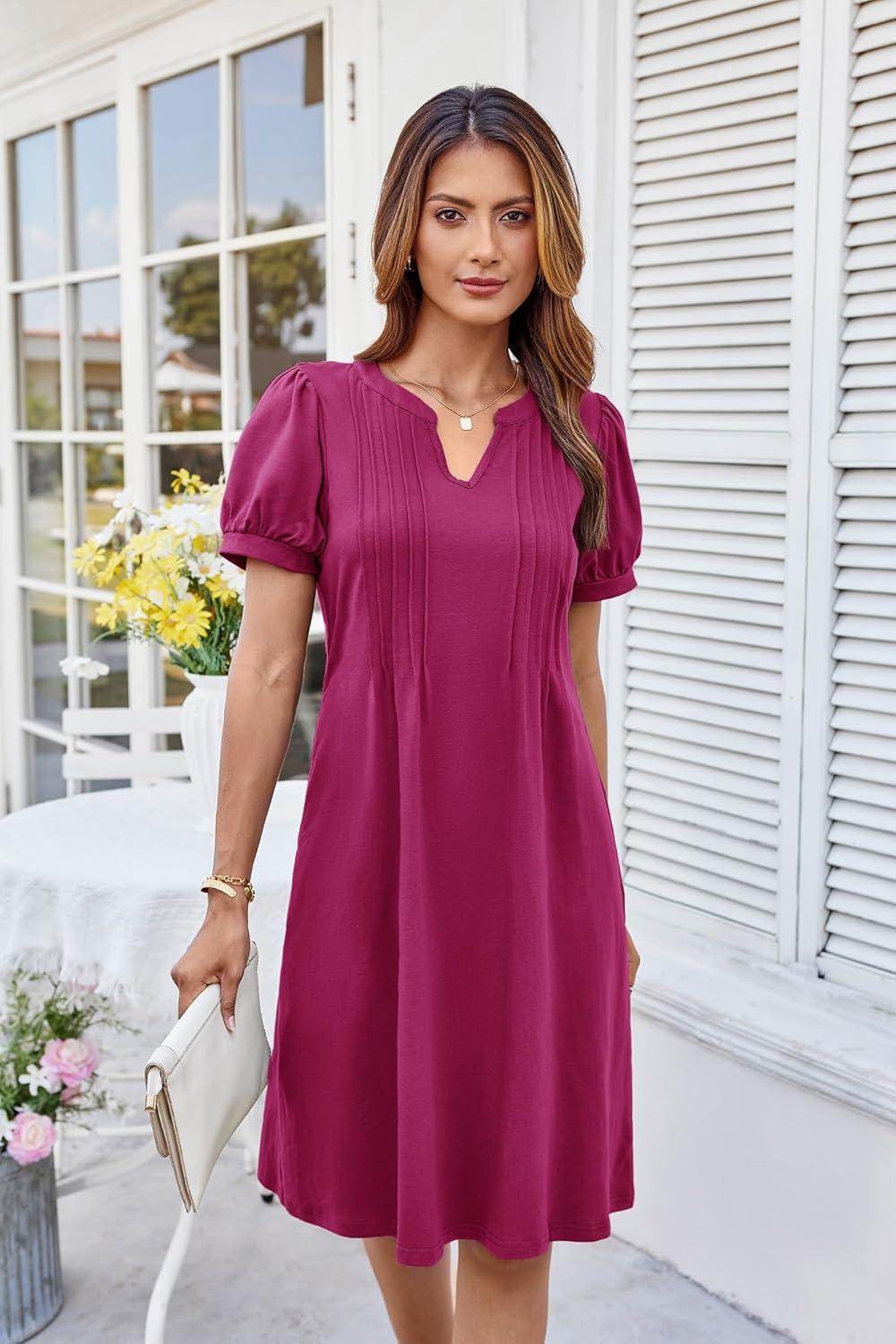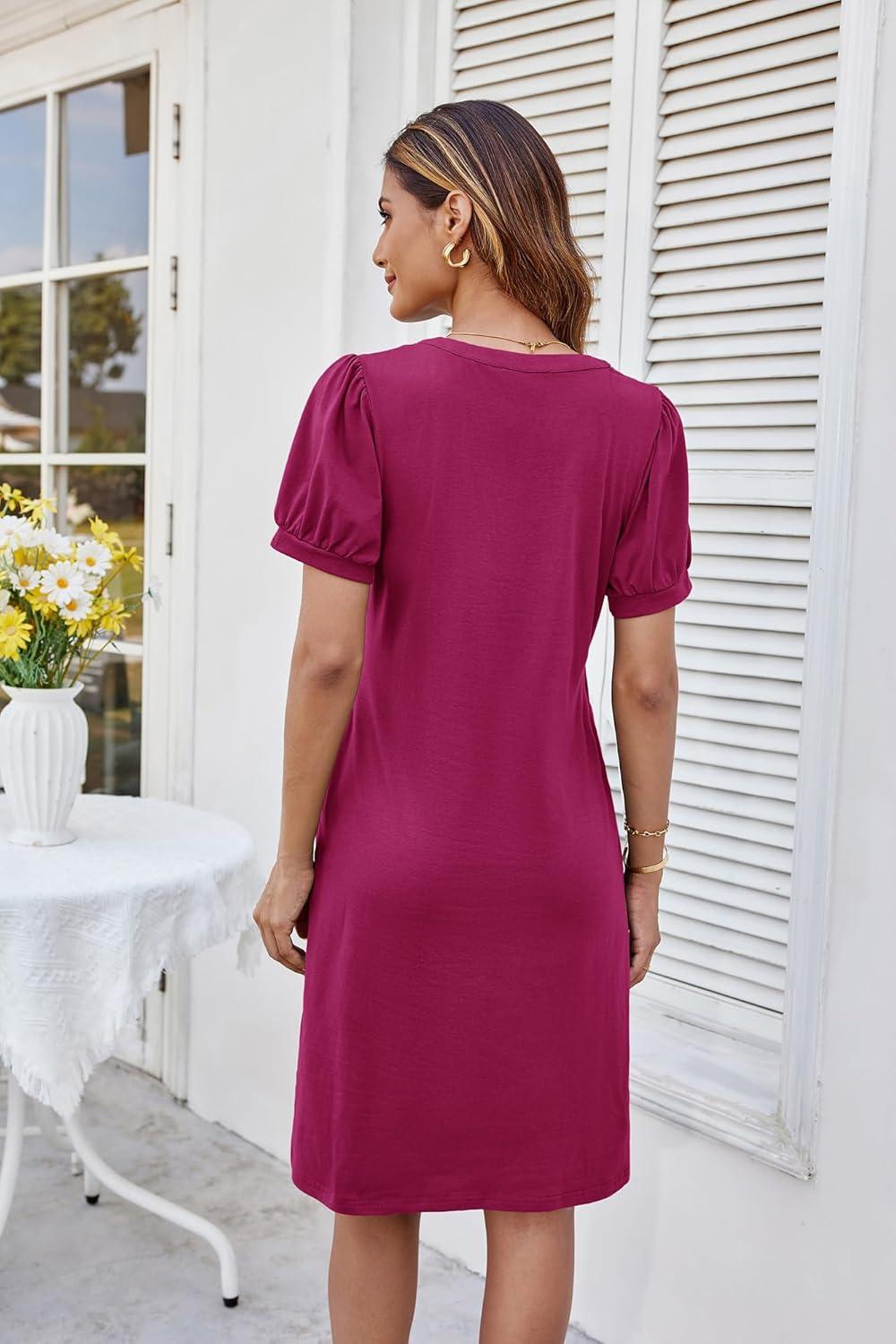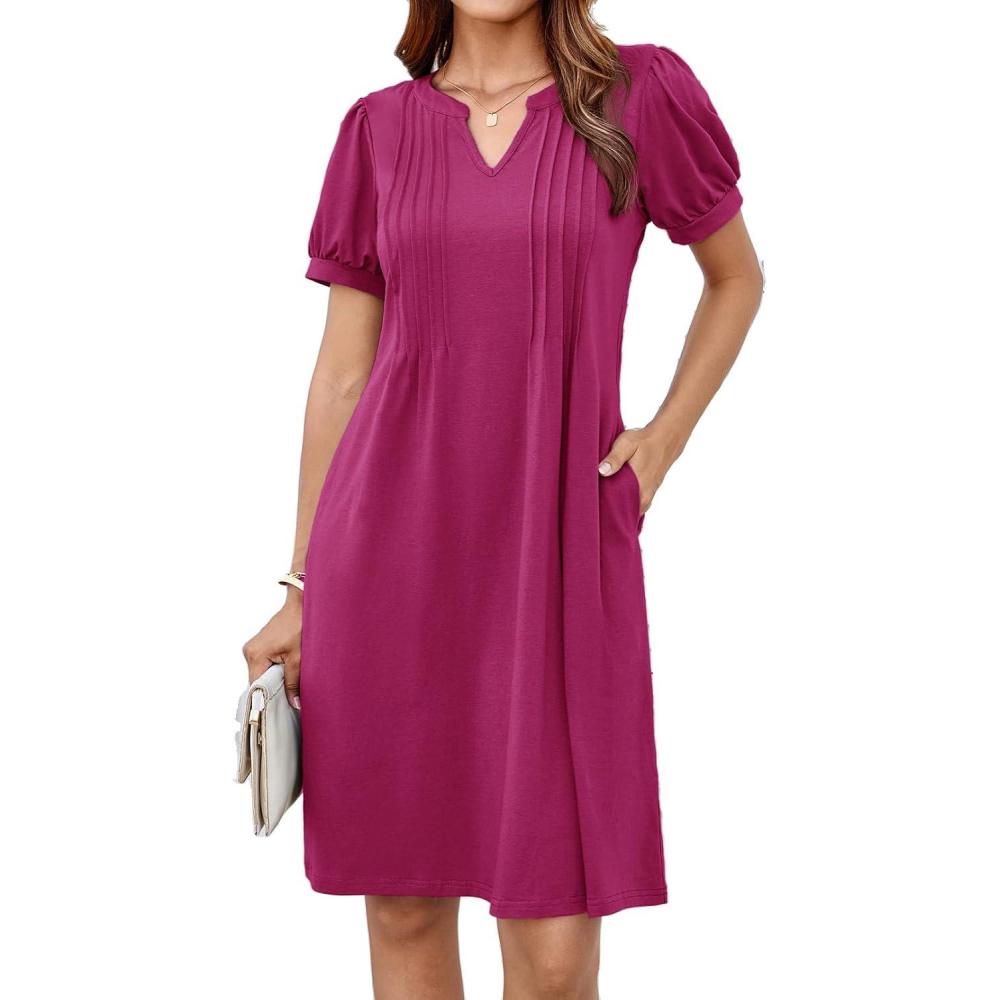 GRACE KARIN Women's 2025 V Neck Puff Short Sleeve T Shirt Dress Pleated Casual Loose Tunic Mini Dress(Rose Red)