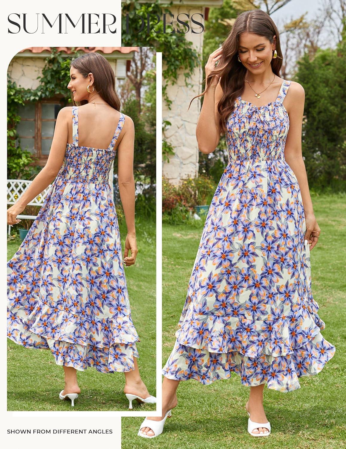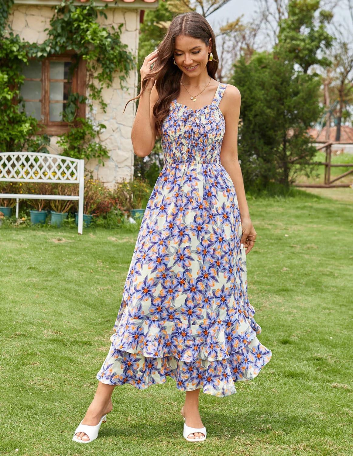 image:imageGRACE KARIN Womens 2026 Summer Floral Boho Dress Square Neck Strapped Swing A Line Sundress Beach Long Maxi OutfitsBlue Floral