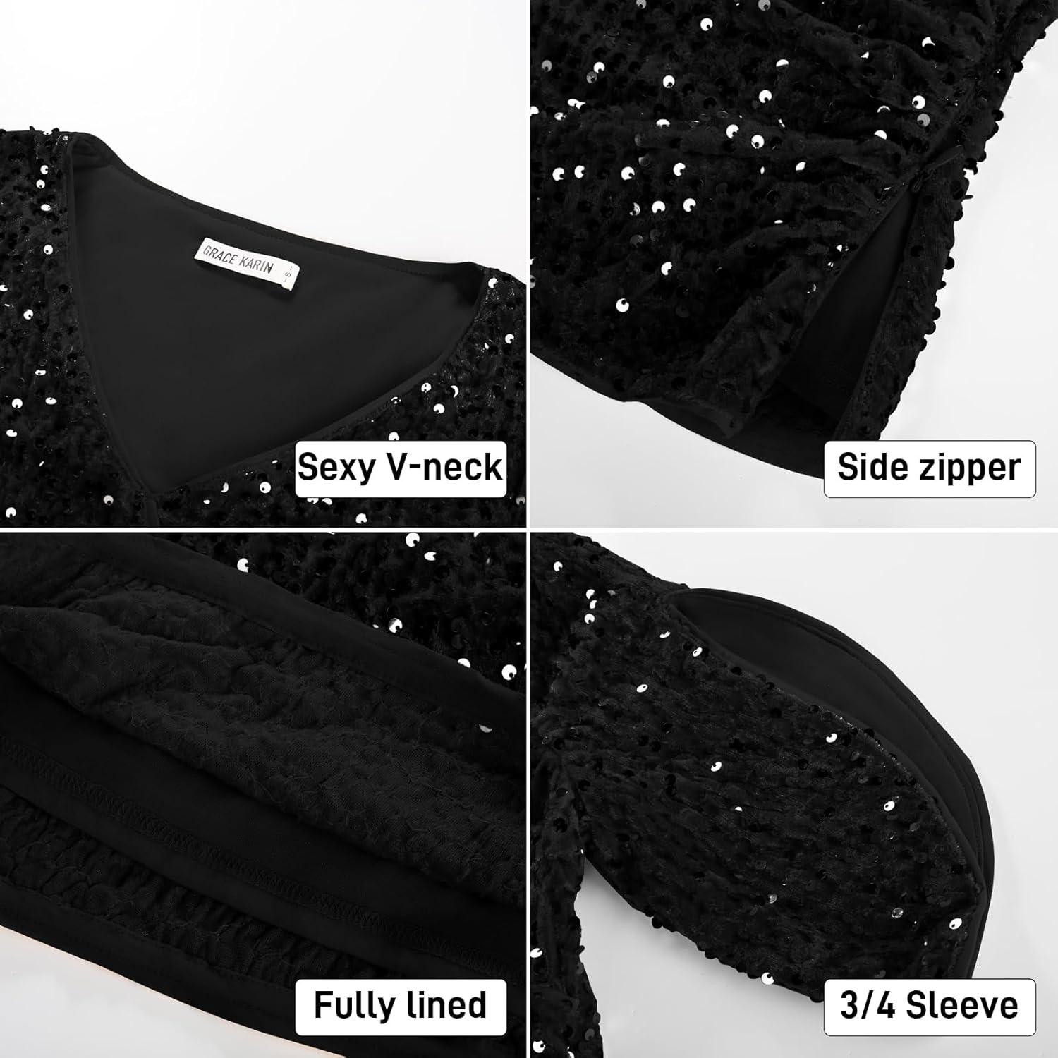 GRACE KARIN Womens 3/4 Length Sleeve Sequin Tops V Neck Velvet Ruched Blouses 2025 Glitter Trendy Party Outfit(Black)